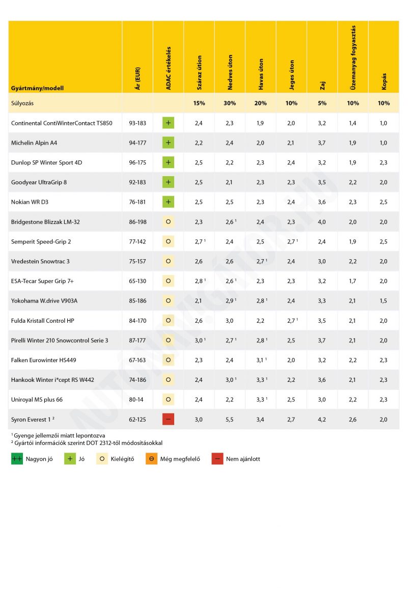 Ha fontosak a havas jellemzők, a Continental Conti Winter Contact TS 800, a Vredestein Snowtrac 3 vagy a Semperit Master-Grip lehet jó választás. Aki viszont tucatautósabban, nedves úton megy a legtöbbet, annak a Goodyear Ultra Grip 8, a Michelin Alpin A4 vagy a Continental Conti Winter Contact TS 8 lehet a befutó. A takarékos abroncsot keresőknek szintén a Continental vagy a Goodyear, a szerény kopásút áhítóknak a Michelin lehet a kedvence. Aki pedig minden jellemzőből szeretne kapni, az válassza a Continental ContiWintercontact TS 800, a Michelin Alpin A4 vagy a Pirelli Winter 190 Snowcontrol egyikét. Ha az akusztika a fontos, a Firestone Winterhawk 2 EVO a legcsendesebb, ellenben havon, vízen és jégen nem nyújt sokat.