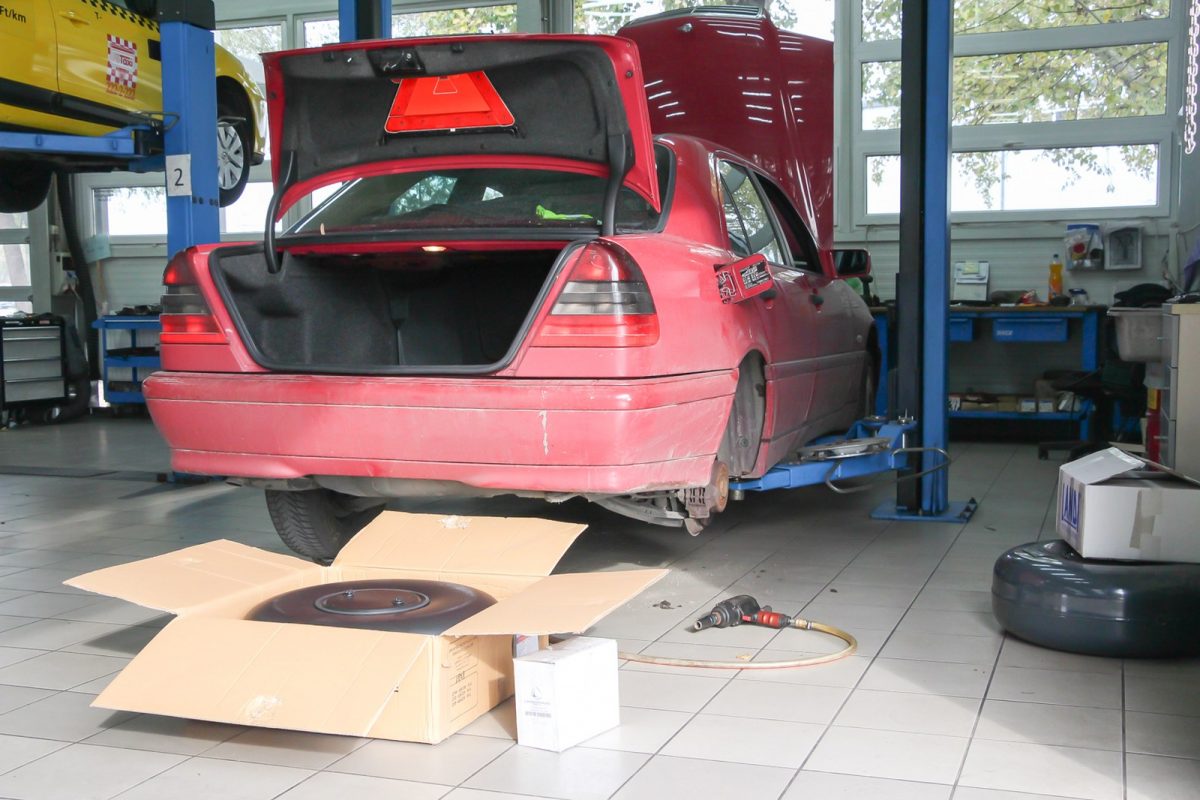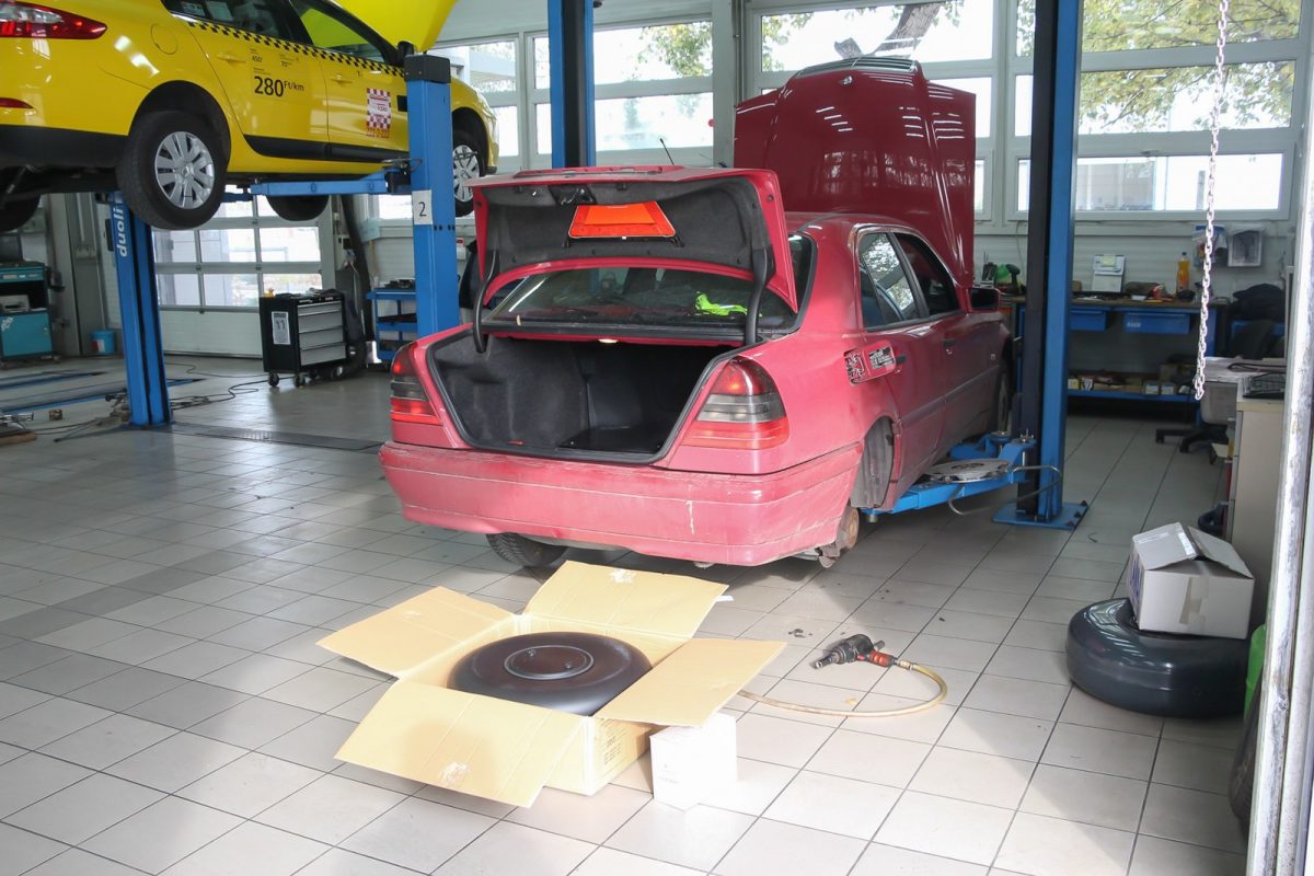 Egy 1997 és 2000 közötti C180-as Mercedes a műtőasztalon, mellette Fluence taxi. Tipikusan jó mindkettő az LPG átépítésre
