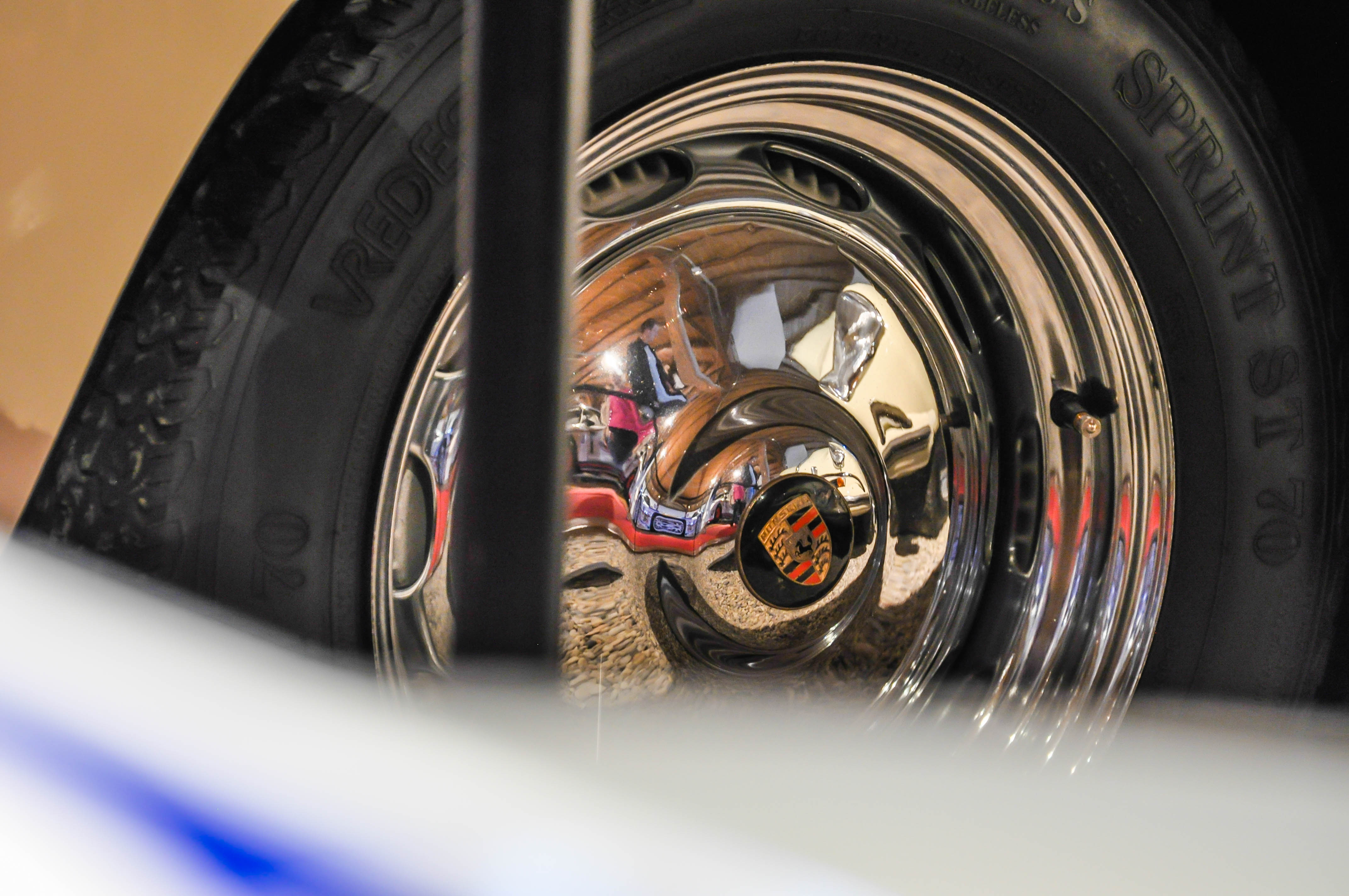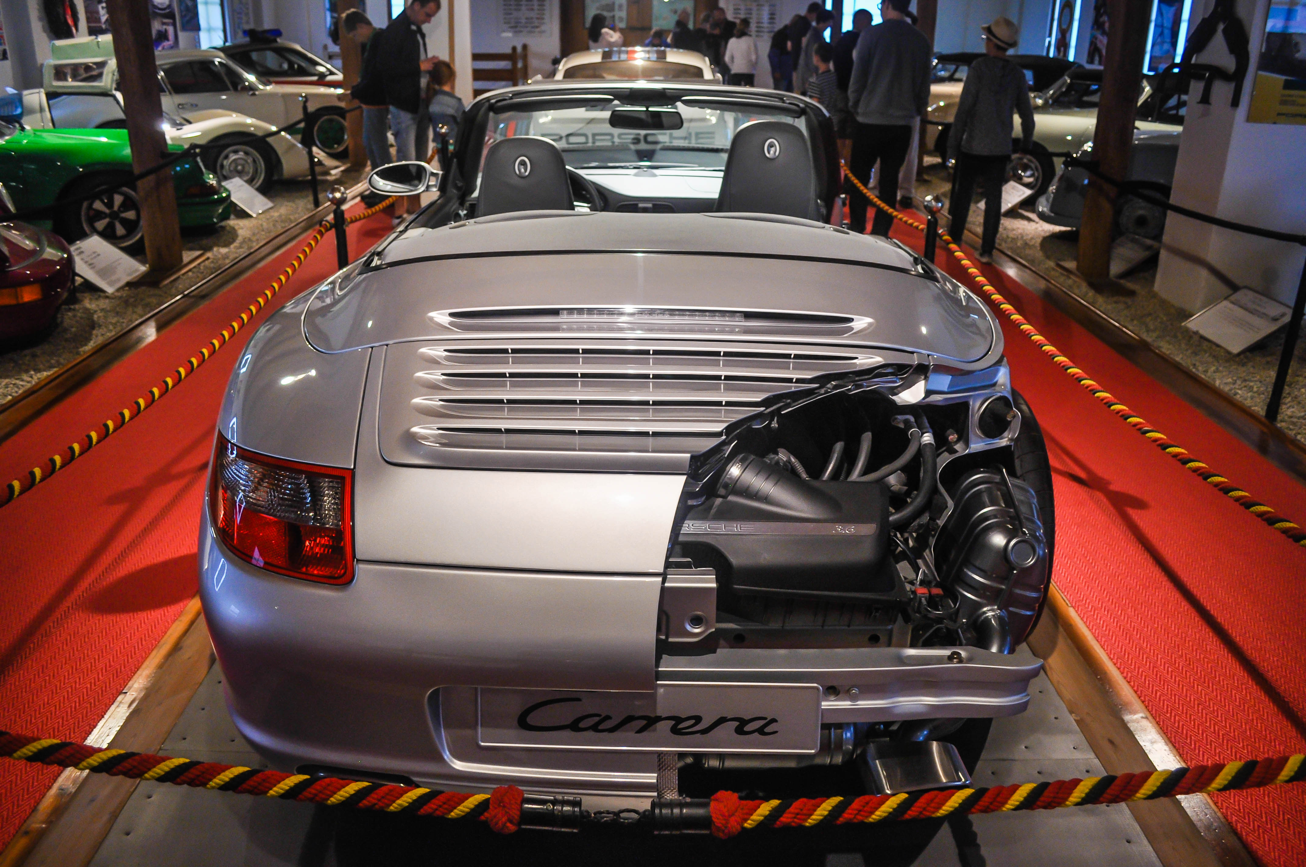 Mikor elakad a szavad. Felmegyünk a lépcsőn, és egy nagy tér tárul elénk, tele gyönyörű Porschékkal. Itt egy pillanatra megálltam. Sok az információ. Az első szembetűnő gép a GT1-es bajnokságban használt 911-es, majd a rendőrségi 911-es. A sorok közt haladva találhatunk sportautókat, katonai és rendőrségi, valamint gyönyörű állapotban lévő utcai autókat is. Azért látszik a túraautós, azaz „Rennwagen” beállítottság, a részletekbe merülve több autóban is találhatunk bukócsövet, kagylóülést, versenykormányt és bizony az áramtalanító helye is jelölve volt néhány gépen.