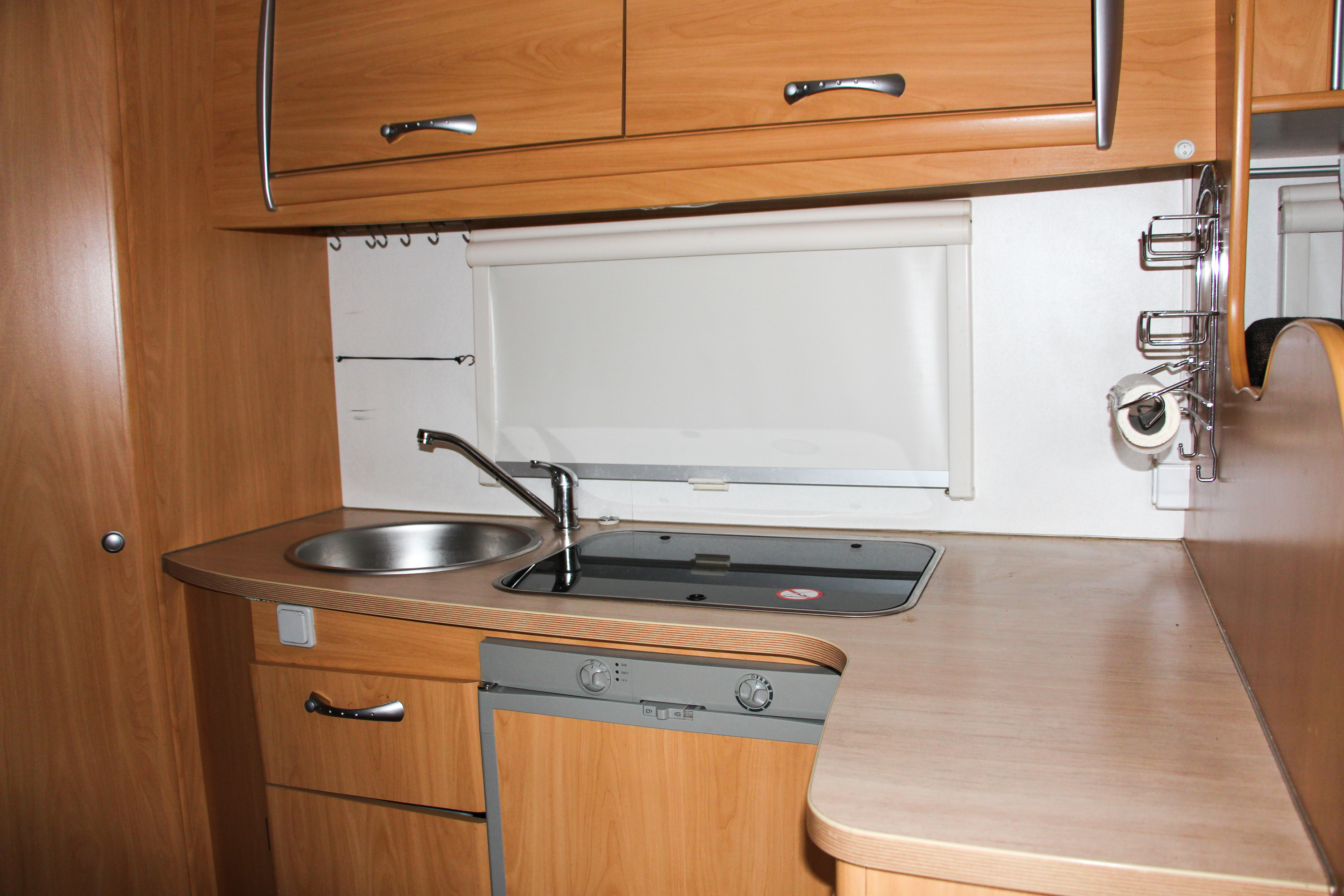 Tágas étkező, használható méretű konyha és WC/zuhanyzó egy lakókocsiban. Adott árért és alapterületen sokkalta jobb életkörülményeket kaphatunk, mint lakóautóban