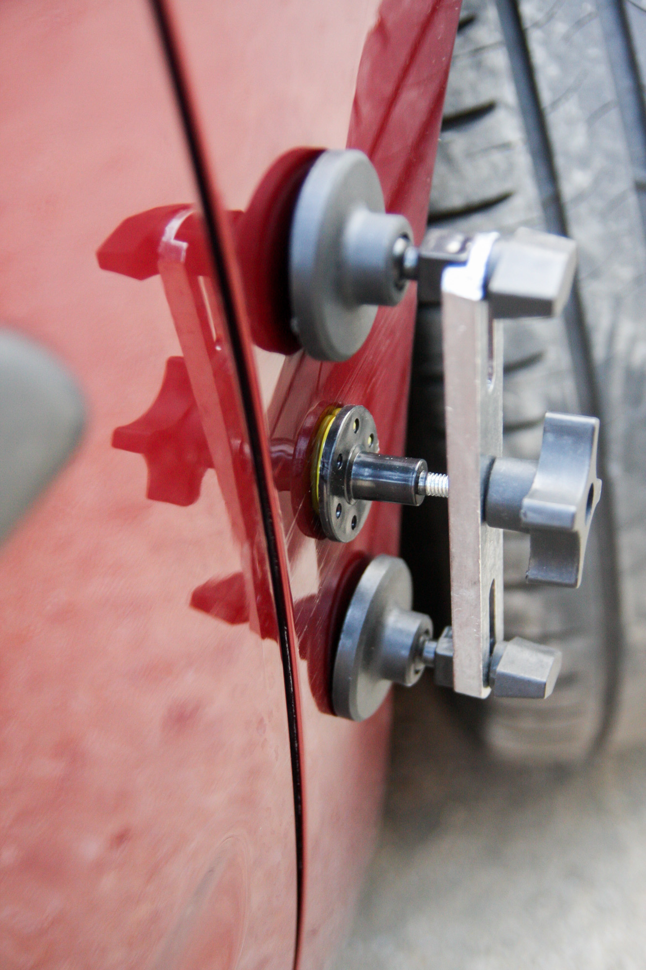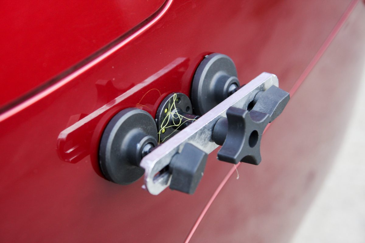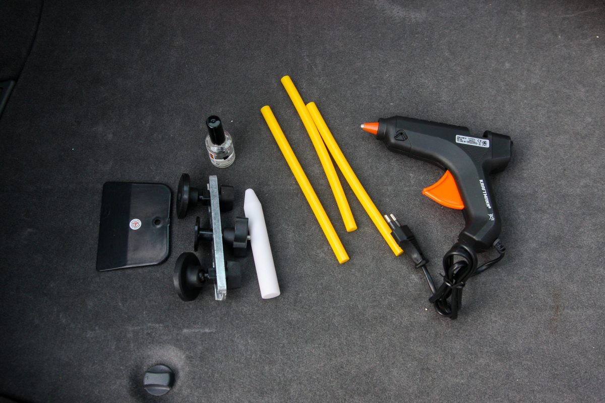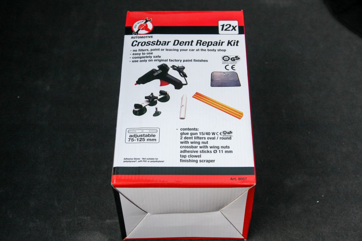 A mindössze 5785 forintért kínált BGS horpadásjavítót nehéz elsőre komolyan venni, szinte gyerekjátéknak tűnik, pedig valójában épp elég profi. Korrekt, hogy már dobozán hirdeti: csak gyári fényezéshez. Nem azért, mert az újrafújt elemet ne tudná kihúzni, hanem azért, mert arról a fényezést is lekaphatja. A horpadásjavító-készlet ugyanis alapvetően egy apró menetes szárra épített korong, amit a hozzá kapott hőpisztollyal hevített ragasztóval cuppanthatunk a horpadás közepére. Utána felhelyezzük a flexibilis talpakra rakott, állítható fesztávú, de kellően masszív fém keresztsínt rá, majd egy jól megfogható külsejű szárnyas anyával a korongot a ráragasztott lemezzel együtt kihúzzuk. Ez ugyebár az elmélet.