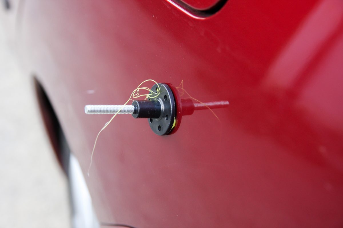 Munkában a horpadásjavító, a fejen lévő cérnányi ragasztósallangok kézzel letörölhetők, a lényeg viszont a tappancsokra ültetett sín, amin a szárnyas anyát tekerve kihúzhatjuk a lemezre cuppantott fejet, így a horpadást