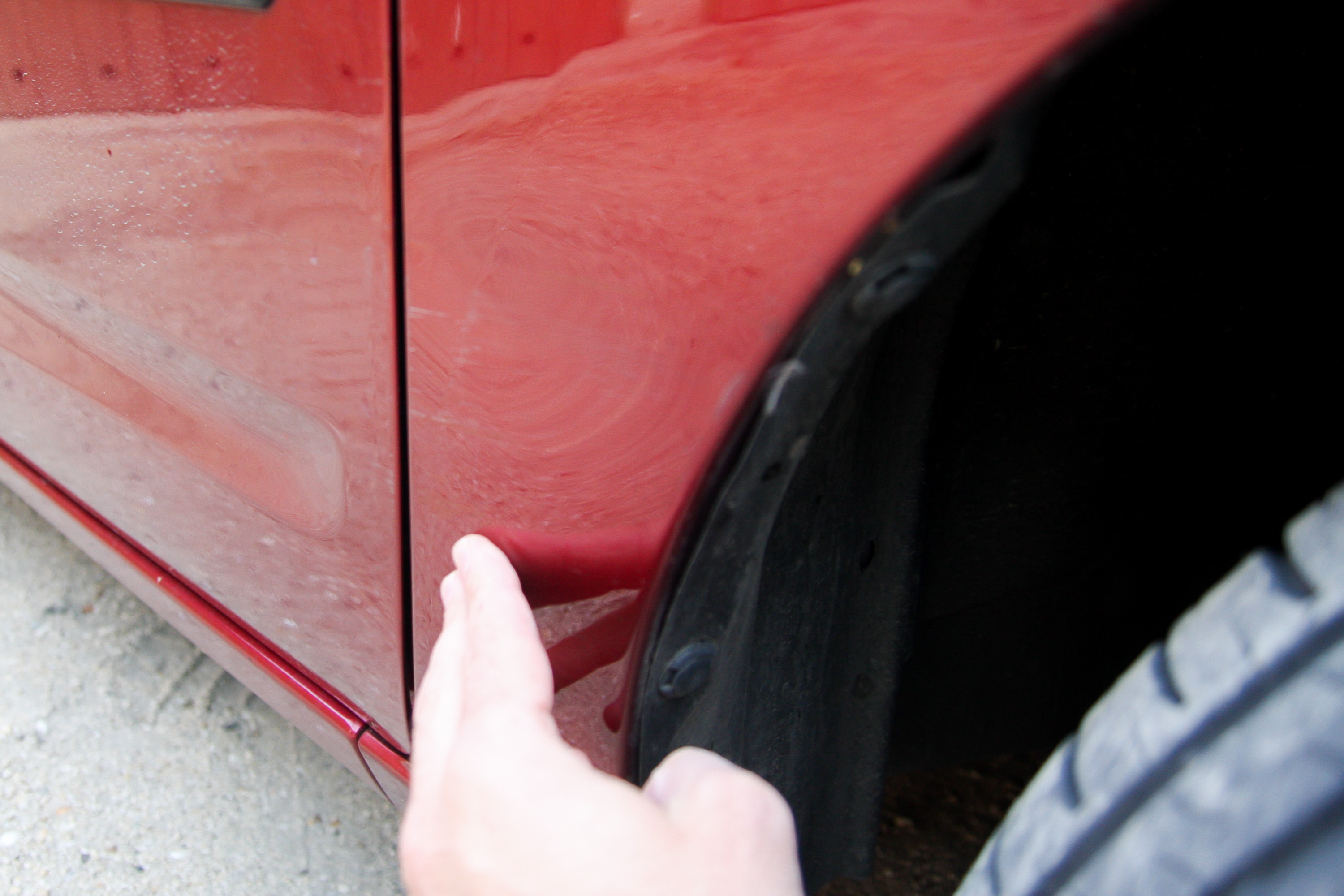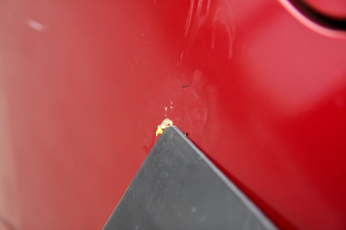 A gyakorlathoz viszont hozzá tartozik, hogy ragasztás előtt zsírtalanítjuk a felületeket (a legegyszerűbb féktisztítóval), a pisztolynak áramot kell adjunk, majd 10-15 perc hevítést ír az útmutató, elárulom, 5-7 perc is elegendő volt még 10 Celsius fokos levegő mellett is. Kezdtem a szépítést a bal hátsó sárvédő apró, de éles közepű, tán esernyő-nekicsapástól származó pontszerű horpadásával. Kétszeri próbálkozásra tudtam rajta segíteni, de azért az éles, fénysérült és minden bizonnyal némileg már megnyúlt közepét nem tudtam tökéletesen meggyógyítani. Viszont rosszabb se lett, mint volt, a leszedéshez adott folyadékkal a ragasztót gyengítve a talpat és a maradék ragacsot is le tudtam venni. A kaparászást persze óvatosan ajánlott csak végezni (bár a készletben egy műanyag spakli is van ehhez), tanácsosabb polírozással befejezni.