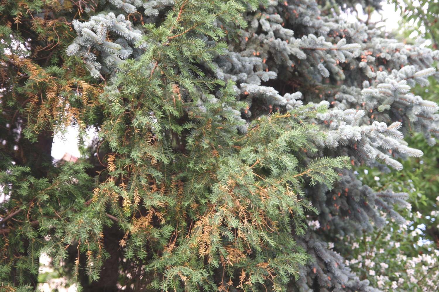 Fenyő alatt a kicsöpögő gyantától lehet tartani, lombhullatás nem jellemző