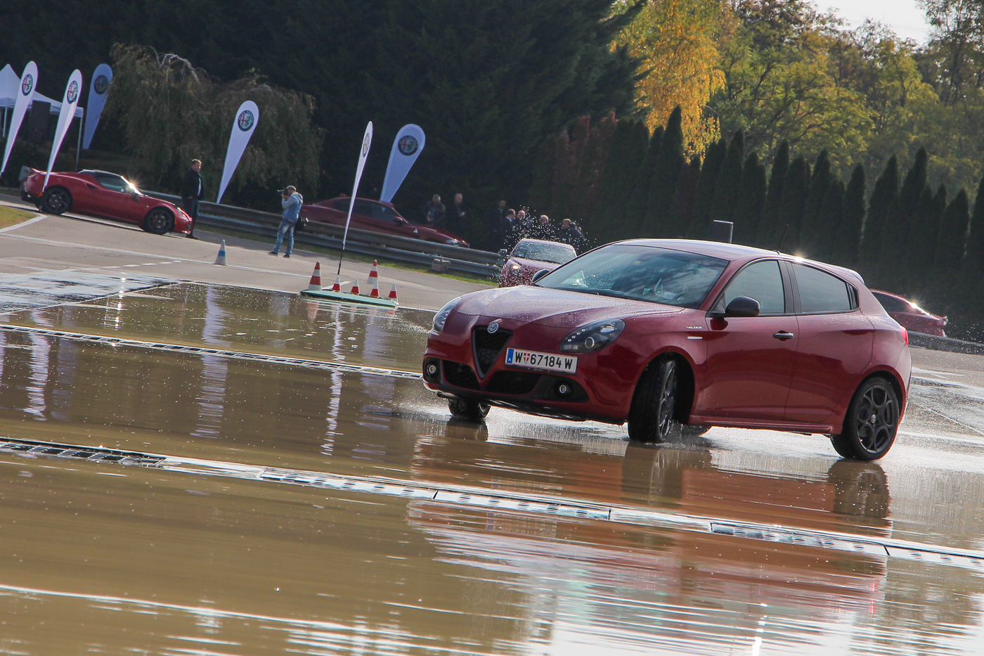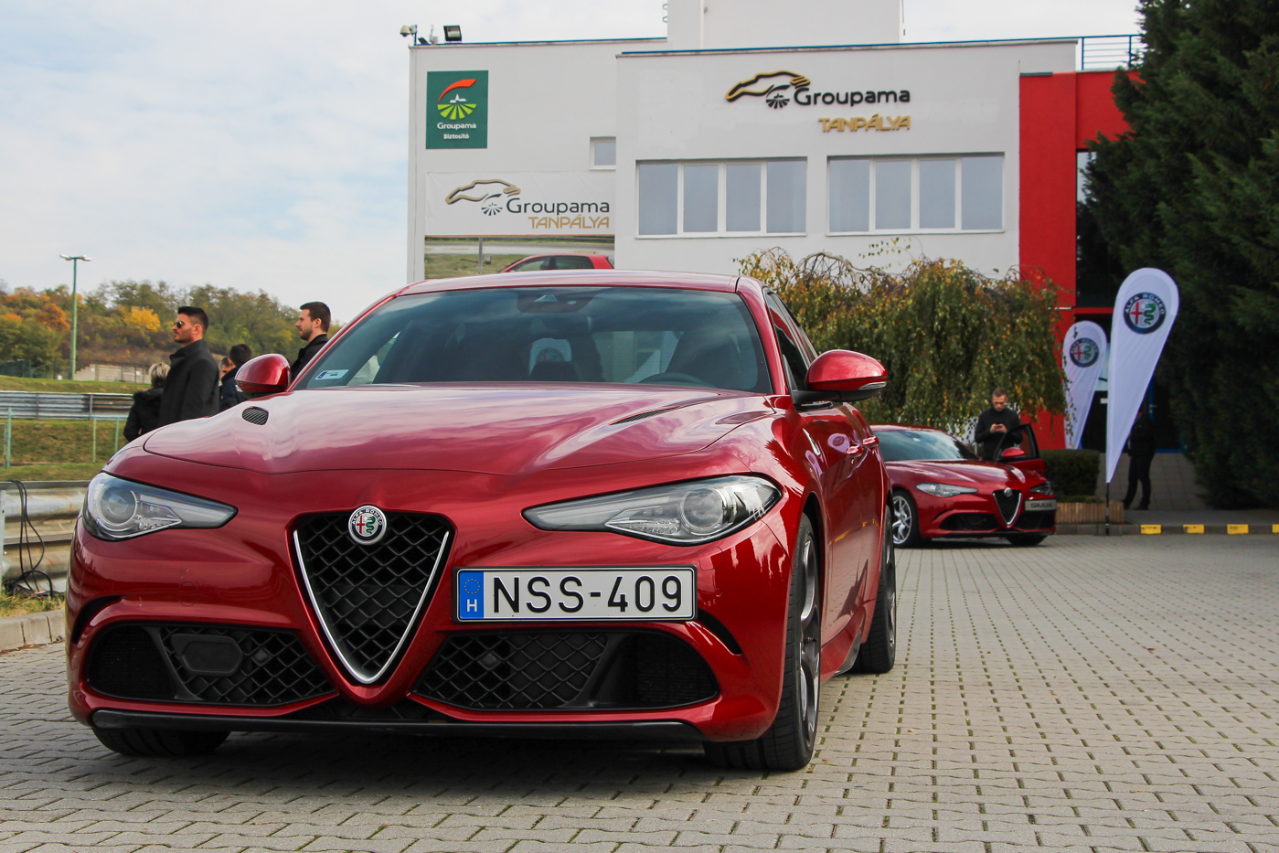 A nem túl sok tanpályás méter után keveset lehetett megállapítani az olasz csodákról, viszont ez is elég volt, hogy megszeressem a két kisebb modellt. A MiTo és a Giulietta vadító vörösben sorakoztak fel a rajtvonalhoz. Mind a kettő automata volt, és mind a kettő végtelenül sportos mozgású. A beltérben is utalva az irányultságra, mindent szénszálas műanyag borít és elmaradhatatlan a DNA kapcsoló. Kettőjük közül mégis a Giulietta lett nap végére a kedvencem, ami a Giuliával szemben rendkívül kezes volt, és simán engedte, hogy végigfűzzem driftben a műgyantás csíkot. Nagy szögben, a gázt etetgetve gyönyörűen lehetett vele rajzolni. Mellé fürge is volt, a Veloce felszereltségnek köszönhetően pedig a kényelmes kagylóüléseket is élvezhettem. Hogy sikerült-e megszeretni az olasz márkát? Abszolút! Valamit nagyon éreznek, ha az autógyártásról van szó. Jó látni, hogy van még gyár, amely minden lelkét és tudását beleadja autóiba, még ha technikailag nem is olyan precízek.
