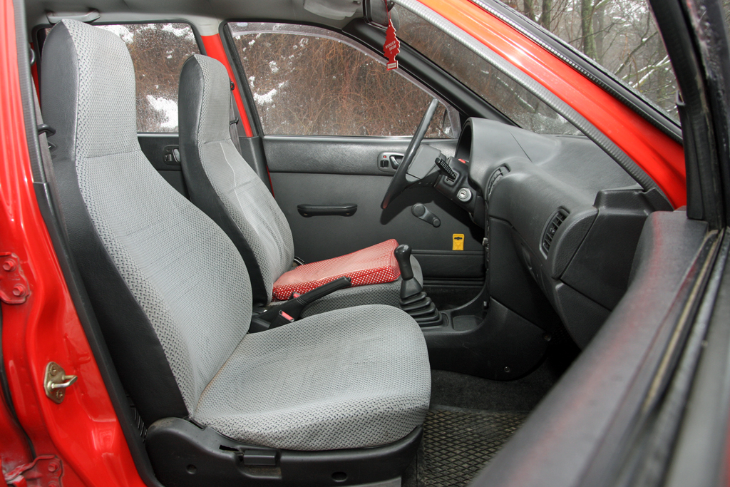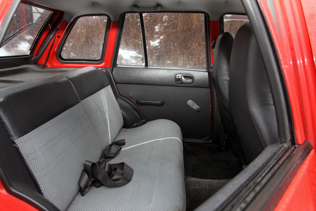A kormány, a pedálok, a burkolatok, a kárpitok bezzeg az autó korát meghazudtoló képet mutatnak. Kapcsoló, műszer meg annyi van, amennyi muszáj, hogy legyen. Fordulatszámmérő nélkül is élet az élet. Fontosabb, hogy érzésre ma is rendelkezésre áll mind a 68 LE, ami 800 kilót fürgén repíti, van egyenesfutás, úttartás, szuper a fűtés, az ablaktörlők törölnek, a duda szól, a fékek fognak, az ablakok nem szorulnak, az ajtók így vagy úgy, de záródnak, s még hátul is el lehet férni.