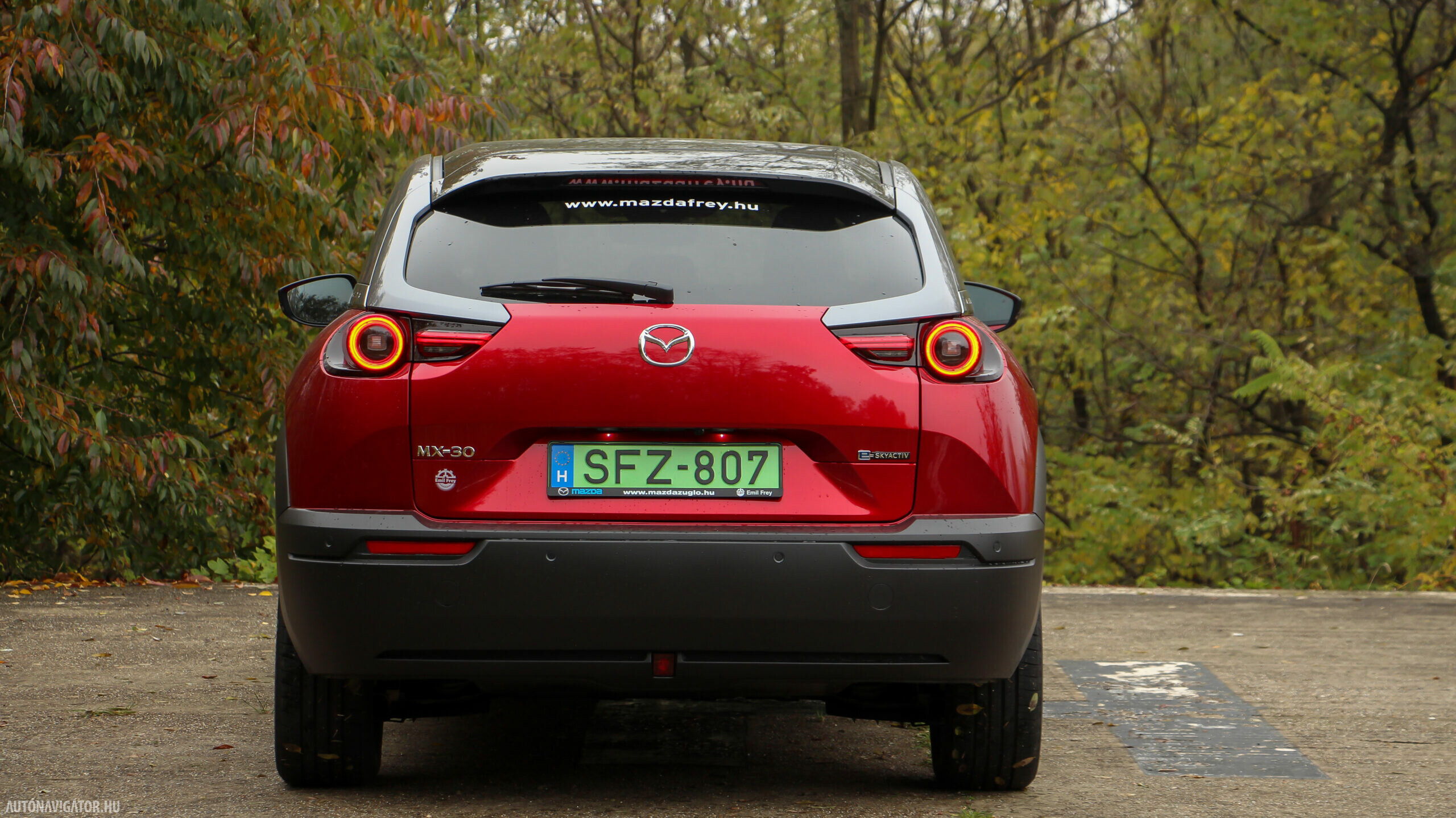 Úgy gömbölyded a karosszéria, hogy az alapvonások közben egyenesek, még a kerékjárati íveket is kiegyenesítették. Az MX-30 igazából olyan jól mutat a versenypályán, hogy az RX-8 kupa mintájára már várjuk a csövezett, kicsontozott versenyautókat egy emissziómentes bajnoksághoz