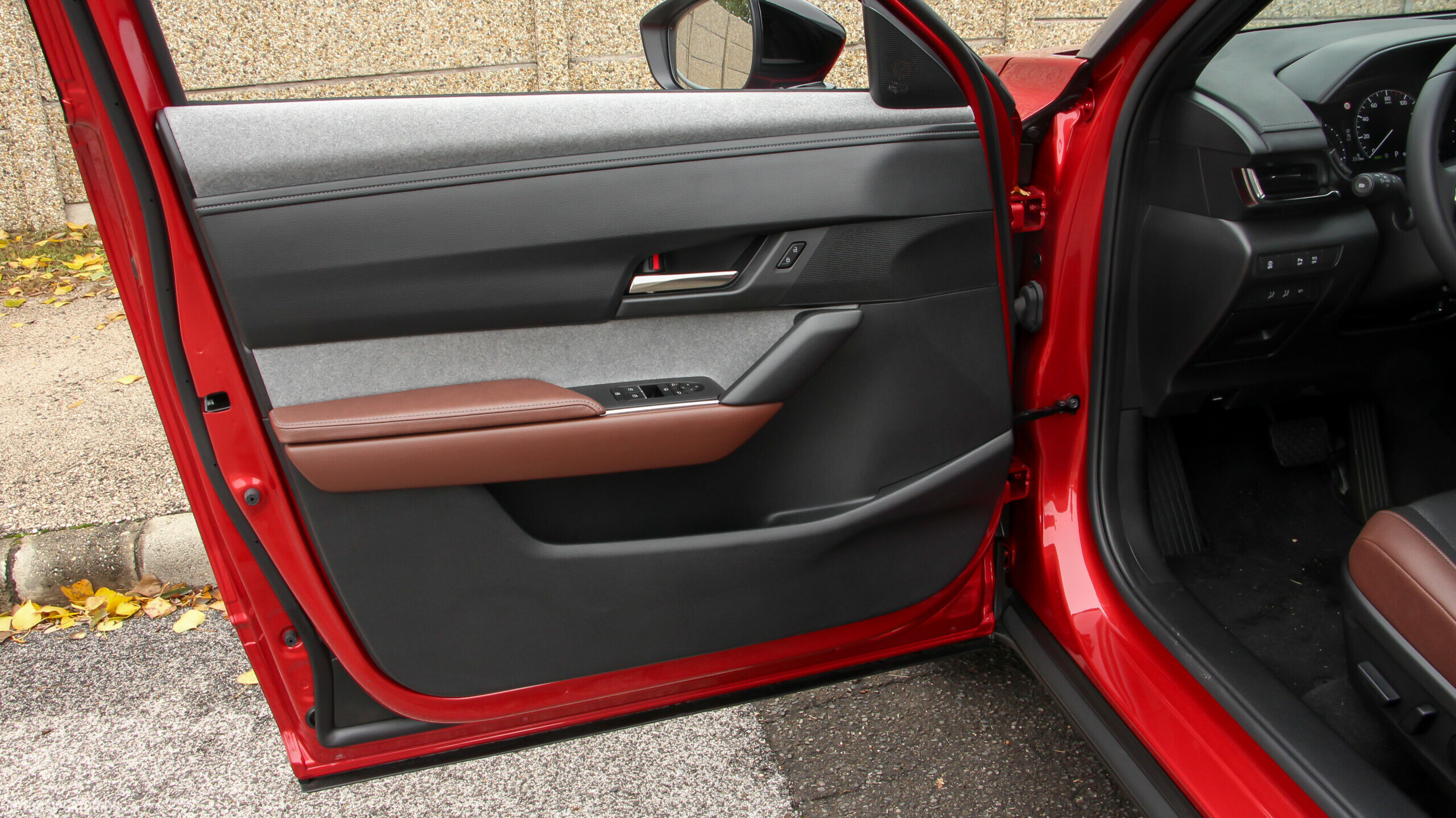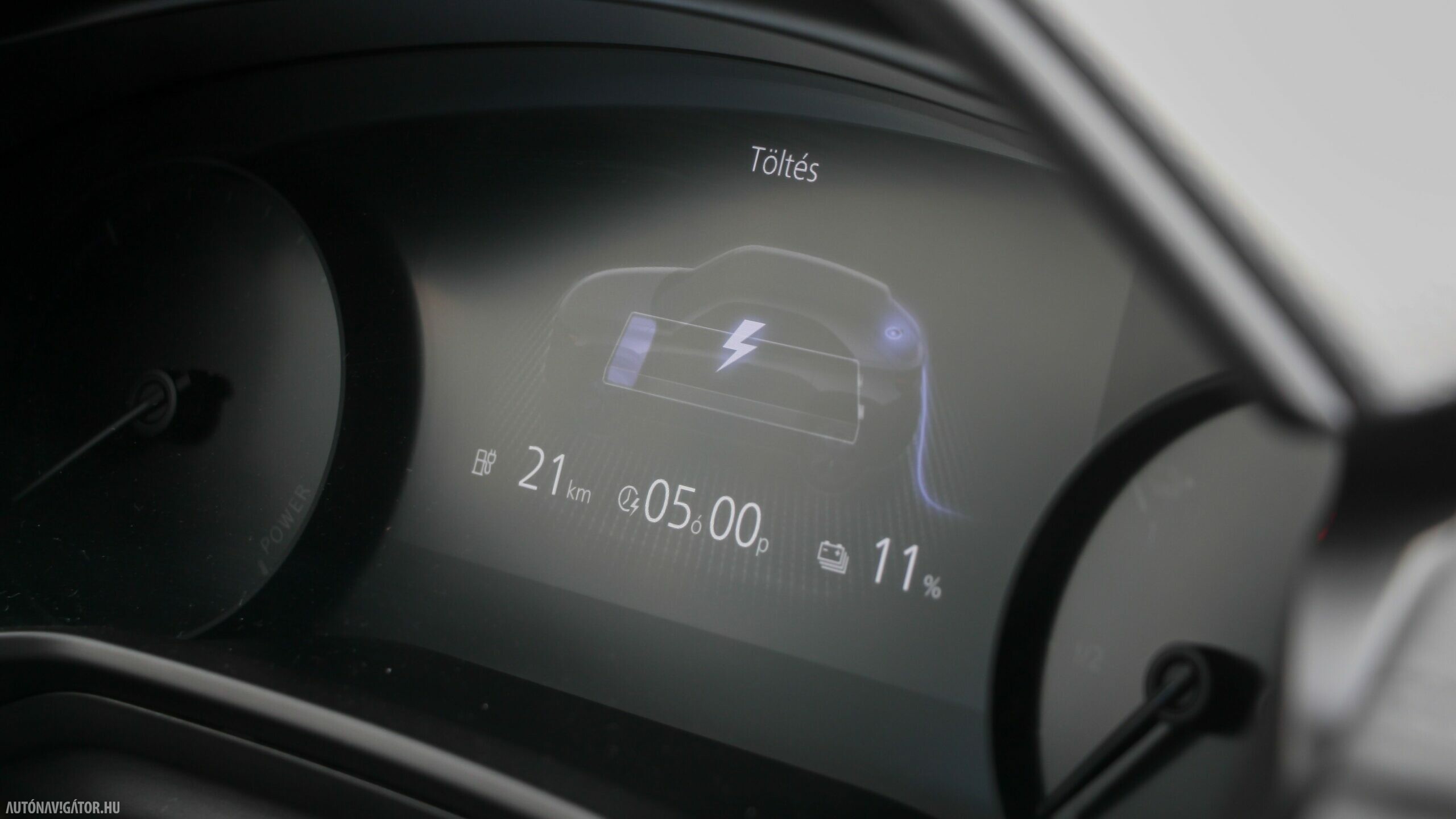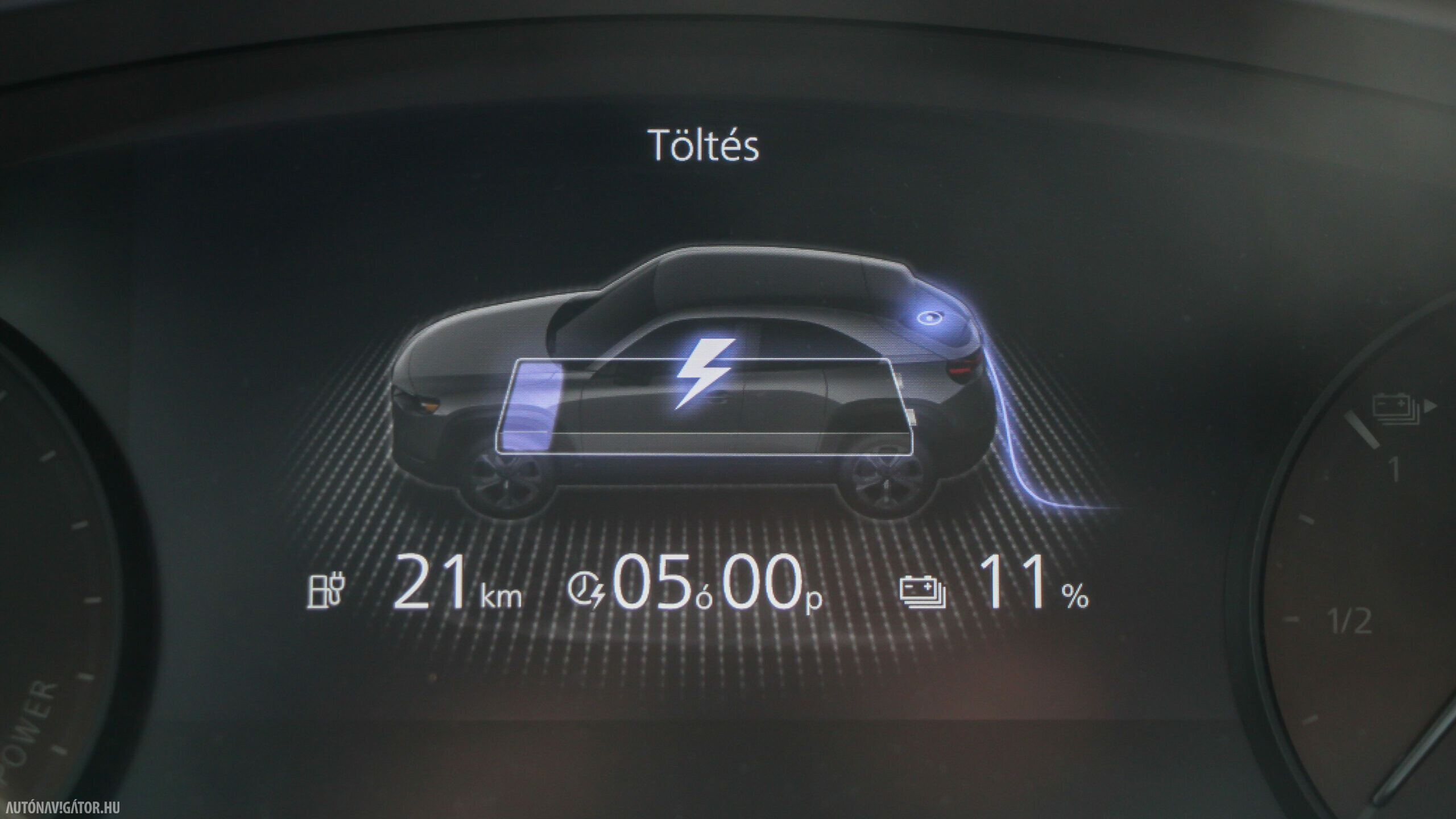 Az MX-30 pont azt adja, igencsak jól, amire az év nagyjából 350 napjában használunk egy autót. A Mazda számításai szerint az átlag európai ember 48 kilométert autózik. Én jellemzően ennyit sem, sőt, alighanem a hazai átlag sem, de persze vannak, akik többet mennek, pláne mondjuk Németországban. Az MX-30 villanymotorjának 145 lóerős teljesítménye ugyanúgy az untig elegendő kategória, ahogyan 9,7 másodperces 100-as sprintje és 140 km/órás végsebessége is. Pláne úgy, hogy addig (villanyautós szokás szerint) élénken gyorsul. Az első kerekeket hajtó villanymotorhoz egy 35,5 kWh kapacitású lítium-ion akkumulátort építettek a padlólemezbe, amivel 200 kilométeres WLTP hatótávot ígérnek. Ha a 19 kWh/100 km WLTP fogyasztásra pillantunk, akkor kissé fura az érték, de az 55%-os töltöttséggel átvett tesztautó által írt 114 kilométeres hatótáv, valamint a higgadt vezetéssel 16 kWh/100 km körül tartható fogyasztás szerint is simán hozható a 200 kilométere hatótáv is.