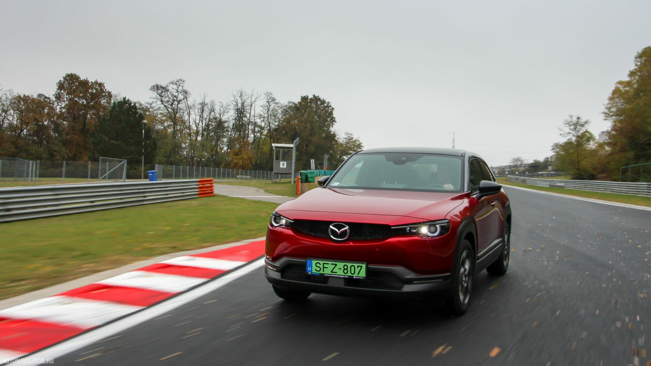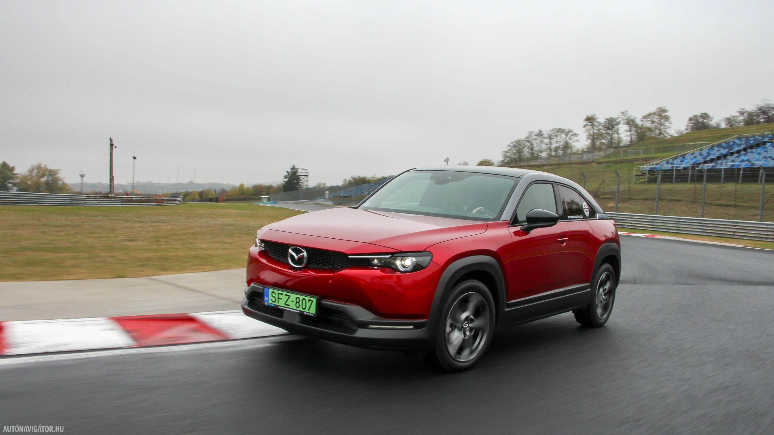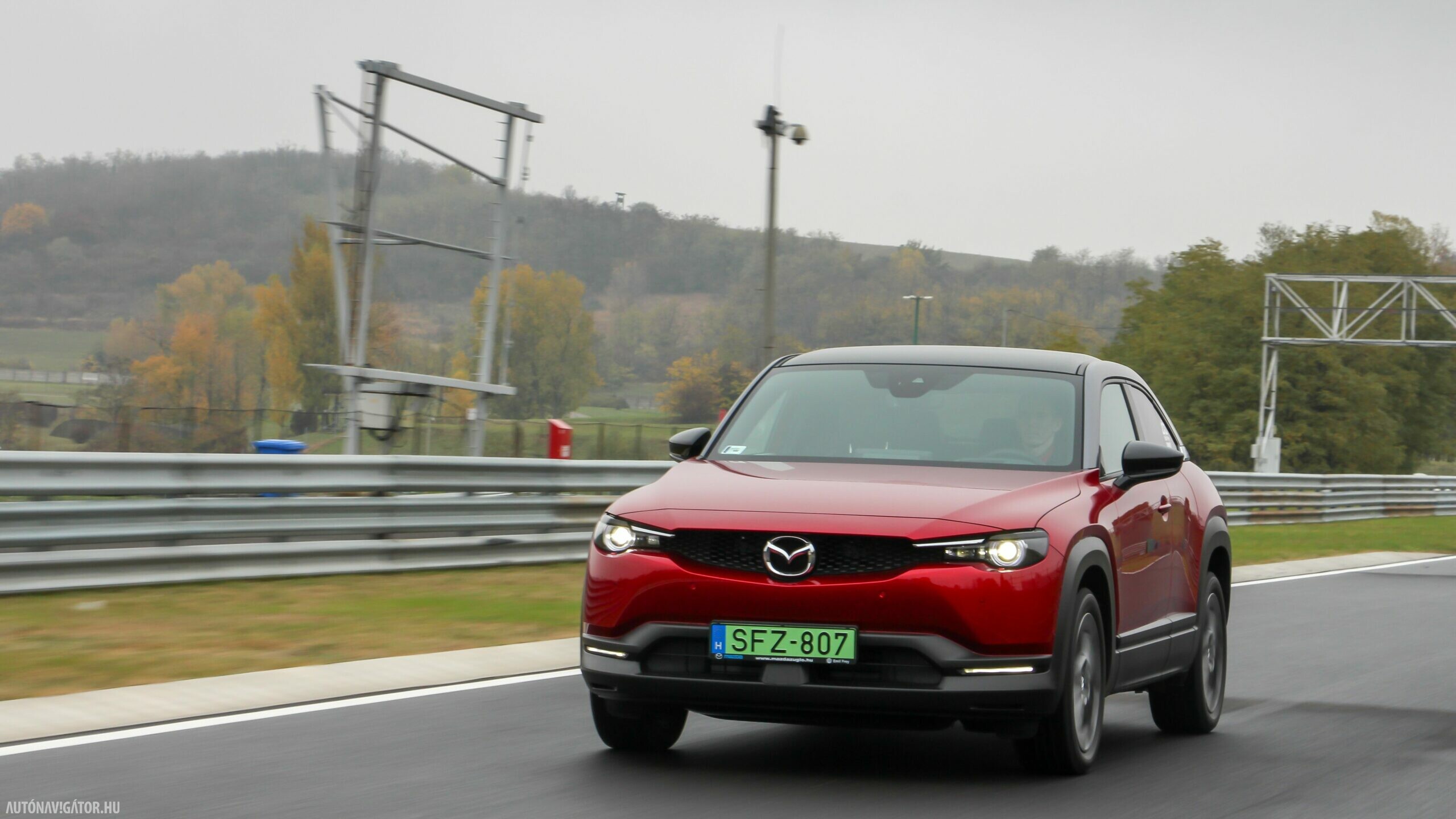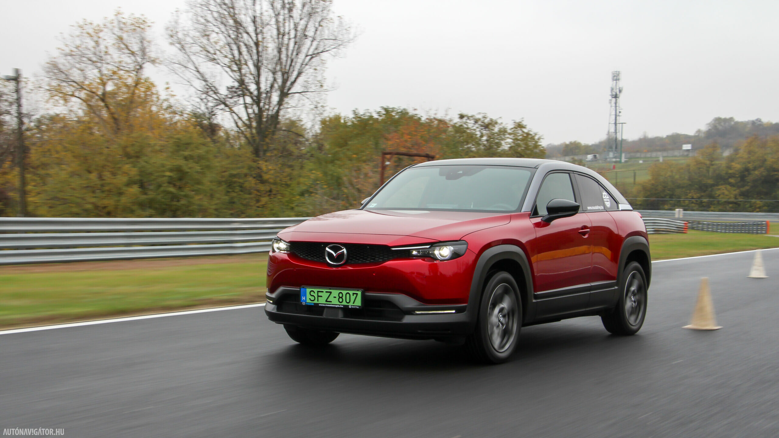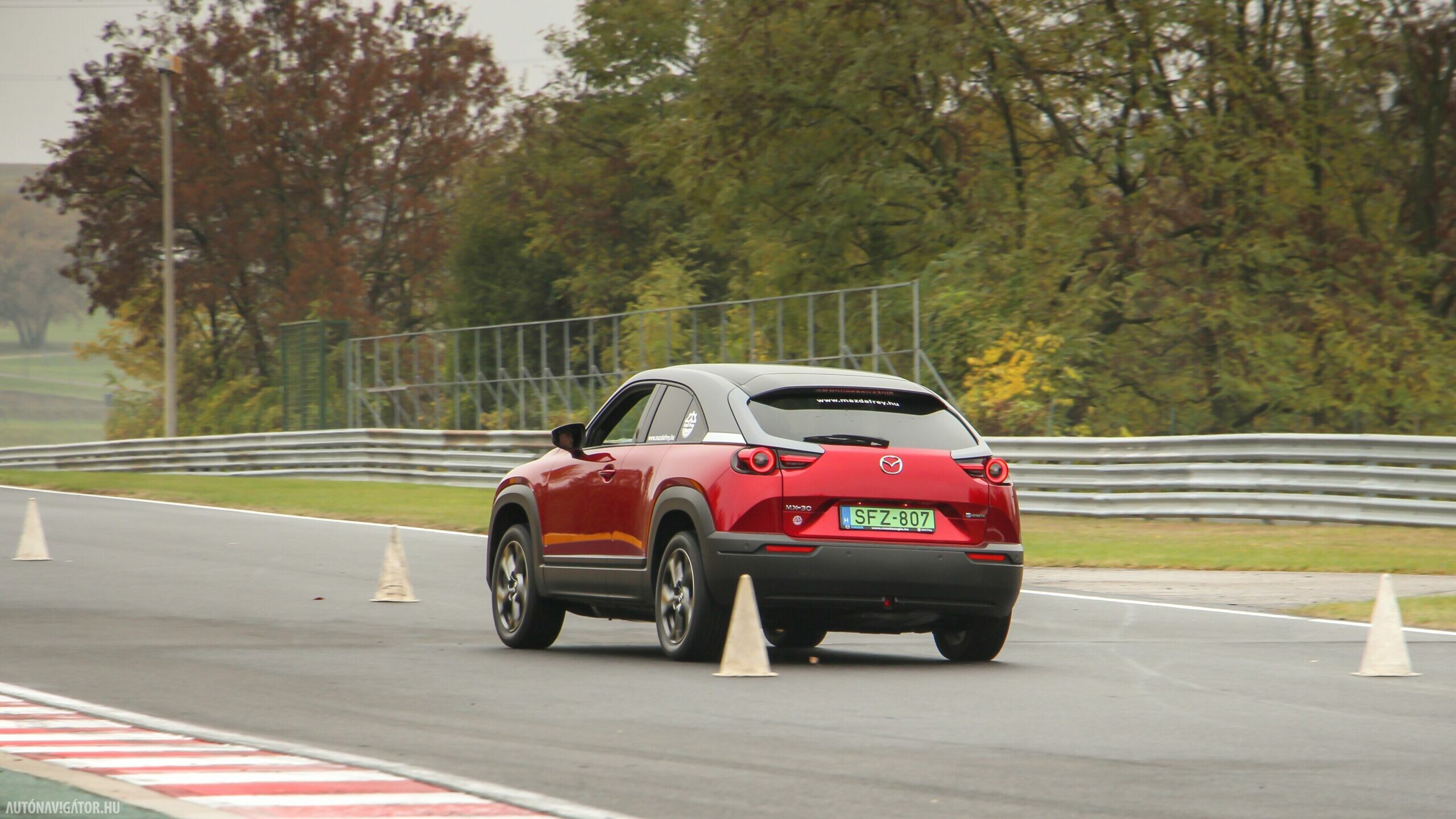 Nyilván senki nem akart körrekordot dönteni, pláne fotózás közben, így ami kiderült a pályán az MX-30 kapcsán, az nem is a fotózós körön, hanem a Hungaroring prémium tréning részét képező szlalomgyakorlaton mutatkozott. Az MX-30 viselkedése inkább személyautós, mint crossoveres, bár a Mazda a tengelyek közötti súlyelosztását "majdnem 50/50" arányúnak mondja, a Tanpálya instruktora az átlag autósok által jellemzően sosem próbált nagy sebességű szlalom után megjegyezte, hogy elöl kevés a tömeg. Extrém esetben valóban kijöhet, hogy az akkumulátorból valóban több került hátra, mint előre, a hátsó ülés alatt ugyanis dupla magasságban van, persze már az első ülések alatt kezdődik az akkucsomag. Normál esetben viszont az MX-30 stabilan fut, jól irányítható, és ami talán a legfontosabb: a hagyományos elvű, elöl MacPherson, hátul csatolt lengőkaros futómű az alapáron járó 215/55 R18-as kerekekkel is bámulatosan jó csillapítást ad.