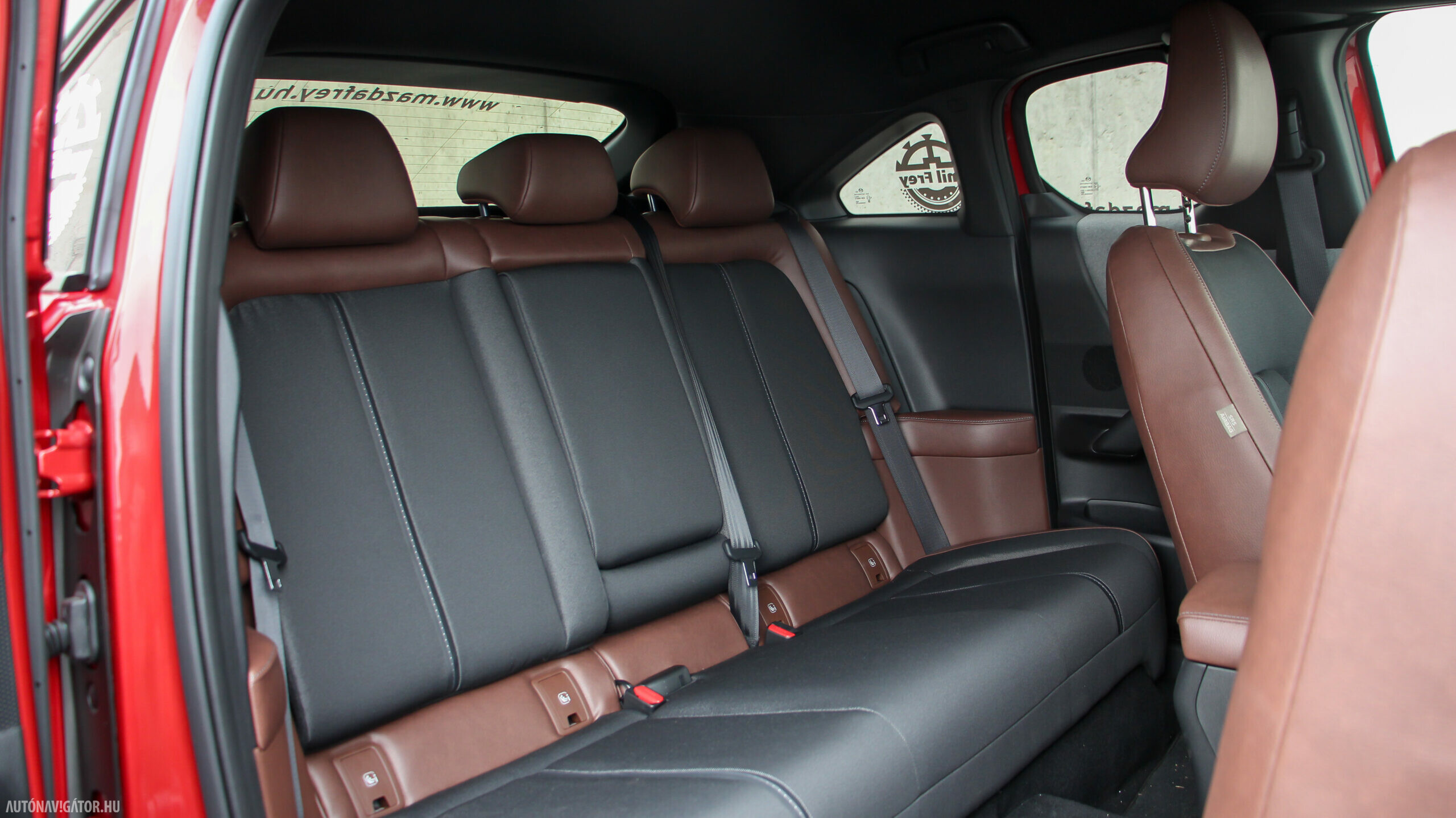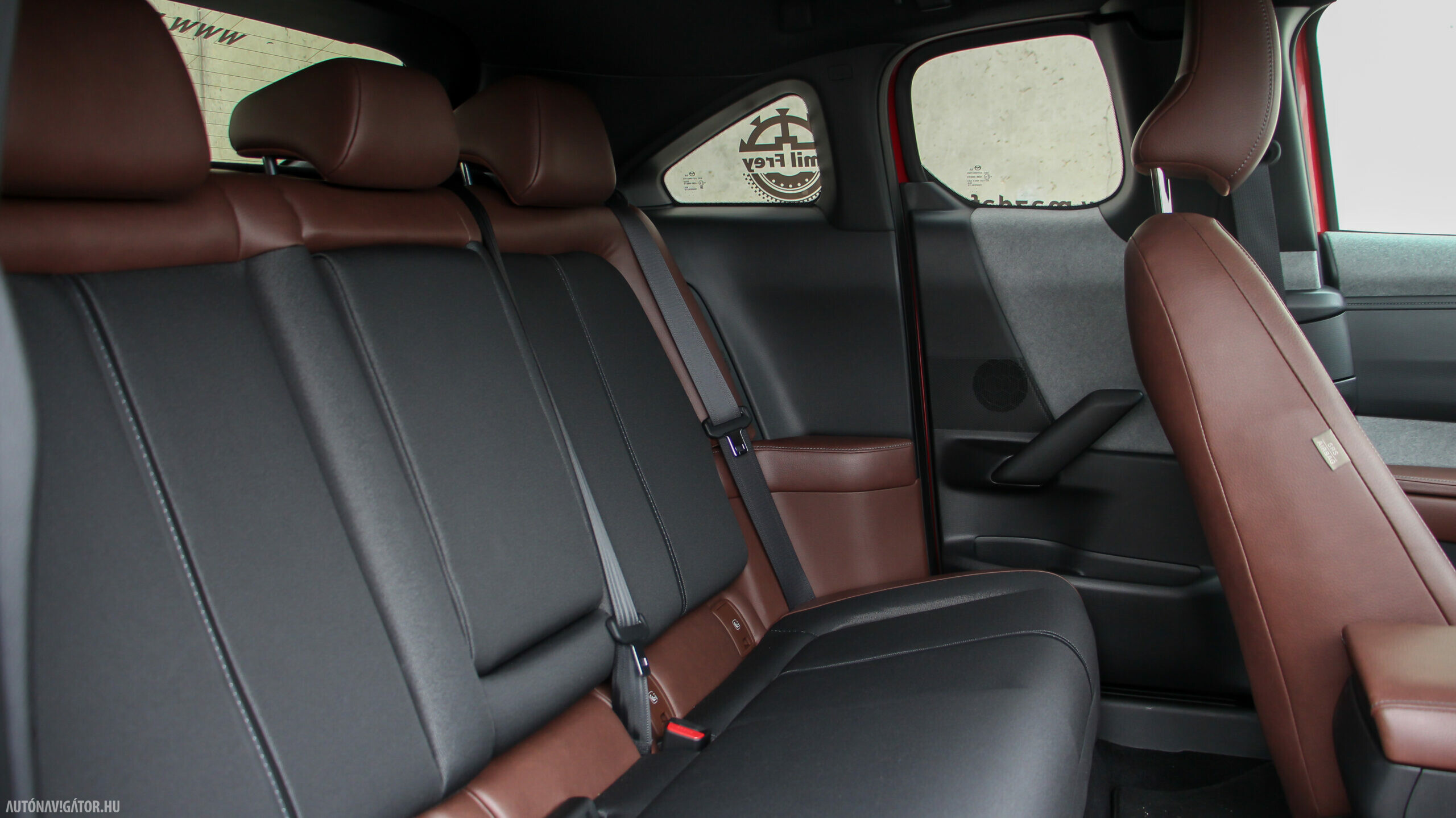 Elöl nem csak a helykínálat korrekt, a vezetőt és utasát igényes, kitalált tér, lounge hangulat fogadja. Bár nem zavaróan széles a középkonzol, szélére került puha párnás bőrözött felület is. Bőkezűen szórták az ilyen apró finomságokat a tervezők, a Vintage csomaggal gusztusos barna bőrfelületekkel tarkított sötétszürke, sűrű szövésű textileket kapunk az ülésekre is. Az ajtókra is bőséggel jutott textil, de a Luxury és a tesztautót is jelentő Launch Edition kiviteknél az ajtóbehúzókhoz még a középkonzolnál is bevetett parafából is. Hogy ez mennyire lesz tartós, azt majd az idő megmutatja, most viszont nagyon jól mutat, kellemes tapintású. Az MX-30 nem mellesleg nagyon gazdag ellátmányú, már alapból is bőrözött kormányos, első-hátsó parkolóradaros, szélvédőre vetített kijelzős, millió egyebet is adó. A Launch Edition ezt fejeli még meg a LED fényszórók adaptív vezérlésével és mosójával, keret nélküli, éjszaka fényre sötétedő belső visszapillantóval, fűthető első ülésekkel és szintén fűthető, memóriás külső tükrökkel, elektromos és memóriás vezetőüléssel, sötétített hátsó ablakokkal, valamint a parafás Luxury belsővel.