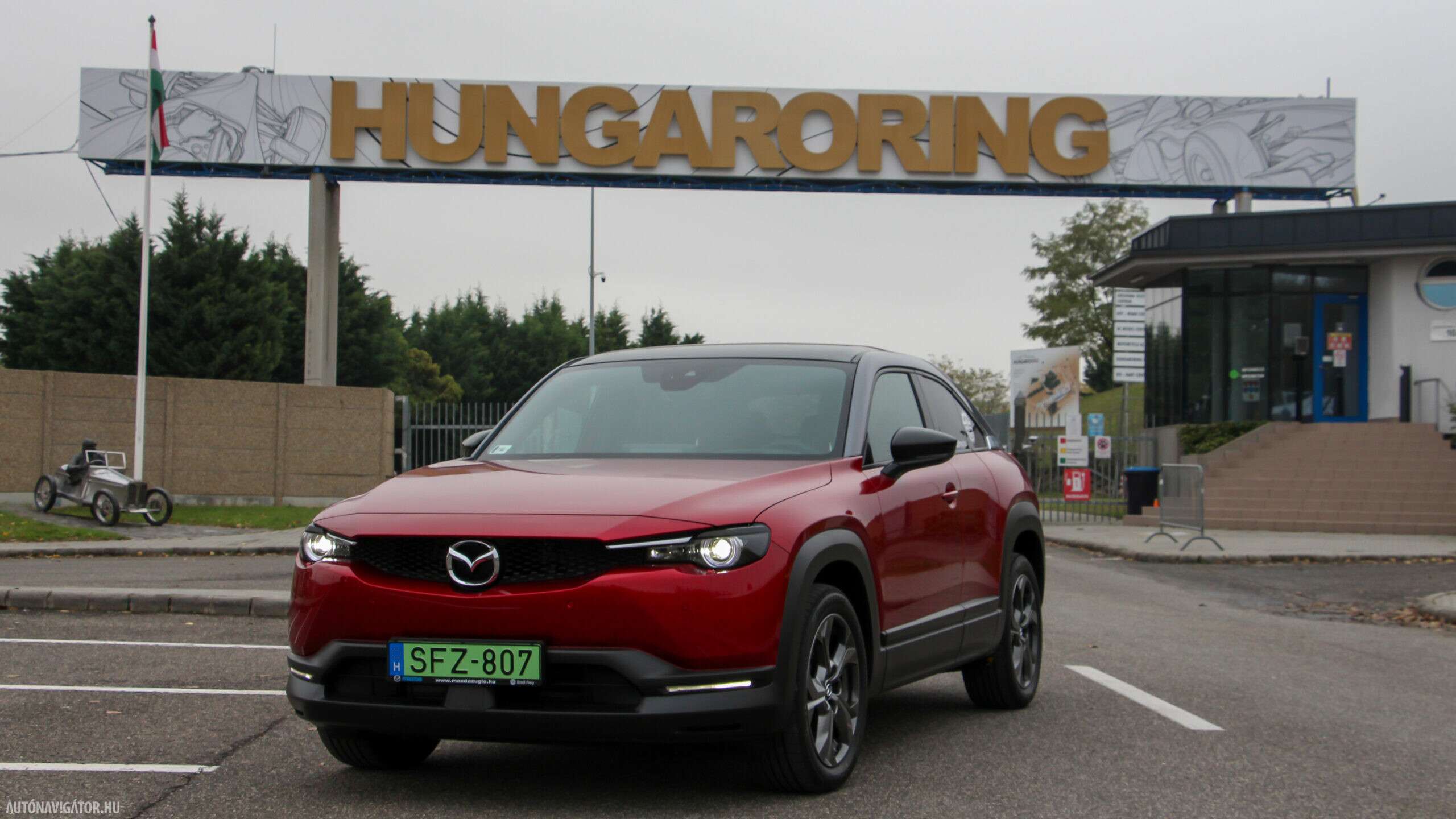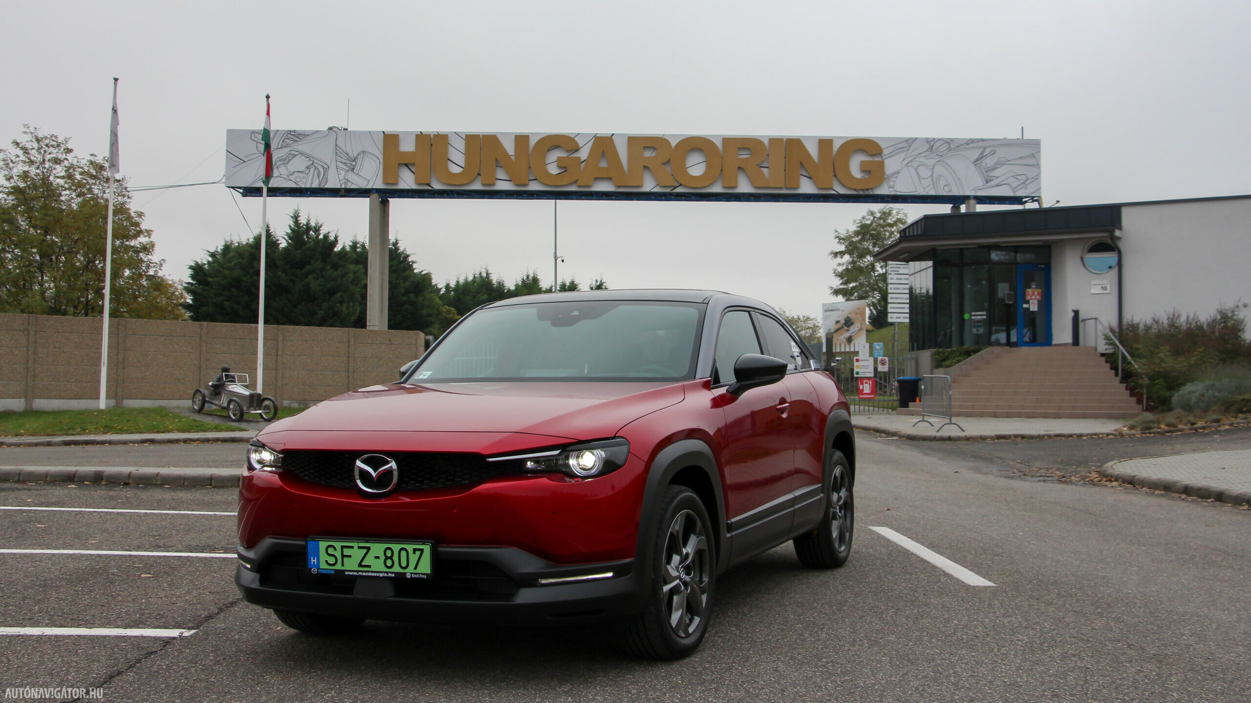 Ráadásul hiába nem érhető el jelenleg a villanyautók ártámogatása (hiszen az nyáron 1,5 nap alatt kifutott), az MX-30-nak még mindig kedvez, hogy a bűvös 11 millió forint alá árazták, méghozzá úgy, hogy oda nem csak alap, hanem gazdagabb ellátmányaival is beférjen. A vevőknek pedig jó hír, hogy a listaárak egyelőre még nem mentek a már stabilan 360 forint feletti euróárfolyam után. Ez alapján pedig még támogatás nélkül is korrekt a 11 millió forint alatt hazavihető MX-30, a támogatási okirattal rendelkezőknek 9 millió forint alatt pedig szinte ajándék. Az MX-30 ugyanis úgy viselkedik, mint egy komolyabb autó. Nem csak városban kellemes, ott egyébként nagyon, hanem országúton és autópályán is. Nincs benne korlátozottság érzet, de mégis egész légiesen mozog, legalábbis a vezethetőségén nem érződő jelentős, 1,65 tonnás saját tömegéhez mindenképp. És miként keveredtem a Hungaroringre? A környék bevált fotóshely, a Tanpályával elég szoros a kapcsolatunk gumitesztjeink miatt, de azt is tudom, hogy ők is nyitottak minden újra, az elektromos autók vezetéstechnikájával is foglalkoznak, s magán a Hungaroringen is tartanak tréningeket. Érkezésemkor épp annak kapcsán tartottak belső képzést, így teljesen véletlenül adta magát, hogy az MX-30 a ringen is mehetett két kört, én pedig örömmel fotóztam, hiszen ilyen lehetőség ritkán adódik.