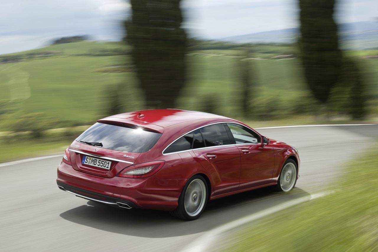 4956 x 1881 x 1413 mm: ezek az új Mercedes CLS Shooting Brake külső, a négyajtósnál valamivel hosszabb tengelytávot befoglaló méretei. Az autó homlokfelülete 2,3 m2, légellenállási együtthatója Cd 0.29, azaz az áramvonalasnak tűnő karosszéria valóban hatékonyan hasítja a levegőt. A széria belépőmodellje a CLS 250 CDI 204 lóerős négyhengeres, 2,1 literes dízelmotorral. A kizárólag hátsókerék-hajtással kapható kis dízel is meglehetős vehemenciával, 7,8 másodperc alatt gyorsítja álló helyzetből 100 km/h-s tempóra a CLS kombit, miközben fogyasztása 5,3 l/100 km, CO2-kibocsátása pedig 139 g/km körül alakul.