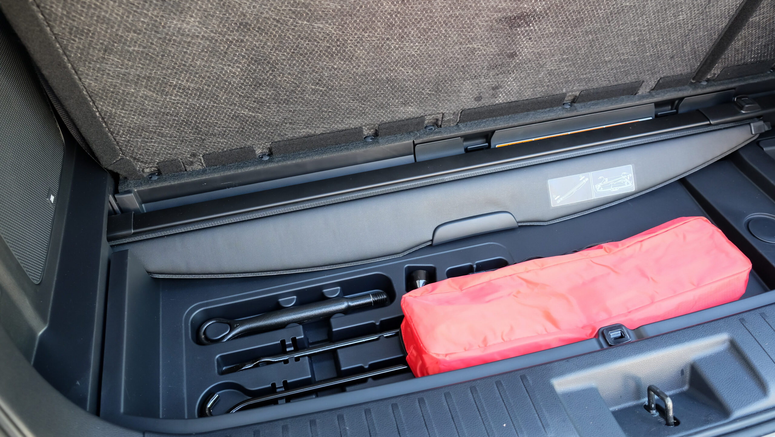 Maga a csomagtér egyébként nem kicsi, 7 ülés mögött is 42 centi hosszú, szélessége a kerékdobok között is 1,15 méter. Így hét ülés mögött az ablakszintig 268, a plafonig 332 literes teret kapunk, 5 ülés mögött már 658 litereset a fedőrolóig, 865 litereset a plafonig, ha pedig a második sort is ledöntjük, 1909 liternyi, 2,06 méter hosszú és sík, de a második és a harmadik üléssor között csak utóbbi hátratolásával összefüggő felületet kapunk. Pohártartók a harmadik sorba is jutottak, ahogyan csomagrögzítő füleket is kapunk.