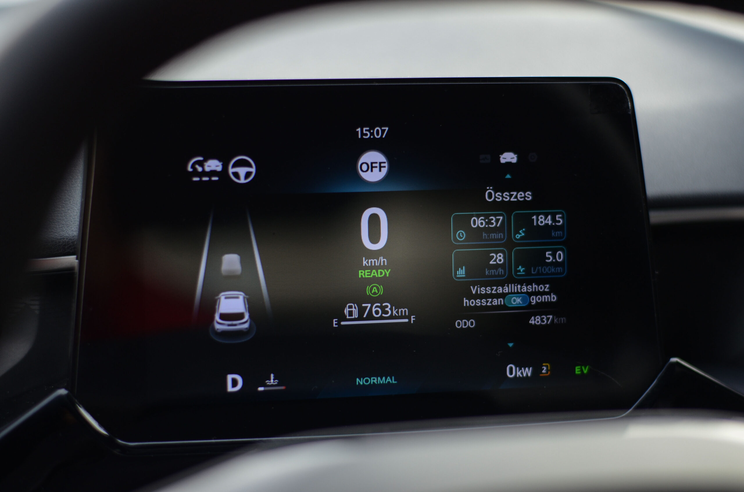 A műszerfalon a manapság már megszokott, két képernyőből álló kiosztás fogad. Mindkét kijelző kellően világos, éles, és korrekt felbontást is tud. Sokkal gyorsabb és átláthatóbb az infotainment rendszer, mint mondjuk egy korai ZS vagy HS modellben, ám rengeteg funkciót továbbra is kizárólag az érintőképernyőn lehet kezelni. A gyorsgombok megmaradtak, ám a különálló klímavezérlőt továbbra is hiányolom, ellenben a kormánygombok elhelyezkedése és kiosztása sok mindenért kárpótol.