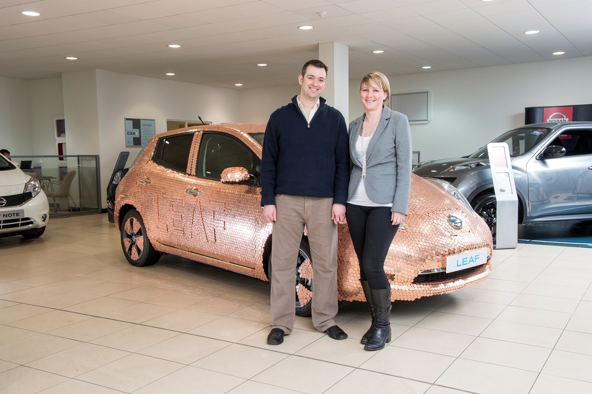 Az érmékkel borított Nissan Leaf egy háromfős csapat egyheti munkájának gyümölcse. Az autó egyik fele pennykkel, másik fele eurócentekkel borított, mindkét oldalra került egy-egy Leaf felirat is, mely három réteg érme felhelyezésével készült. Mivel a különleges borítás tekintélyes, 504 kg-os tömegnövekedéssel jár, ezen példány már sofőr nélkül is túlterheltnek számít. Az érmékkel borított Nissan Leafet a winchesteri Martins Nissan márkakereskedésben állították ki - ott ahol a százezredik Leaf gazdára talált. A vásárló Brett Garner, egy önmagát „technika-őrültként" bemutató fogorvos, aki az Anglia déli partján elterülő Fareham városában praktizál.