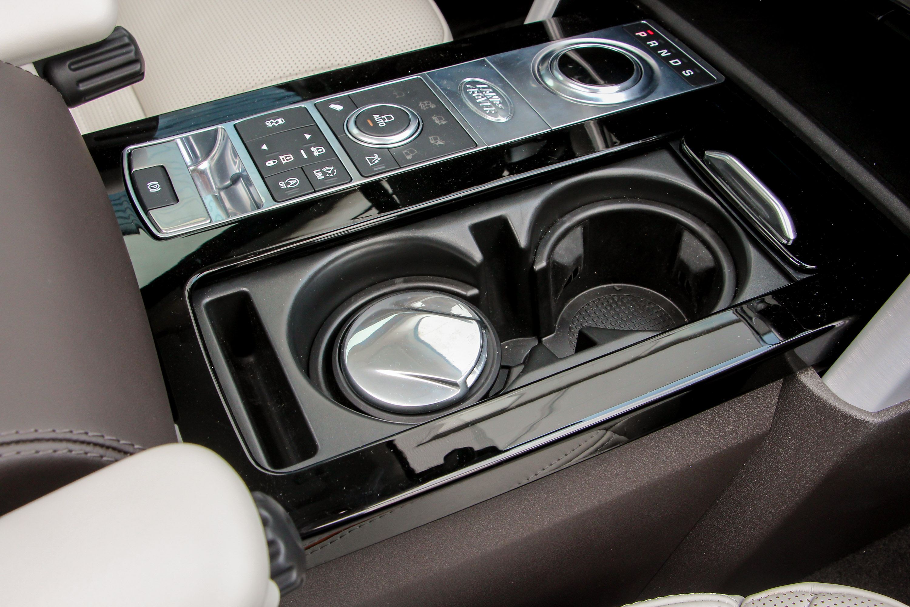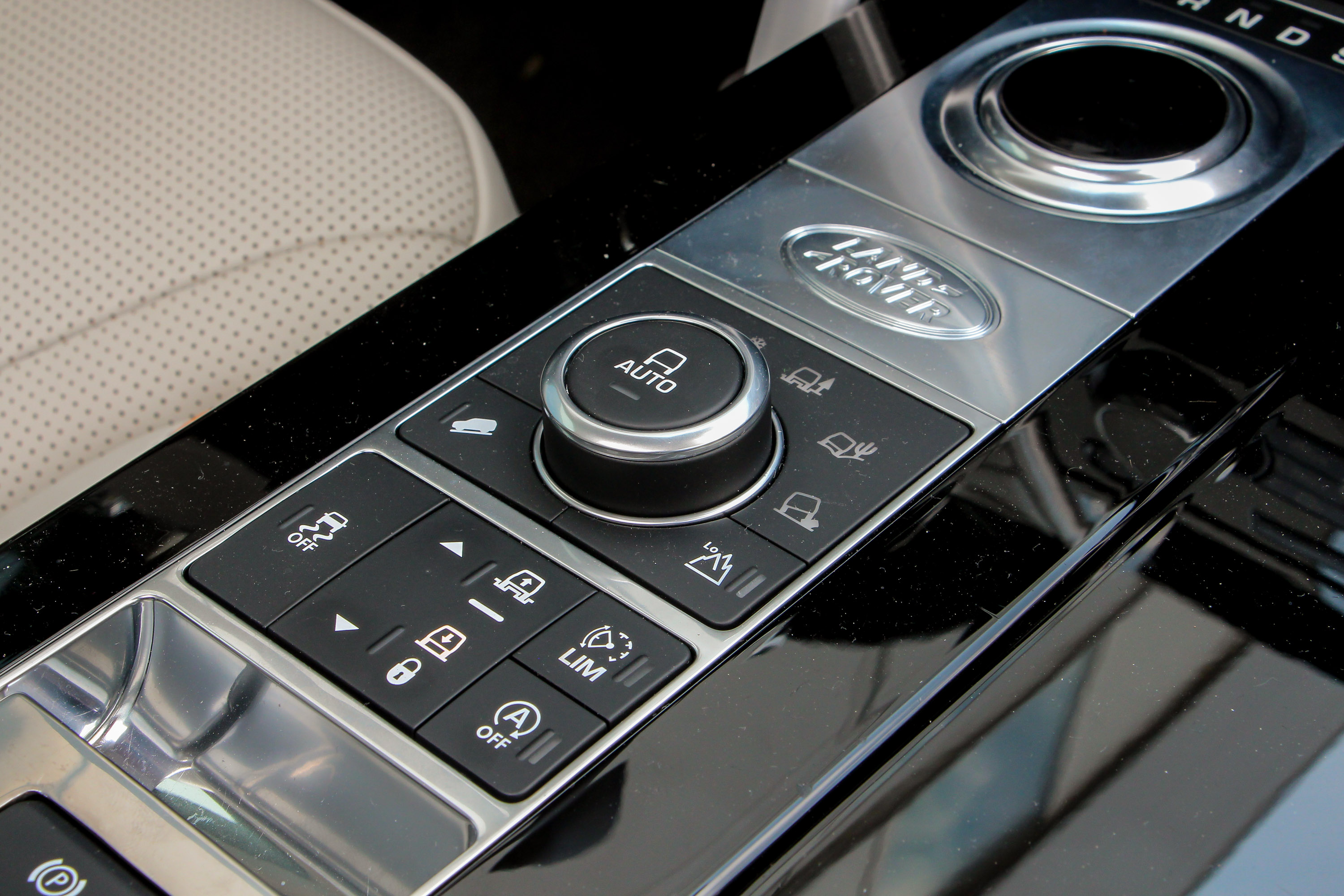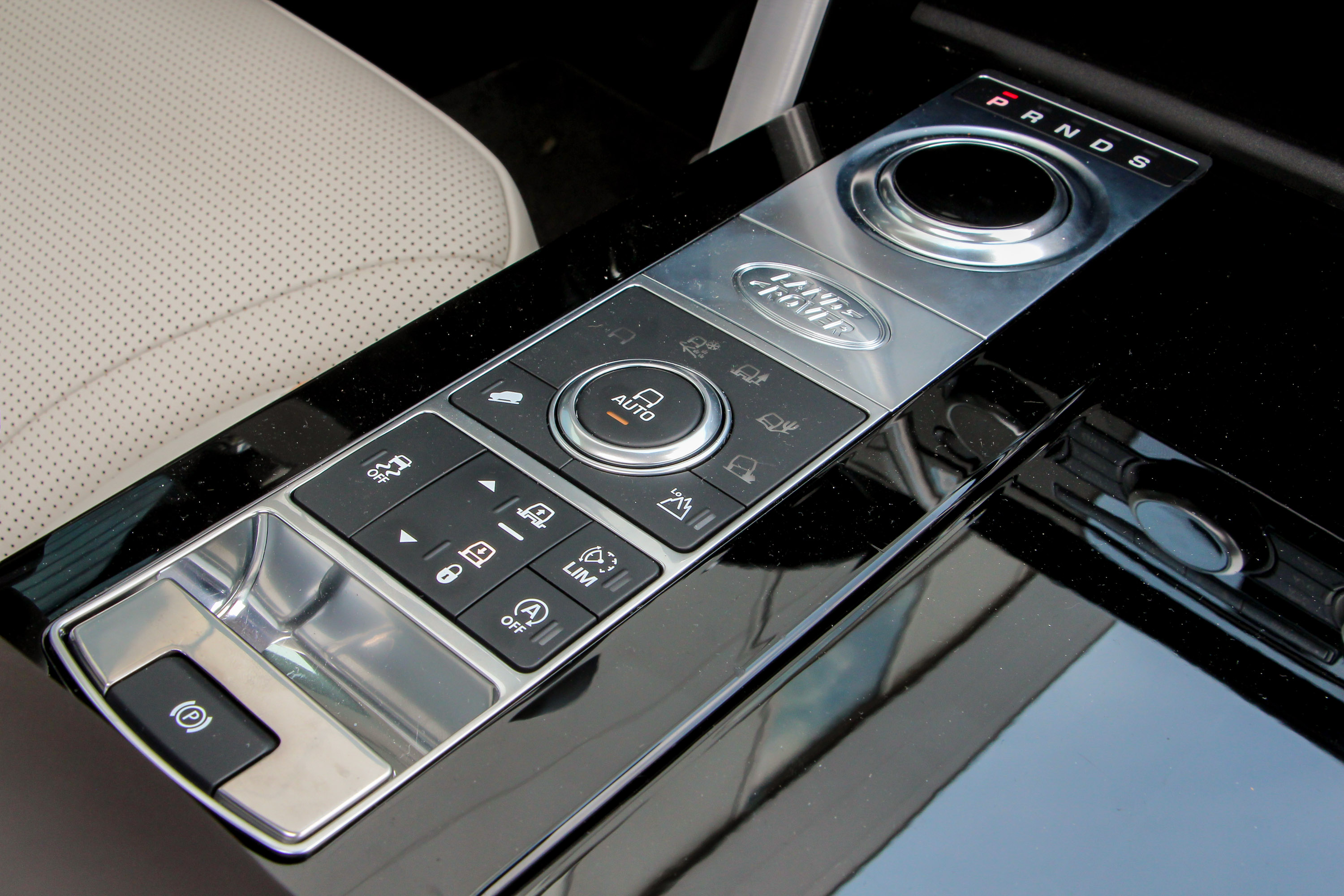 Óriási a belső szélesség elöl, de nagyon széles a középső pult, a váltókapcsoló a Jaguar-Land Rovertől megszokott kiemelkedő forgókapcsoló, hasonló a terepen hasznos menetmódválasztó is