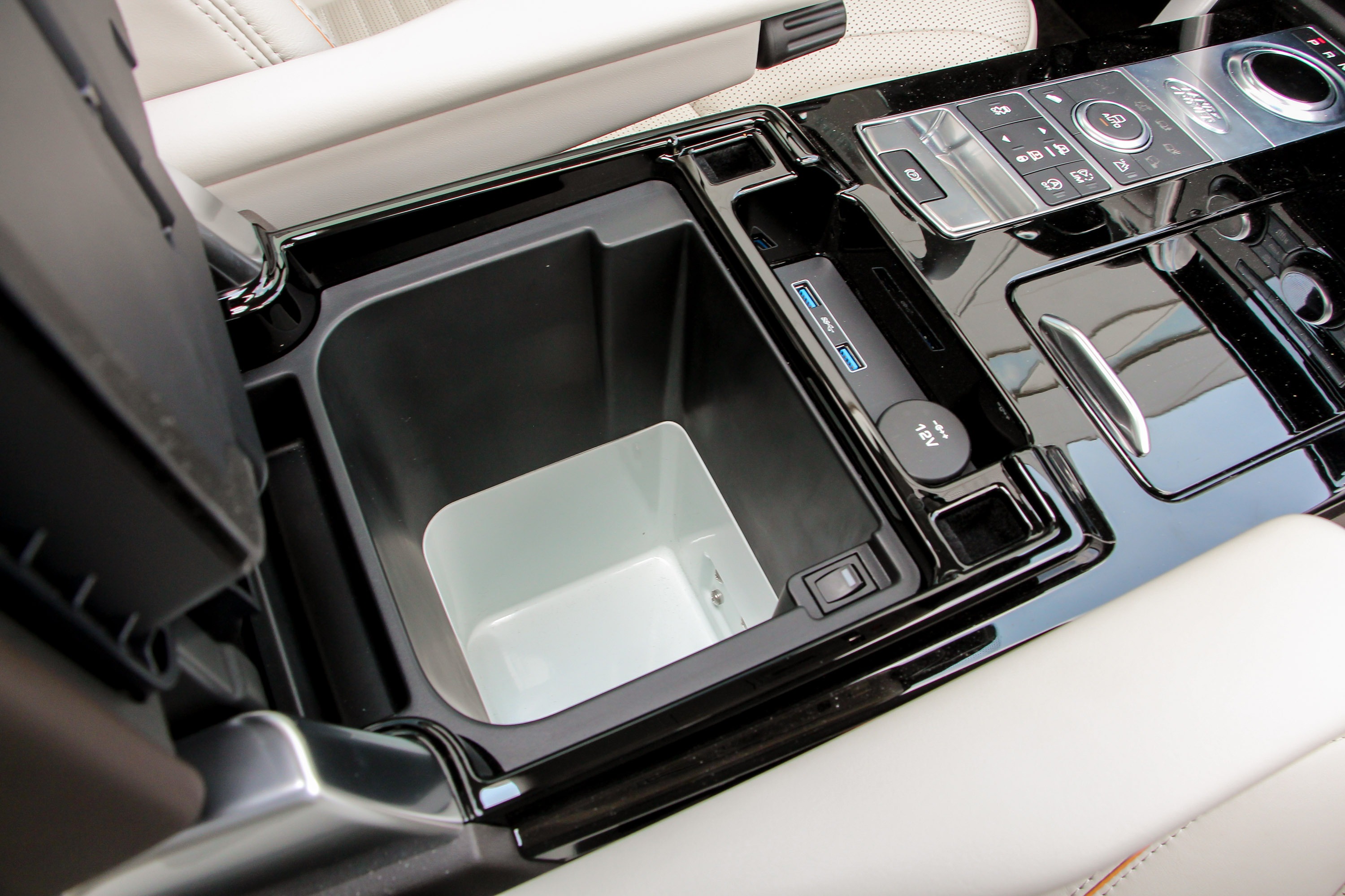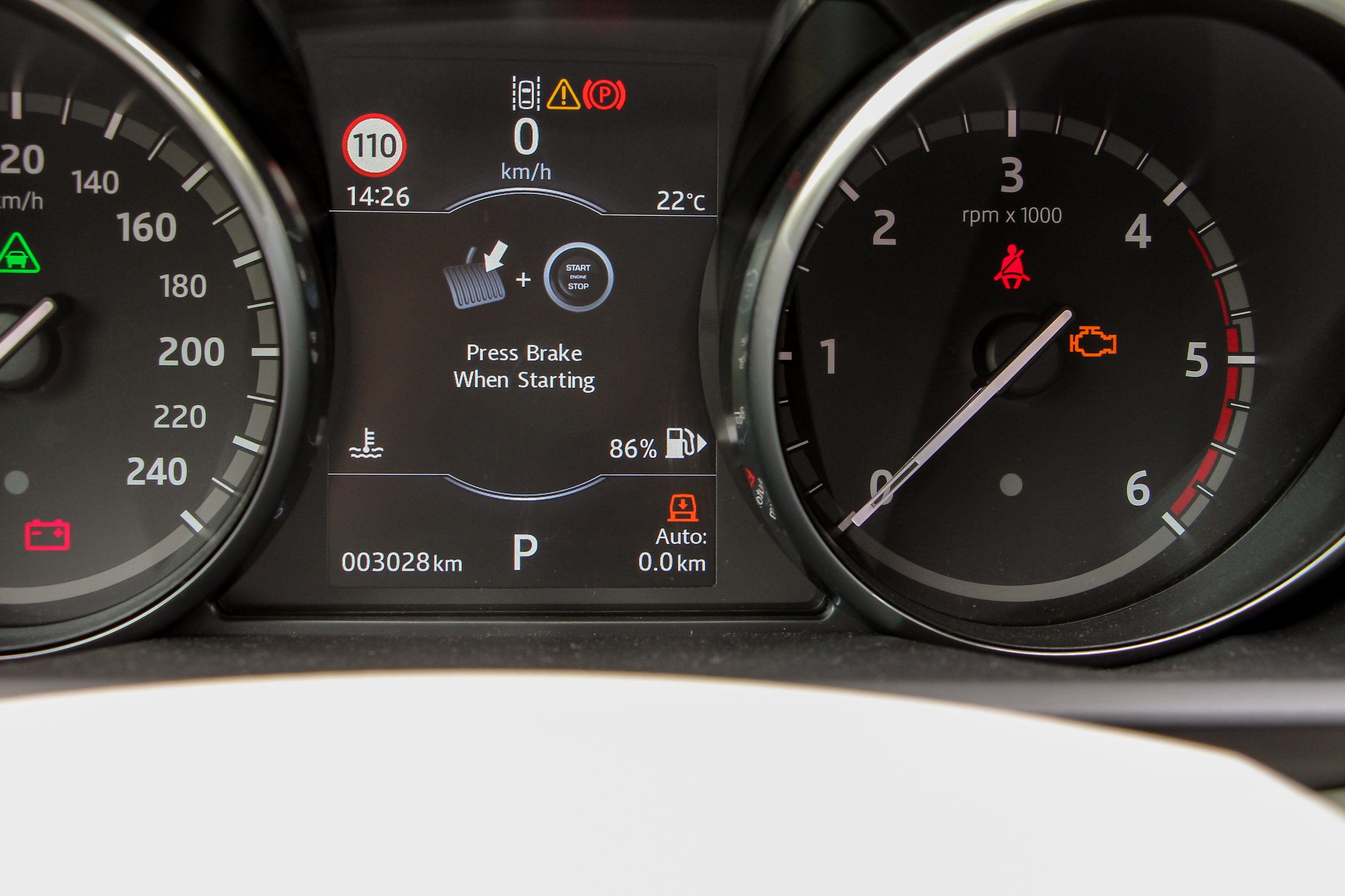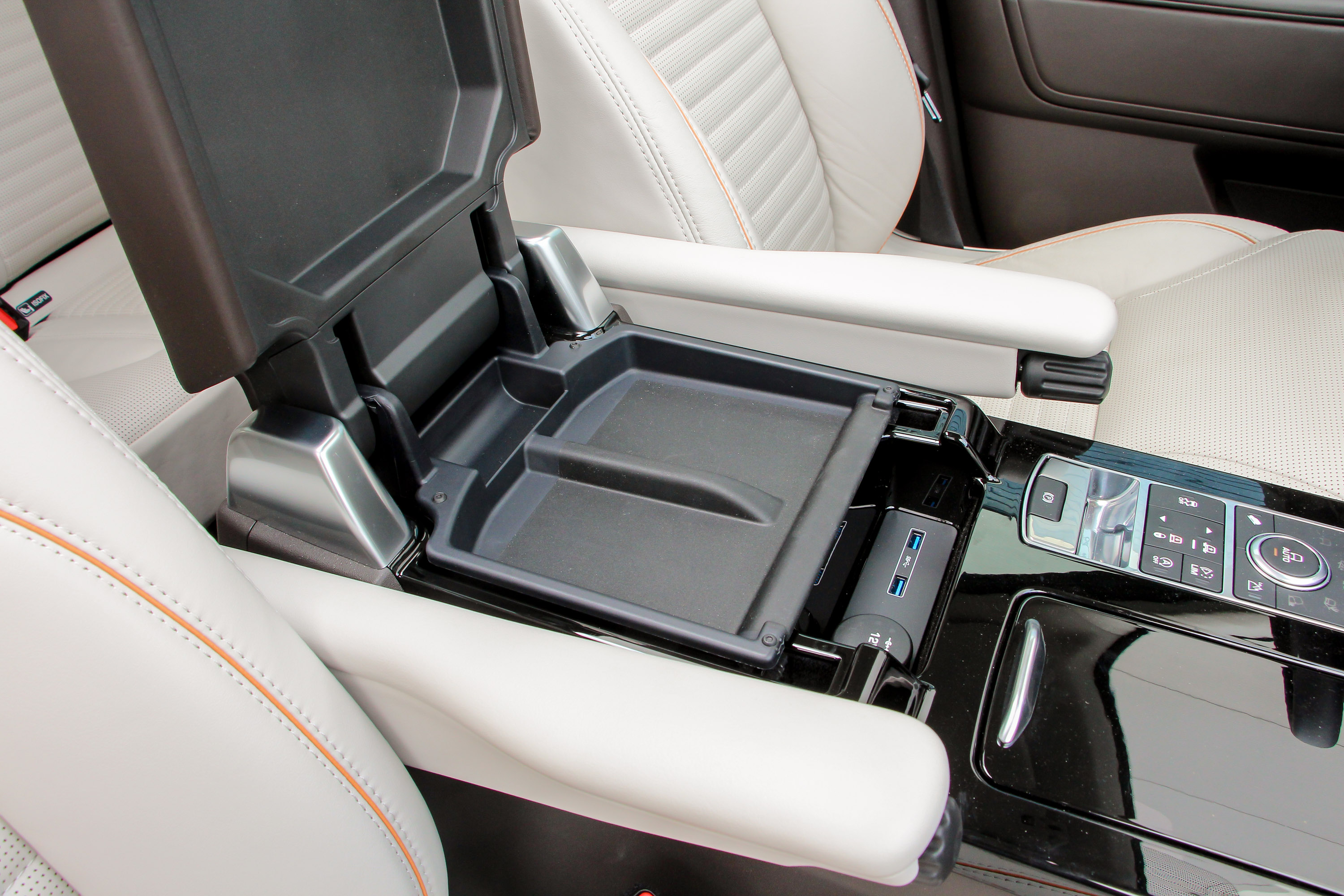 Óriási a belső szélesség elöl, de nagyon széles a középső pult, a váltókapcsoló a Jaguar-Land Rovertől megszokott kiemelkedő forgókapcsoló, hasonló a terepen hasznos menetmódválasztó is