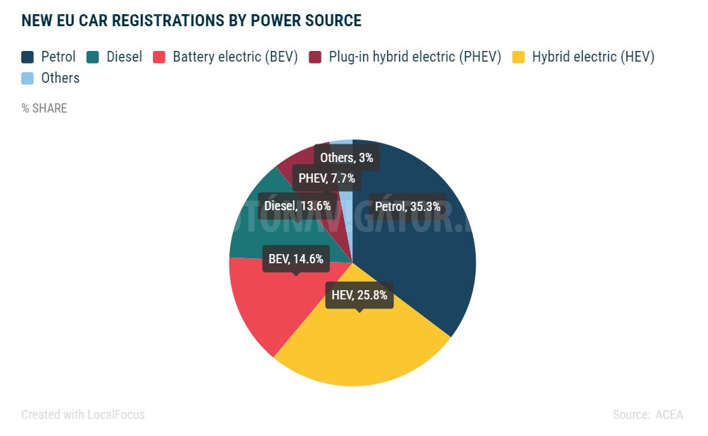 A hajtáslánc típusa szerinti megoszlás az EU-ban, 2023-ban forgalomba helyezett új autók körében (Forrás: ACEA)