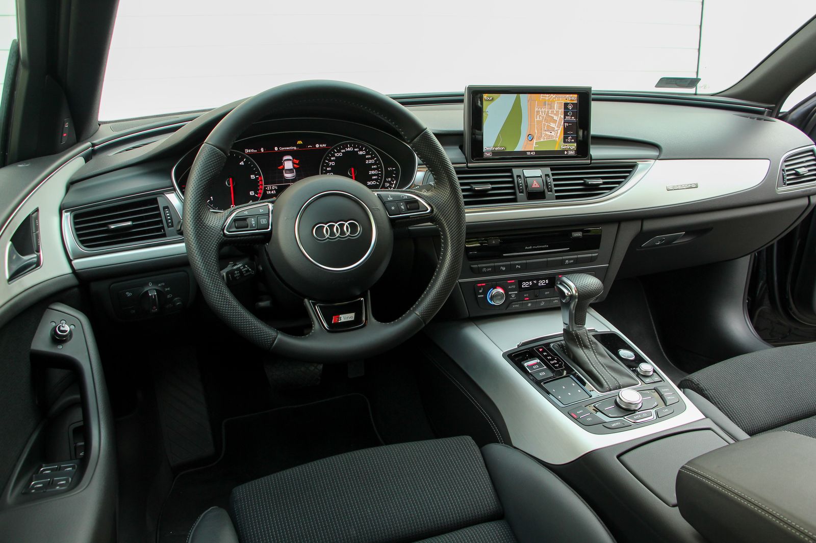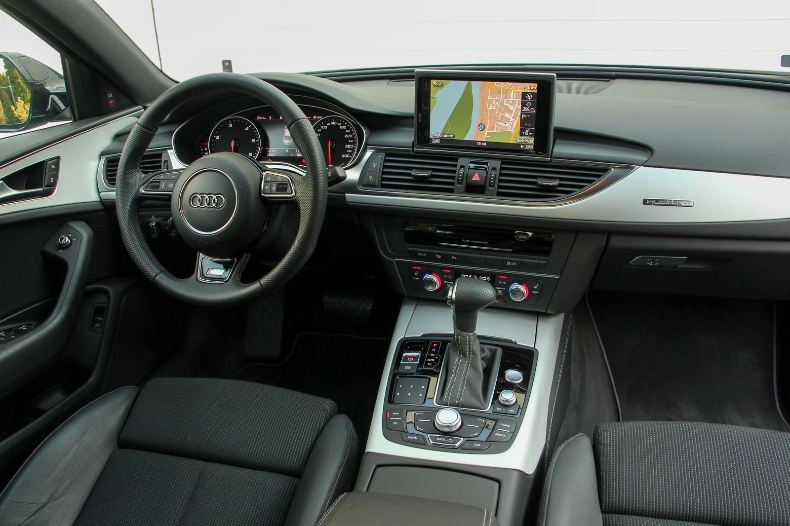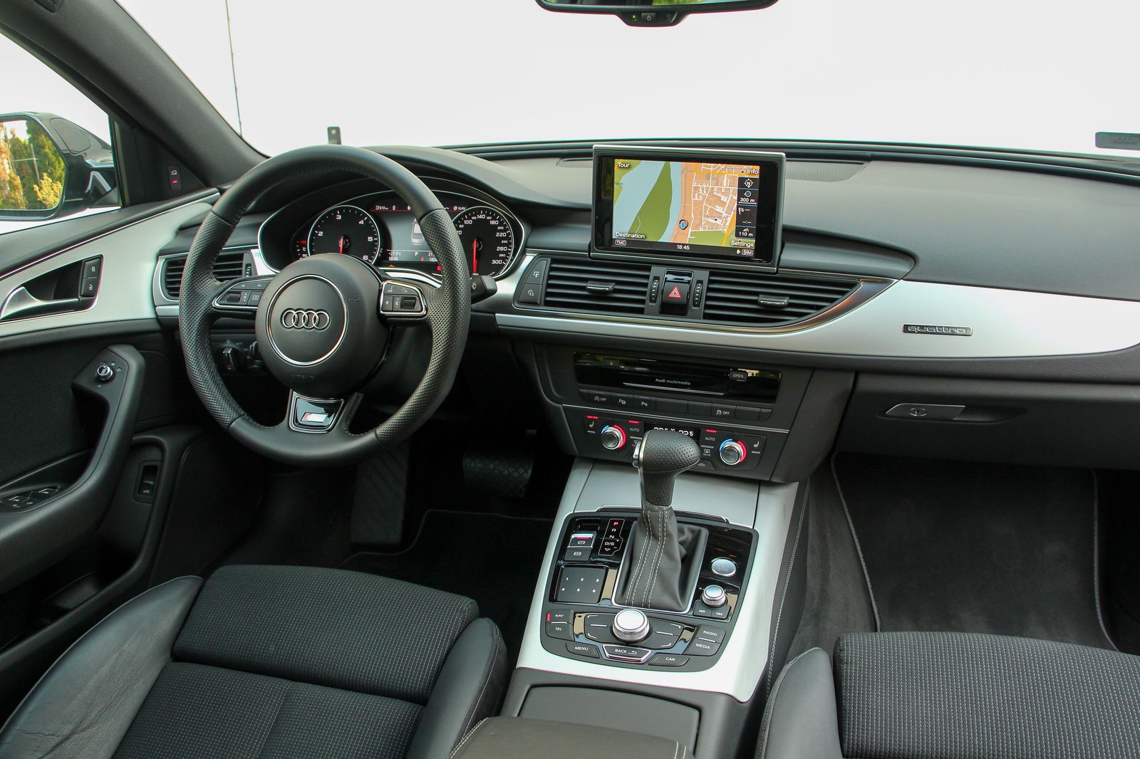 Ez a fekete épp ilyen. A másfél éves autóban még 20 ezer kilométer sincs, a fotózáskor alig több mint 18 ezer kilométert mutatott az akár a navigációt is megjelenítő műszerblokk. Rendszáma elárulja, külföldről behozott példány, kilométereinek felét még Nyugat-Európa, a hazaiaknál jobb útjain tette meg, de itthon is zömében autópályán használták. Így aztán tulajdonosa – persze a legális sebességtartományban – gyakorlatilag a gyári norma szerinti étvággyal autózik. Na jó, a 6 literes kombinált érték helyett azért a valós átlag inkább 6,5 literes, de mindenképp elképesztően jó a 3,0 literes, 245 lóerős, 500 Nm nyomatékú motortól, ami ráadásul bő 4,9 méter hosszú, csaknem kéttonnás autót mozgat, ráadásul állandó összkerékhajtással. Nem is rosszul, hiszen 100 km/órára 6,1 másodperc alatt gyorsít, s a 250 km/órás végsebességet is megfutja - mondjuk a német autópályákon.