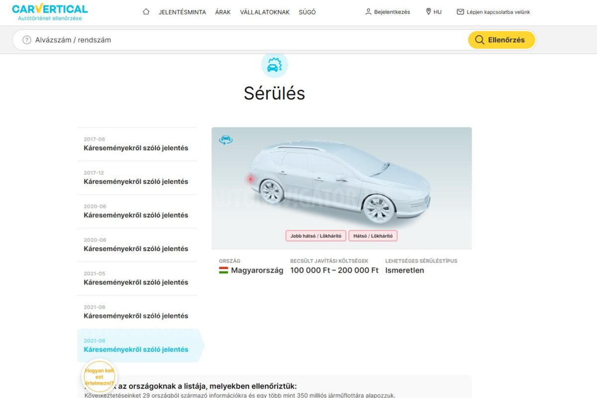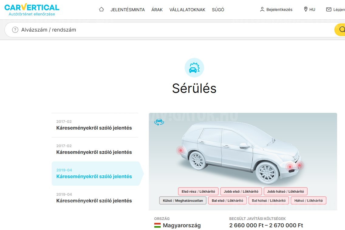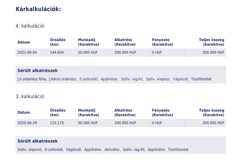 Itt a carVertical jelentéseinél sokkal bővebb információt kapunk a károkról, de csak a hazaiakról, a külföldről behozott autók múltjába nem látunk bele. A hazai - biztosítós - károk dátummal, a sérült elemek tételes felsorolásával, az alkatrészköltség és a munkadíj kerekített összegével szerepelnek. Látható továbbá az is, hogy a kárszemlét milyen óraállásnál tartották. De mint mindenhol, itt is szerepel az emberi tényező, vagyis az, hogy az óraállást csak nagyjából, vagy akár sehogy sem, netán fals értékkel írják be, mindegyikkel találkoztunk, így az óraállás hitelesítésére a kártörténeti jelentés korlátozottan alkalmas.