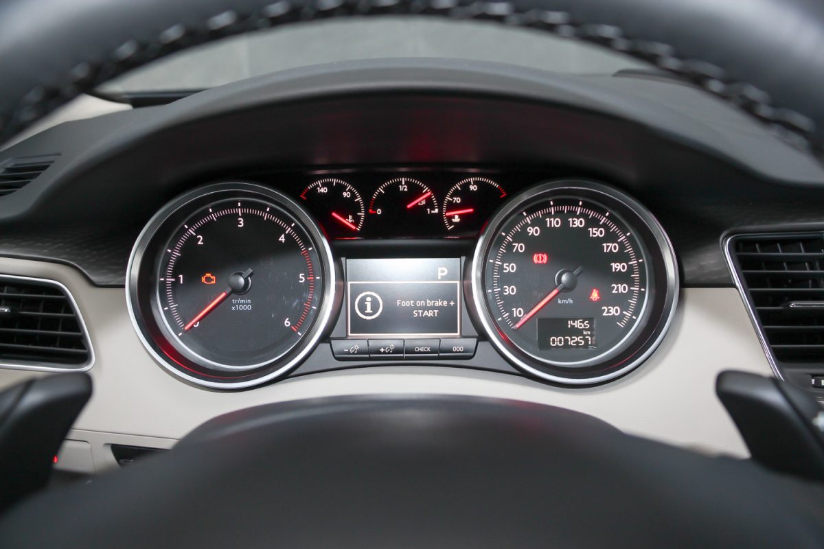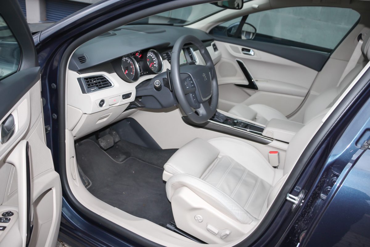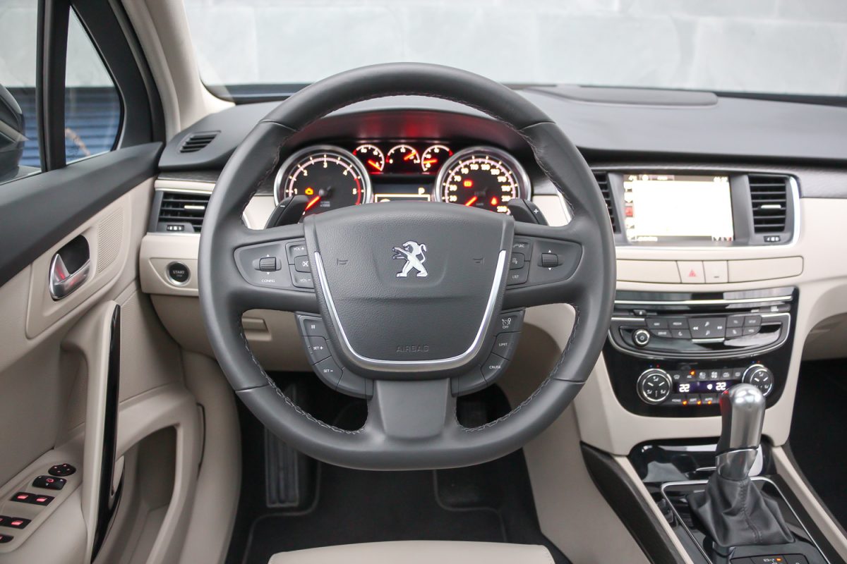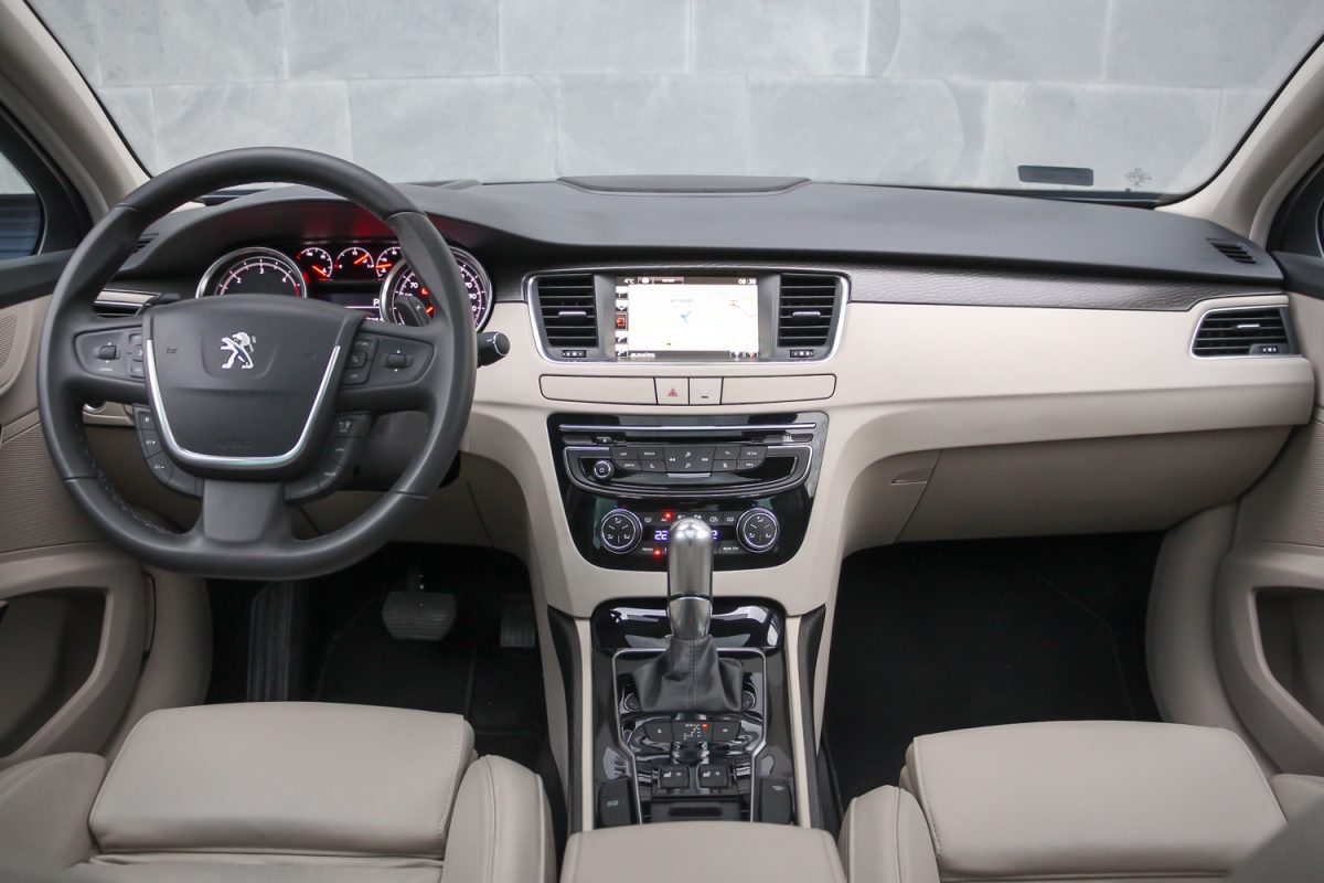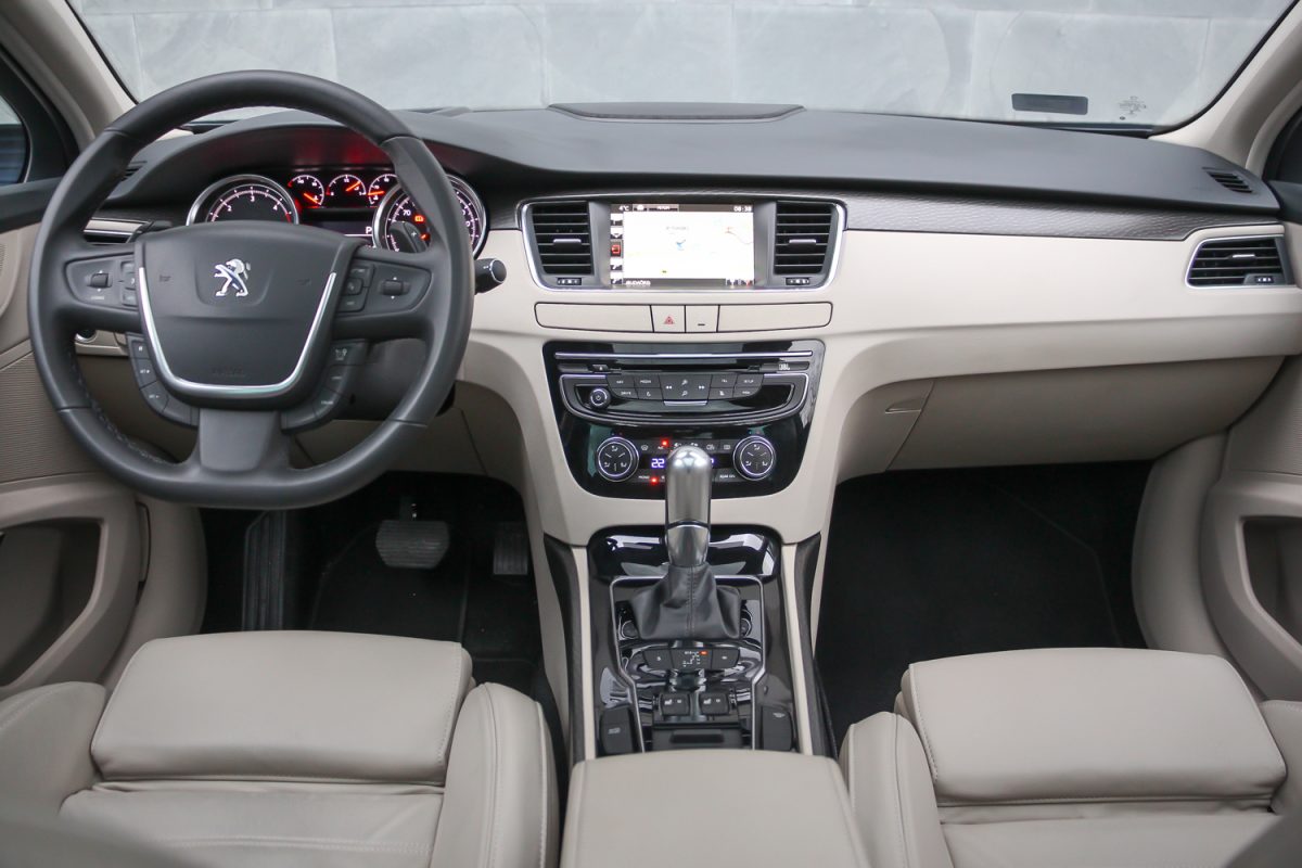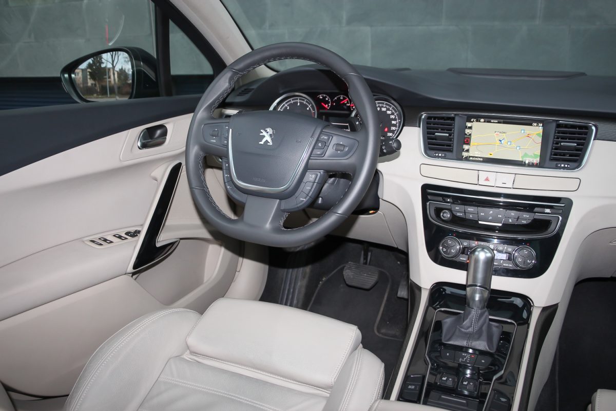 Szivarszoba hangulat. Az 508-asnak nagyon kényelmesek az elektromosan állítható deréktámaszú és kézzel állítható combtámaszos ülései. Nem sportkagyló, inkább fotelszerűen körbeölel, nagy felületű és olyan jó formájú, hogy könnyű benne helyet találni, nincs miért később fészkelődni. Eleve a vezető helye jól megtervezett, ergonomikus, a középkategóriában még ma is jó. Az állítható könyöklő és a méretes hely önmagában impozáns. A műszerfal kalligráfiája és a fehér háttér a piros mutatókkal ízléses, a legjobb Peugeot szokás szerint középen megvan a két nagy között a három kicsi óra, amik közül a vízhőfok és az olajnyomás-mérő ma már kedves és régies hangulatú részlet – annyi autóból kispórolják. A középső kombinált műszer viszont ma már idejétmúlt, egyszínű és látni a pixeleket, több kompaktba szebbet építenek már. A 7 colos és immár érintéssel vezérelhető központi kijelző sem a legfejlettebb, amit ma tud az autóipar. A navigáció képe gyatra, de megcsinál mindent, amit kell neki, magyarul is tud.