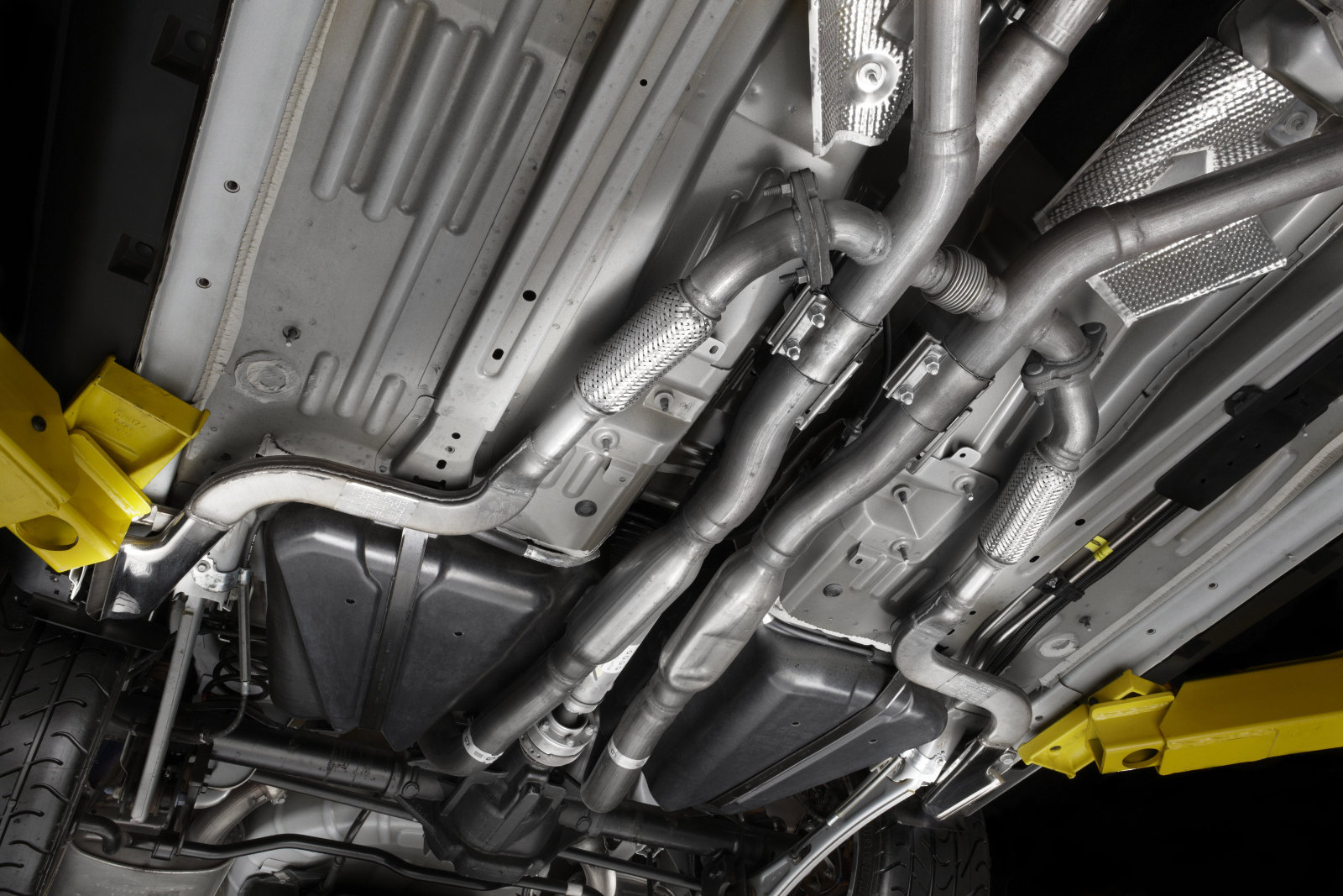 A kipufogót ellenállását nem tudták tovább csökkenteni, ezért inkább a megfelelő hanggal foglalkoztak sokat a mérnökök. Ennek köszönhetően négy kipufogója is van a Boss 302-nek. A kocsi végén lévő két cső leginkább a gázok gyors távozását szolgálja, a hátsó kerekek előtti két végződés pedig a megfelelő hangot garantálja. A gyárilag behelyezett hangtompító lemezeket könnyedén ki lehet venni, de arra is lehetőség van, hogy elektromos szelepeket – gombnyomásra állítható kipufogóhang – szereljen a tulajdonos a széria rendszerbe. Utóbbiak magától értetődően megtalálhatók a Ford tartozék-katalógusában, és akár rögtön a márkakereskedésekben is beszereltetheti az új tulajdonos.