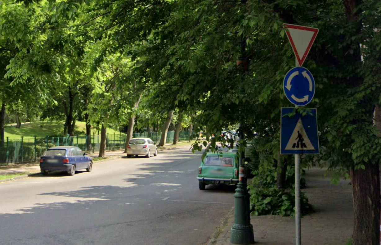 A budapesti Kós Károly téren hiába a körfogalom tábla, a képen látható autók szabályosan parkolnak, hiszen ott a felfestés. Ezt az ellentmondás az új KRESZ a mostaninál is egyértelműbben feloldhatja (Fotó: Google Maps)