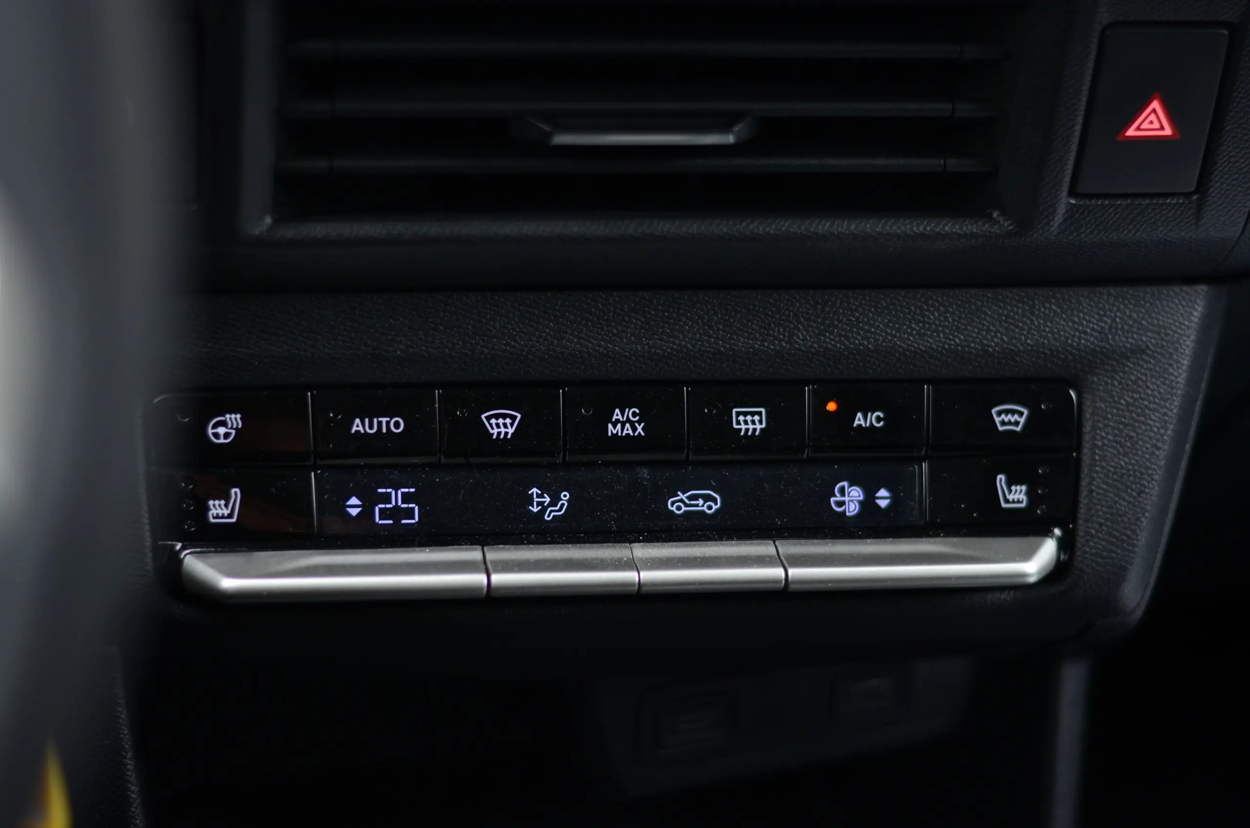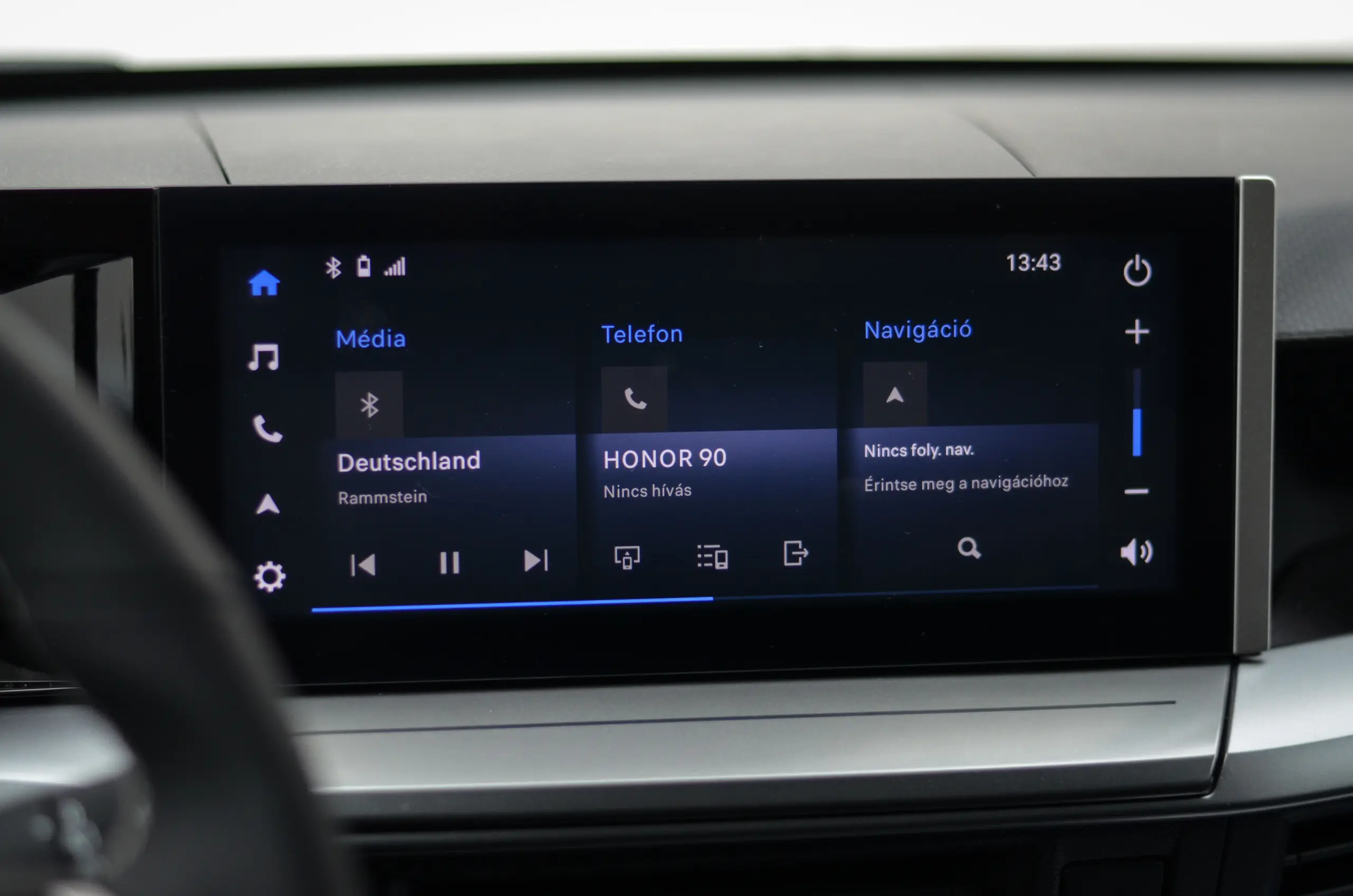 Az utastérben is igaz mindez: a két képernyő elrendezése is az Opelek stílusát hozza, ám az infotainment kijelző itt extra. Az alapáras, Edition csomaggal ugyanis csak egy fekete műanyaglap jár a helyére, amelyből egy telefontartó lóg ki. És bár túl sokat nem ad az élményhez a központi kijelző és az ezen futó rendszer, igazából nem lassú és könnyen is kezelhető, szóval lebeszélni senkit sem szeretnék róla, de én biztosan telefontartóval venném. Már persze, ha lehetne, de erre még visszatérünk. Akad viszont ennek a megoldásnak egy sokkal komolyabb előnye is, hiszen hogyha extra a képernyő, akkor nem lehet a tabletre száműzni a klímavezérlőt. Így egy különálló, nyomógombos, szegmenskijelzős egység is belefért a csomagba, ami számomra egy hatalmas pozitívuma a Fronterának.