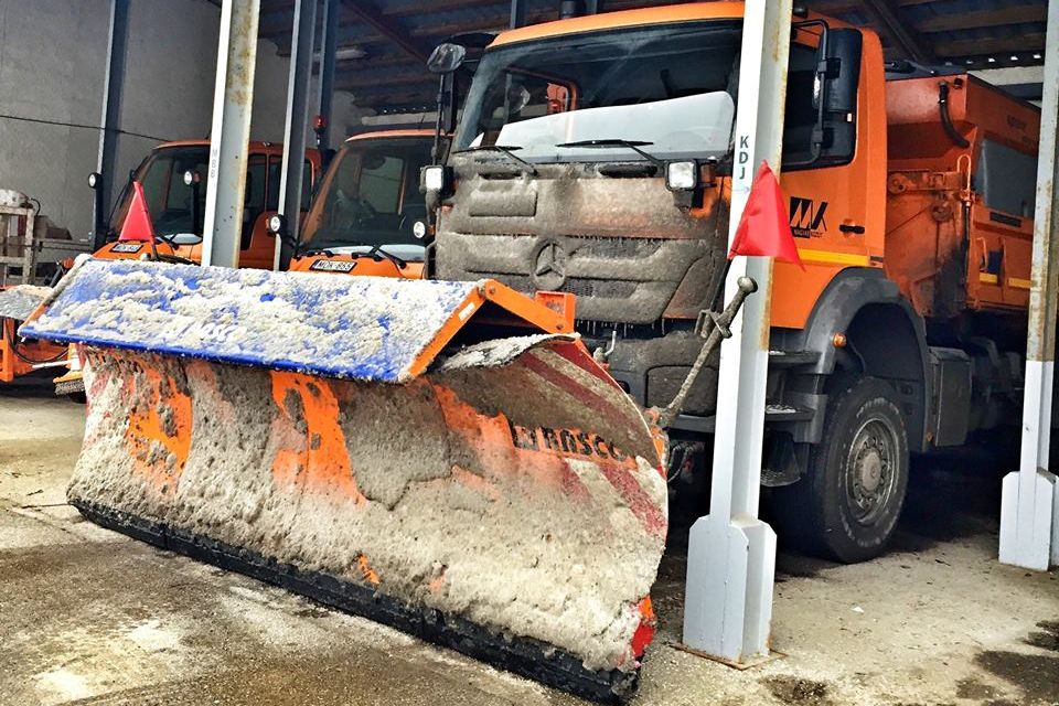 A Magyar Közút hókotrója a szentendrei mérnökségen, miután visszatért a pilisi utak takarításából. Minden utcába természetesen még nem tudtak eljutni a hókotrók. Azok takarítása nem is a Magyar Közút feladata, utóbbi csak a települések közötti útvonalakért, és a főutak településeken átvezető részéért felel