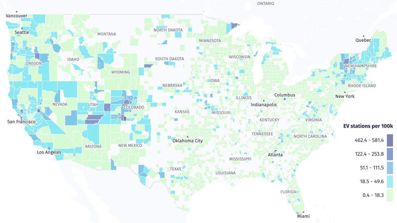Egy friss térkép arról, hogy az USA egyes megyéiben hány villanyautó-töltő jut 100 ezer főre: biztos olyan jó a villanyautósok helyzete az Egyesült Államokban? (Forrás: HERE)