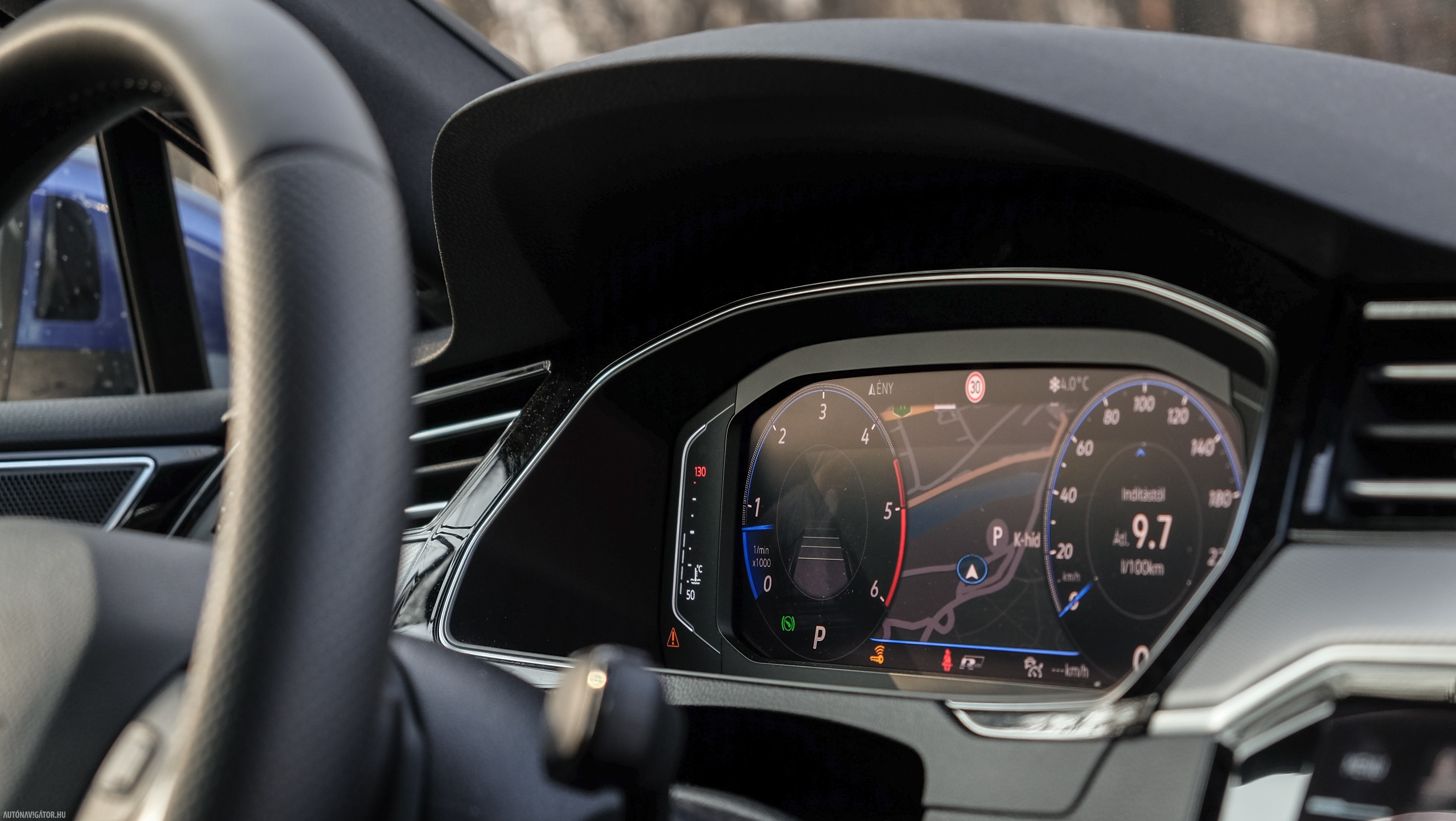A multimédia amúgy is az egyik legjobb pont a Passatban. Az integetéses oldalváltás nekem kicsit fura, pláne, hogy csak a Home képernyőn kell így, máshol működik az érintős oldalváltás. Temérdek beállítási lehetőséget találunk, és mivel már minden Passat online kapcsolatos, külön menüsort találunk arra is, mit kívánunk megosztani a felhővel, milyen funkciókat engedélyezünk az egyelőre Samsung okostelefonos, okoskulcsos applikációnak. Látványos és temérdek információt adó a virtuális műszeregység, ez is elég nagy százalékban személyre szabható, órákat lehet eltölteni egy ilyen Passat beállításaival, ami után tényleg úgy fogjuk érezni, hogy a kedvünkben jár. Apróság, de mindenképp kiemelném az elektromos csomagtérnyitást, láblendítésre is működik, de a lényeg, hogy gyorsan és halkan mozgatja a fedelet, ami messze nem annyira egyértelmű ma az autóiparban, a VW-nek ez is kimondottan jól megy.