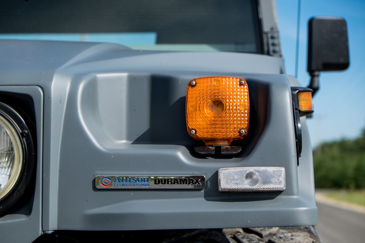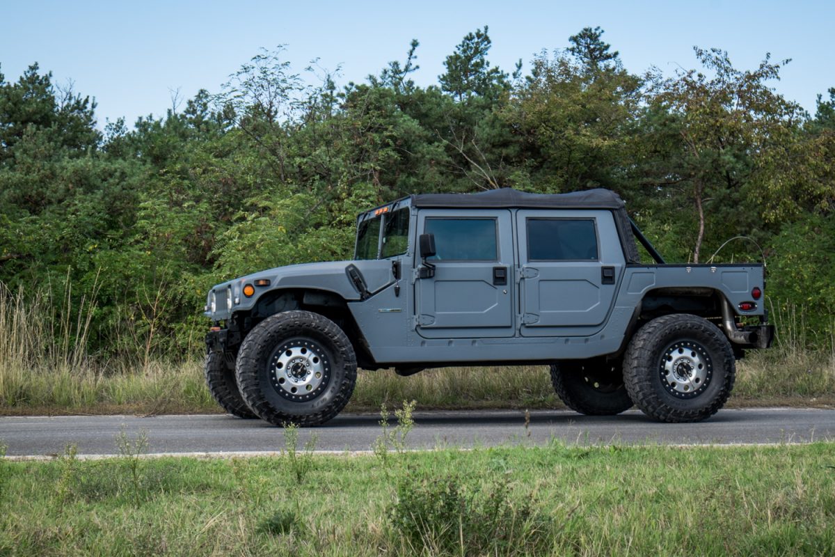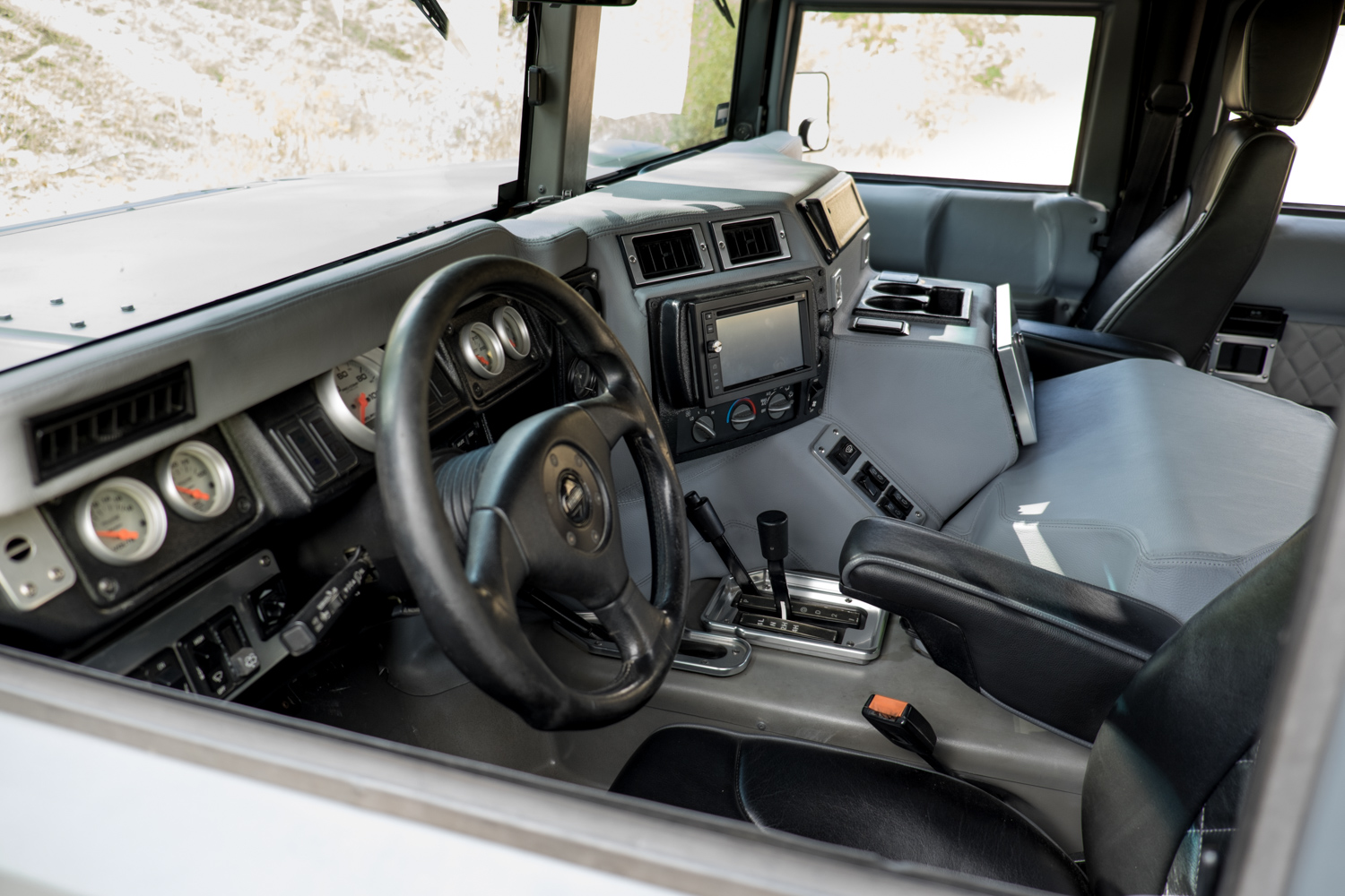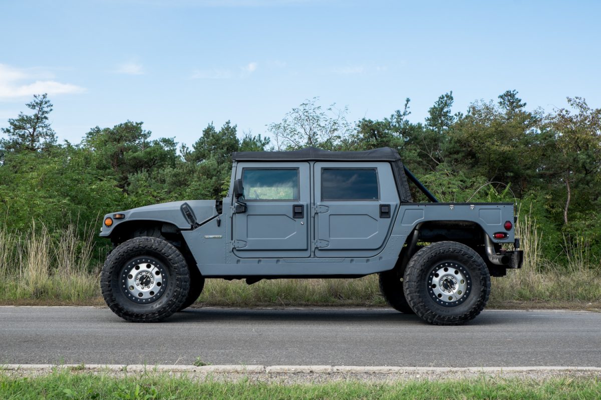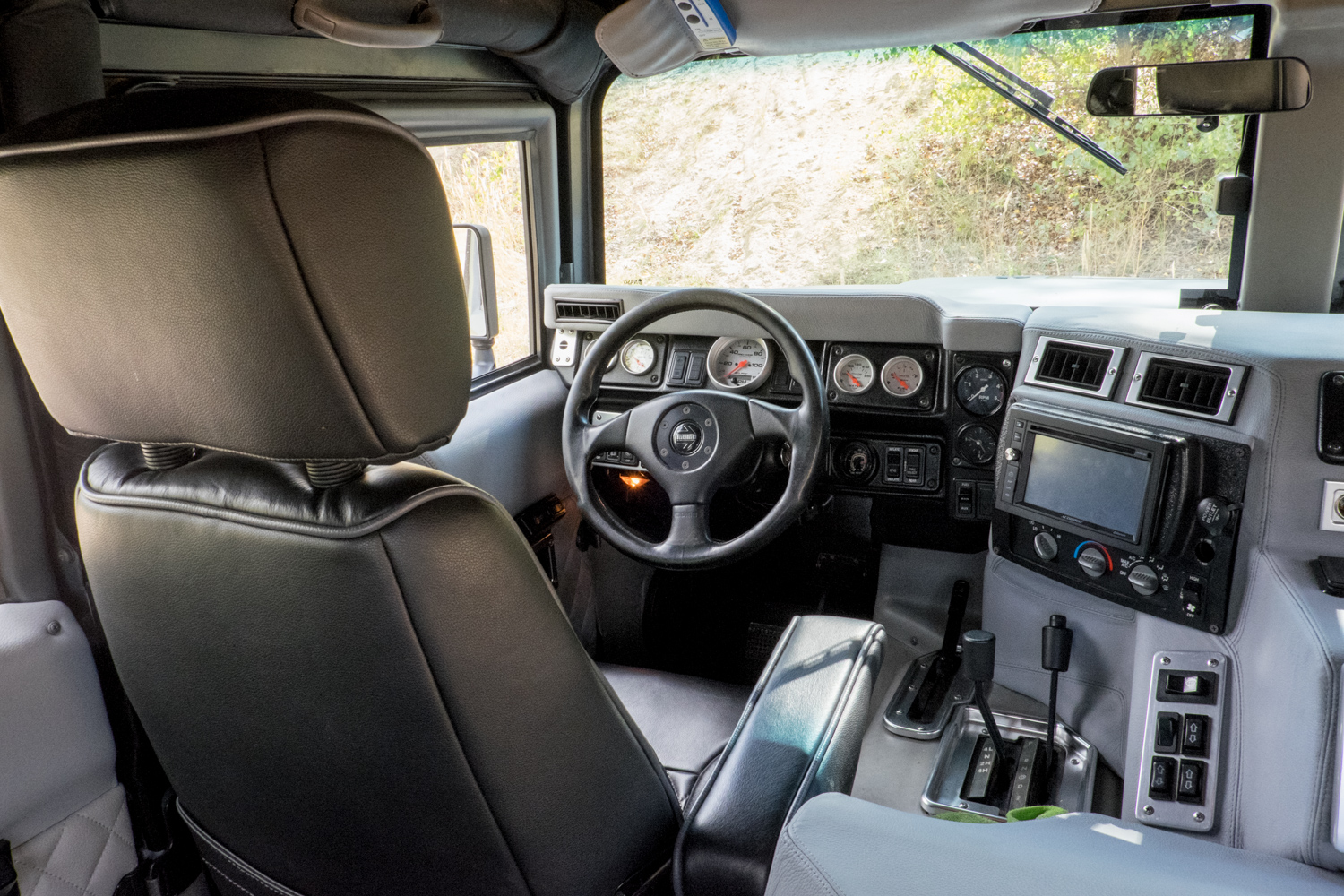 Amerikából érkezett, ahol sárgára fényezve gurult ki az AM General gyárából, itthon teljes felújításon esett át, aminek során a puritán beltéren is változtattak. A külsőhöz passzoló szürke bőrbe húzták a lehető legtöbb alkatrészt, megtartották a gyári üléseket, de rombuszmintás bőrhuzatot kaptak. Nem tolták túl, épp csak egy kis luxust kapott a kényelem jegyében, valamikor korábban kapta a Momo kormányt és az utólagos körműszereket is, amik közül a benzinszintjelző folyton mozog, így nehéz belőni, pontosan mennyi lé van még az aktuálisan kiválasztott tankban. Ugyanis abból is kettő van, egy 95 és egy 65 literes, külön betöltőkkel, szintén egy gombbal válthatunk közöttük. Hajtáslánca már nem teljesen az eredeti, bár a 6,6 literes Duramax V8-as dízelt szerelték a H1-be, de csak az utolsó, 2006-os Alpha szériába, az 5 fokozatú Allison automata váltóval együtt. A gyárilag 305 lóerős motor még Amerikában kapott egy kis pöckölést, így most nagyjából 370 lóerőt teljesít.