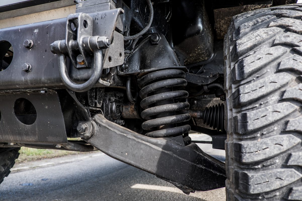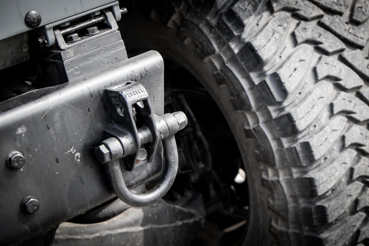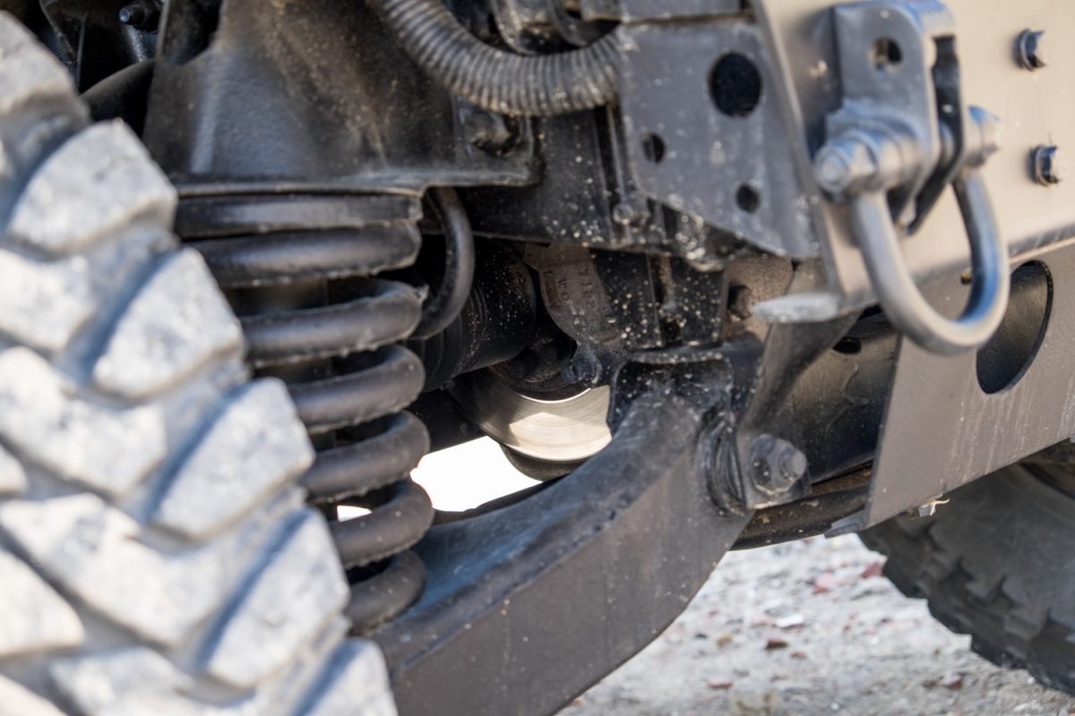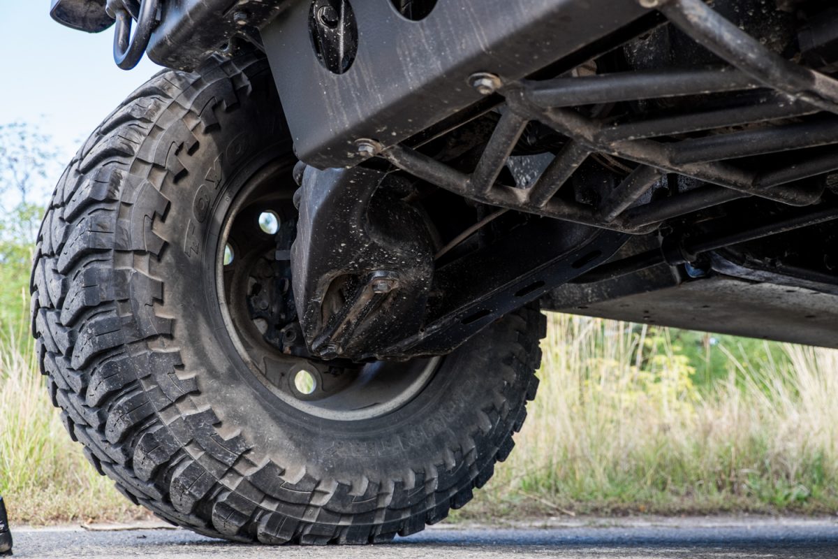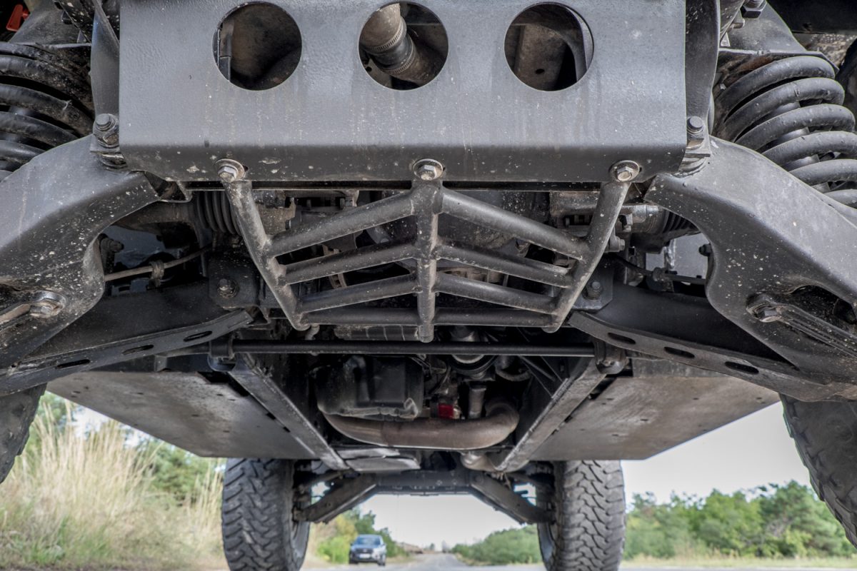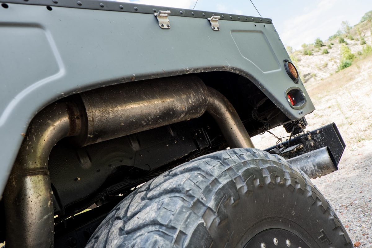 Az új motor miatt meg kellett emelni a géptetőt, ezért nem látszanak az emelőszemek. A gumik épp nem lógnak túl a karosszérián, de így is közel függőleges terepszöge van