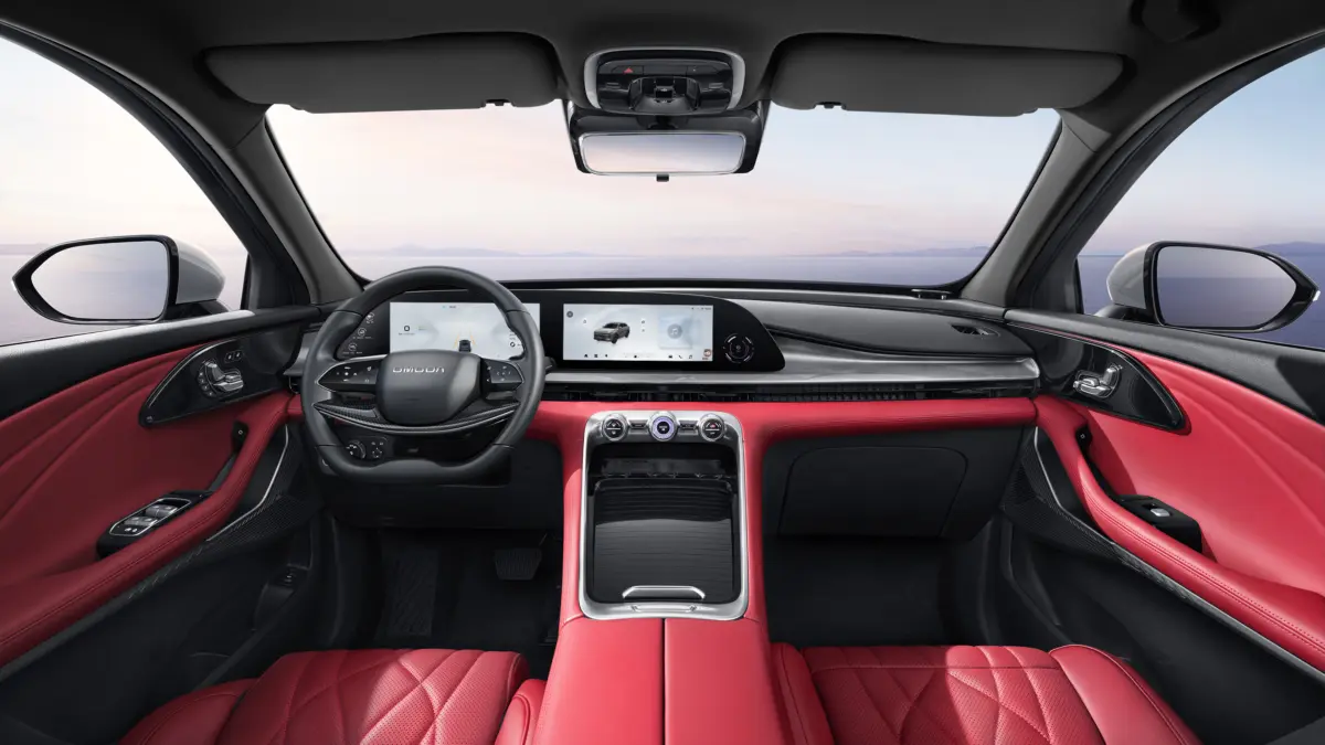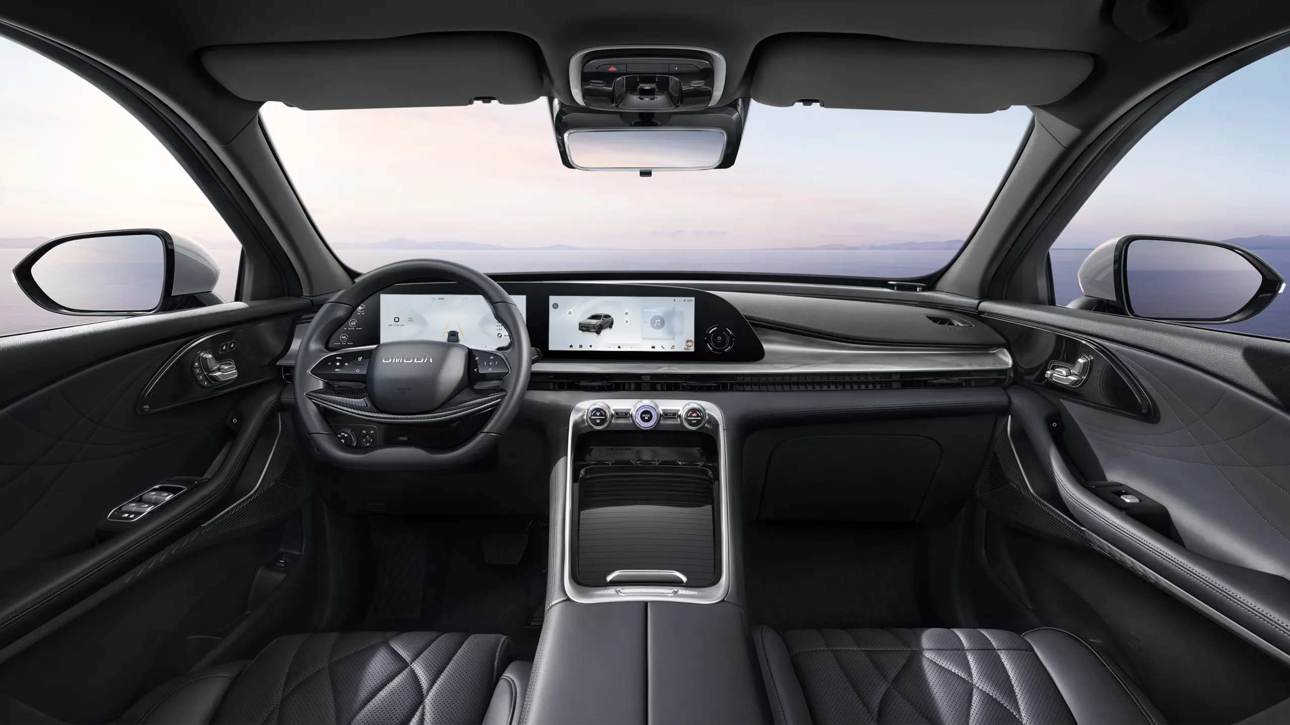 A műszerfalon két 12,3 colos kijelző található egymás mellett. Magyarországon bordó, vagy fekete kárpitozással lehet rendelni az Omoda 9-est.