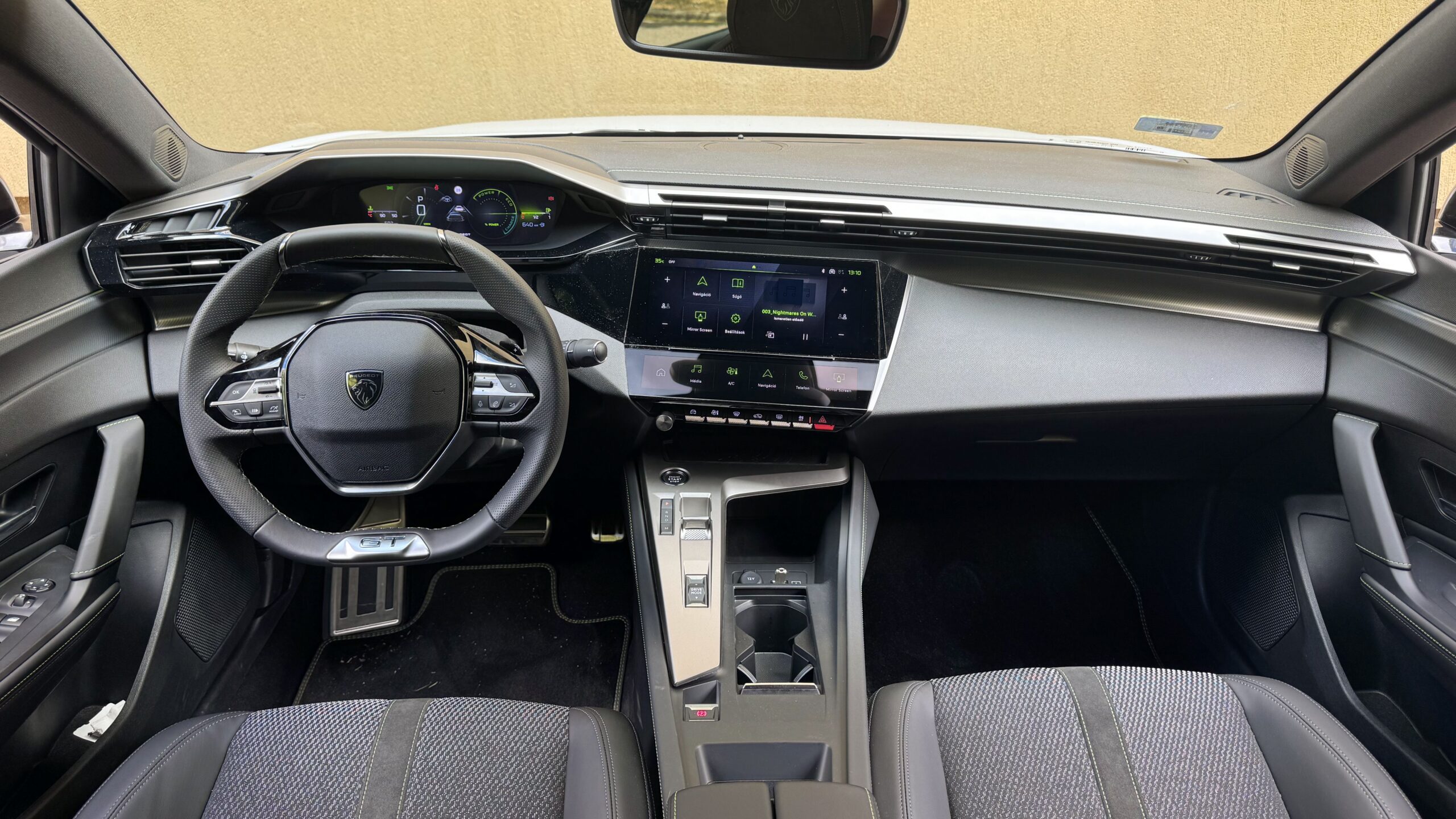 Ugyanakkor a leginkább lényeges dolog az autó orrában rejlik: a 48 voltos lágy hibrid motor, pontosabban hajtáslánc. Mert a benzinmotor az 1,2 literes, háromhengeres egység, amelyet már módosítottak a kezdeti problémák után és a 408-ban arra is ügyeltek, hogy a hangját jól elrejtsék. Nagyon ritkán, hirtelen vehemens gyorsításkor jön csak elő, de amúgy rendkívül csendes és kellemetlen rezonanciák sem jutnak el az utastérbe. Szóval a 136 turbó lóerő mellé társul még a 29 lovas villanymotorocska, amit egybeépítettek a 6 fokozatú automatikus sebességváltóval. A rendszerteljesítmény így 145 lóerő és 230 Nm. A 0,43 kilowattórás akkumulátor pedig csak 12 kilót nyom, az autó üres tömege nem haladja meg az 1,6 tonnát.
