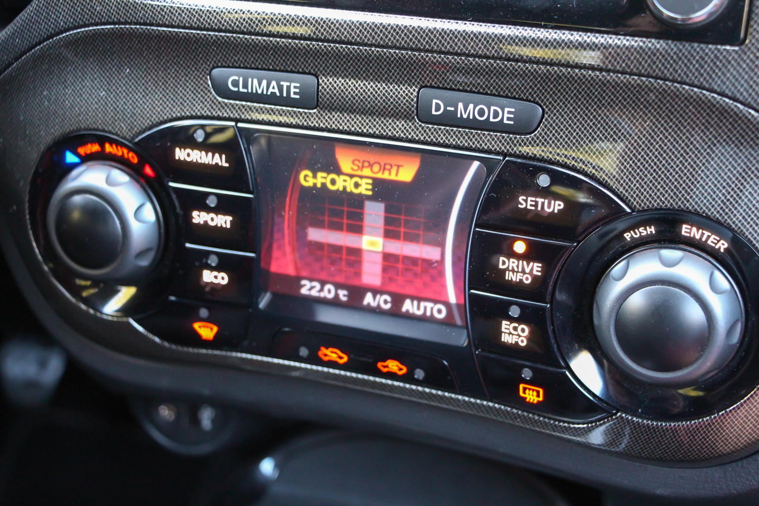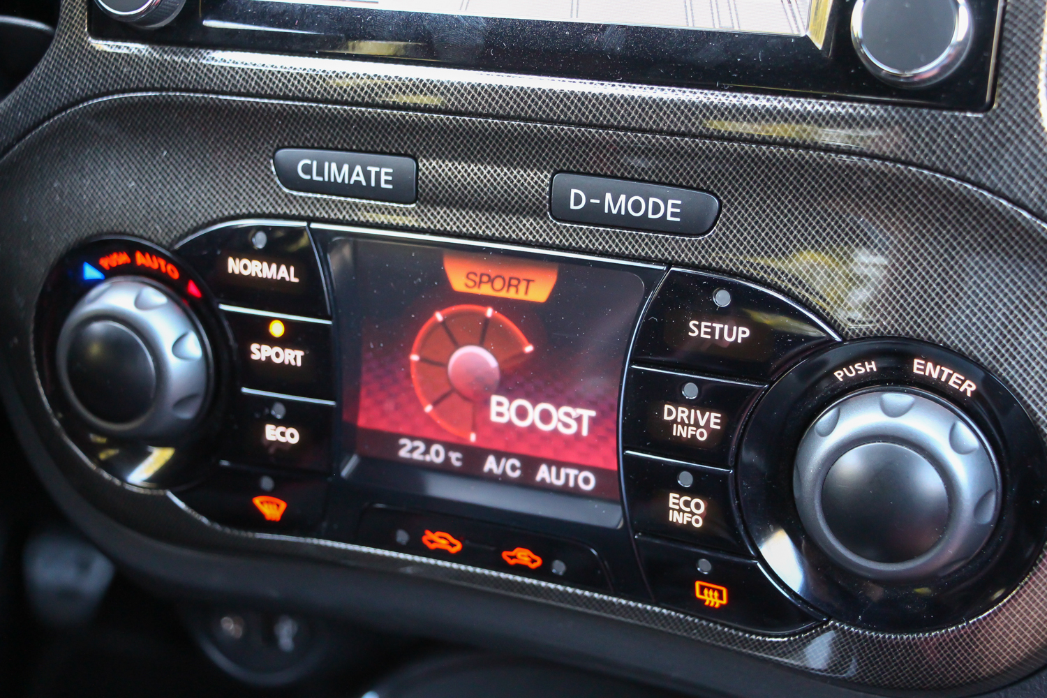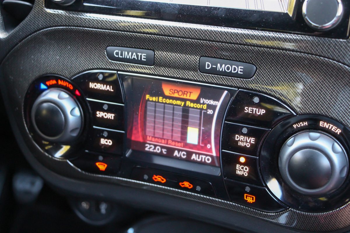 A Juke Nismo RS egérmozija ma is mókás. Alapból klímapanel, a D-Mode gombbal meg sportkijelző, ahol menetmódot is lehet váltani, motorerőt adagolni