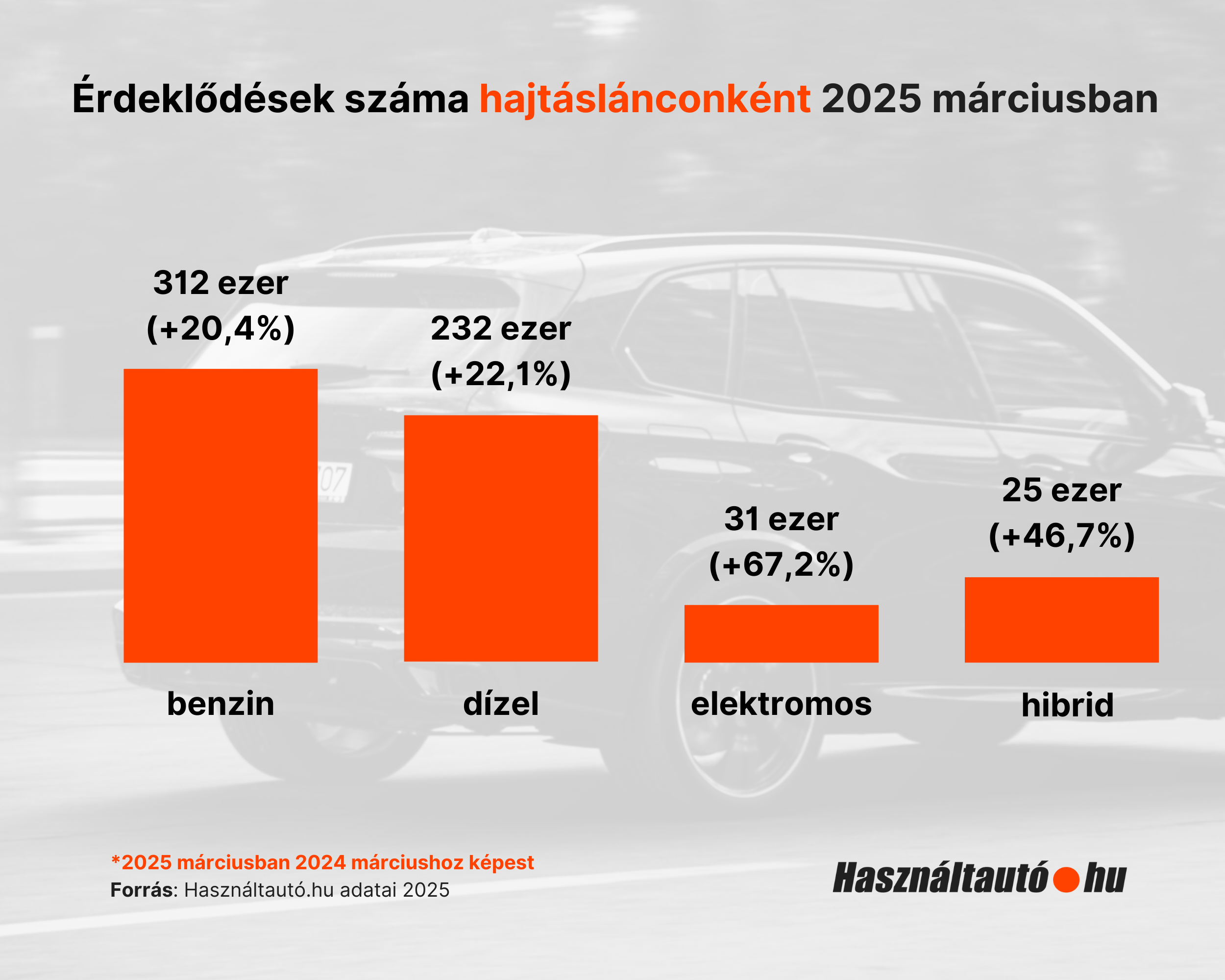 2025 márciusa kiugró keresleti adatokat hozott. Az idei évben az átlagárak 6,6%-os emelkedése mellett a használt autók iránti kereslet kivétel nélkül minden hajtáslánc esetében növekedett, összesítve 23,8%-kal. Tovább erősítette a piac bővülését a meghirdetett autók számának szintén 6,6%-os növekedése is, hiszen így még több lehetőség közül választhatnak az érdeklődők. Benzines autók esetében az érdeklődők száma 312 ezer volt, ez 20,4%-os növekedés. A dízelautók iránti kereslet 22,1%-kal nőtt, összesen 232 ezer megkeresés érkezett márciusban Az elektromos hajtásláncú járművek iránti kereslet kilőtt, itt 67,2%-kal többen érdeklődtek, mint tavaly, ez összesen 31 ezer megkeresést jelentett, hibrid autók esetében 25 ezer megkeresést regisztráltak, ami 46,7%-os növekedést jelent. Ha a kivitelek népszerűségét vizsgáljuk, a toplista változatlan, a ferdehátú, SUV és kombi autók népszerűsége töretlen, itt is inkább az egyes kategóriák növekedésének mértéke beszédes adat. Ferdehátú járművekre 200 ezer megkeresés érkezett 2025 márciusában, ez 19,3%-os növekedés. A márciusi toplista legnagyobb nyertesei a SUV-ok, a 102 ezer érdeklődő 36,4%-os növekedést jelent, ezzel megelőzték a kombikat a legkeresettebb kivitelek listáján. Kombik esetében a növekedés 22,9%-os volt, így összesen 97 ezer megkeresés érkezett, míg a szedánok és egyterűek esetében a növekedés mértéke 20% körüli, és az egyterűek is sokkal népszerűbbek lettek tavalyhoz viszonyítva: esetükben 29,3%-os volt az érdeklődés növekedése. Összegezve az adatokat, látszik, hogy a használt autók piaca kiemelkedően jól teljesített márciusban, ezt Koralewsky Márk, a Használatutó.hu üzletágvezetője is megerősítette. "Március mindig is erős hónap volt a növekedés szempontjából, de 2025-ben ez különösen igaznak bizonyult. A látványos bővülés mögött számos gazdasági tényező húzódik meg, például az állampapír-kifizetések és a munkáshitel hatása. Emellett a feltöltött hirdetések számának növekedése is hozzájárult a dinamizmushoz, hiszen a bővülő kínálat révén több vásárló találhatja meg az igényeinek megfelelő járművet.”