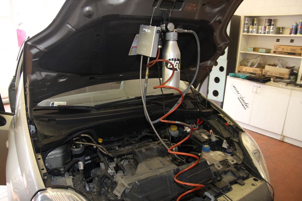 Kompresszor nyomására, speciális tartályból, egy adapteren keresztül jut a szívócsonkba a tisztító adalék