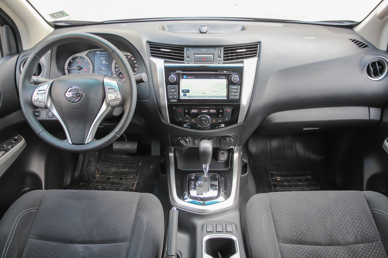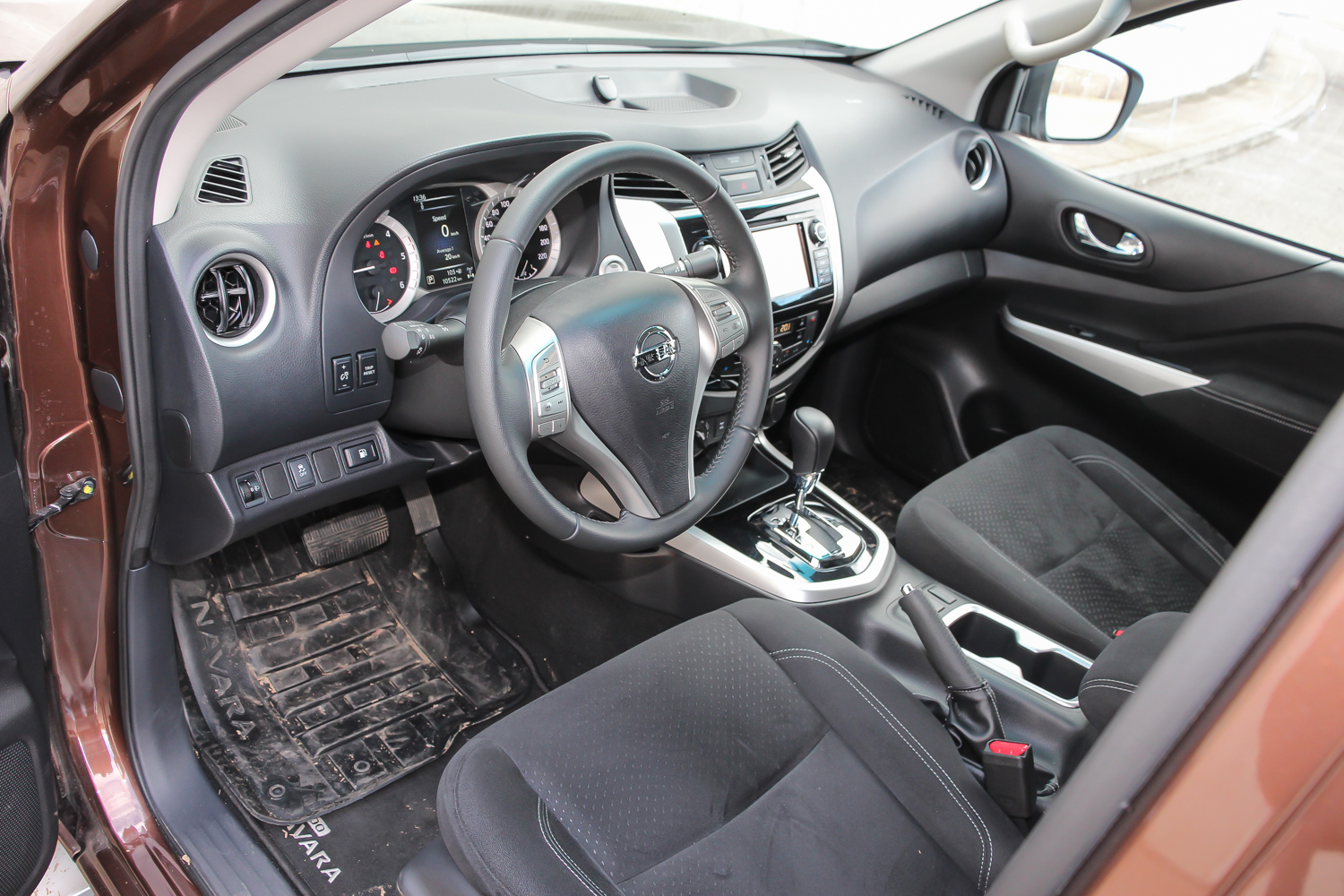 A Navarának elég sokat kell tekerni a kis kormányán, ami ránézésre ugyanaz, mint a legtöbb másik Nissanban. Nézzük csak; Qashqai, X-Trail, Pulsar - tényleg egyformák. A méretezés picit fura és a visszatérítő erő sem a legjobb a kormánykerék első harmad fordulatán. A könnyű szervokormány egyben túlzottan elfeledteti, hogy egy kis híján üresen is kéttonnás és 5,33 méter hosszúságú hajót navigálunk. Városban szerintem elsősorban a mérete miatt nagyon fölösleges lenne egy ilyen jellegű és ekkora autóval járni, de a lényeg, hogy a Navara mindig ott van, mint jó mindenes.