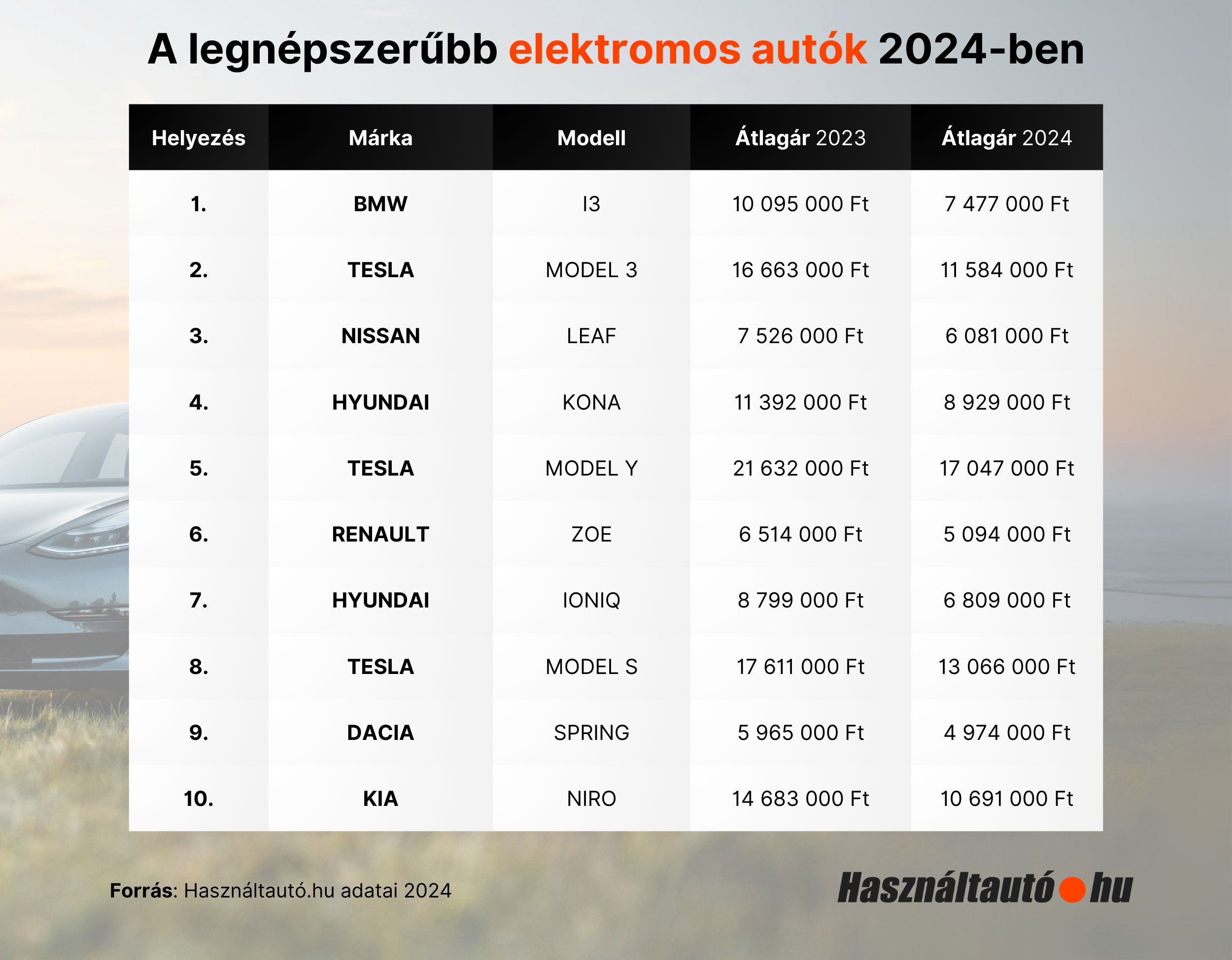 Ennek legfőbb oka a drasztikus árcsökkenés: a népszerűségi rangsort vezető BMW i3-asnak például több mint 2,5 millió, egy Nissan Leafnek megközelítőleg 1,5 millió, egy Tesla Model 3-nak pedig több mint 5 millió forinttal csökkent ez idő alatt az átlagára!