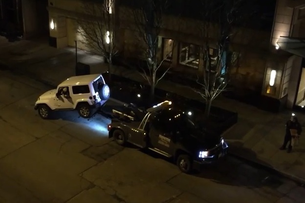 Két kerékkel a levegőben nem sok esélyed marad már, el lesz szállítva az autód. Vagy mégsem? A fehér Jeep sofőrje nem adta fel.