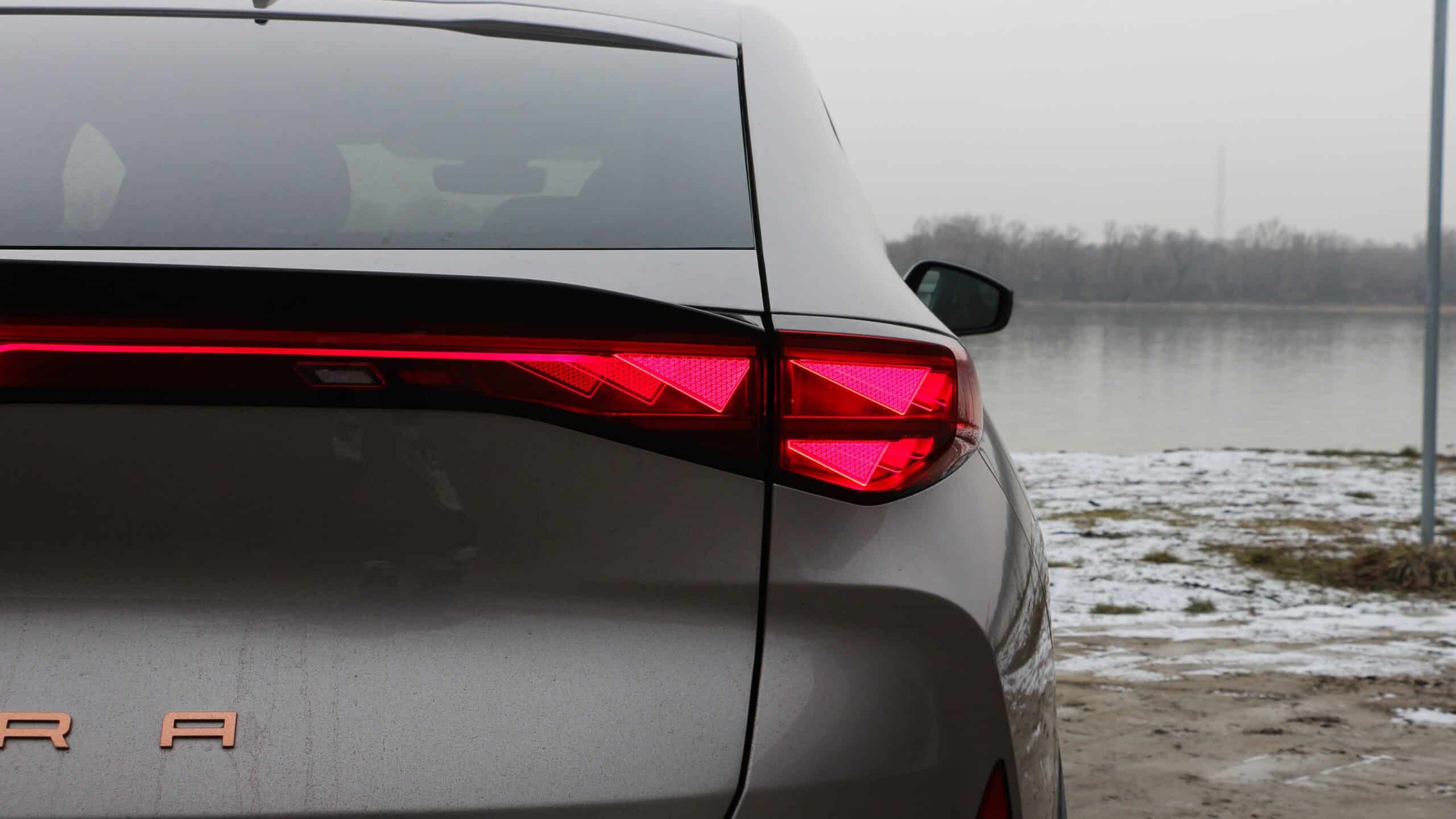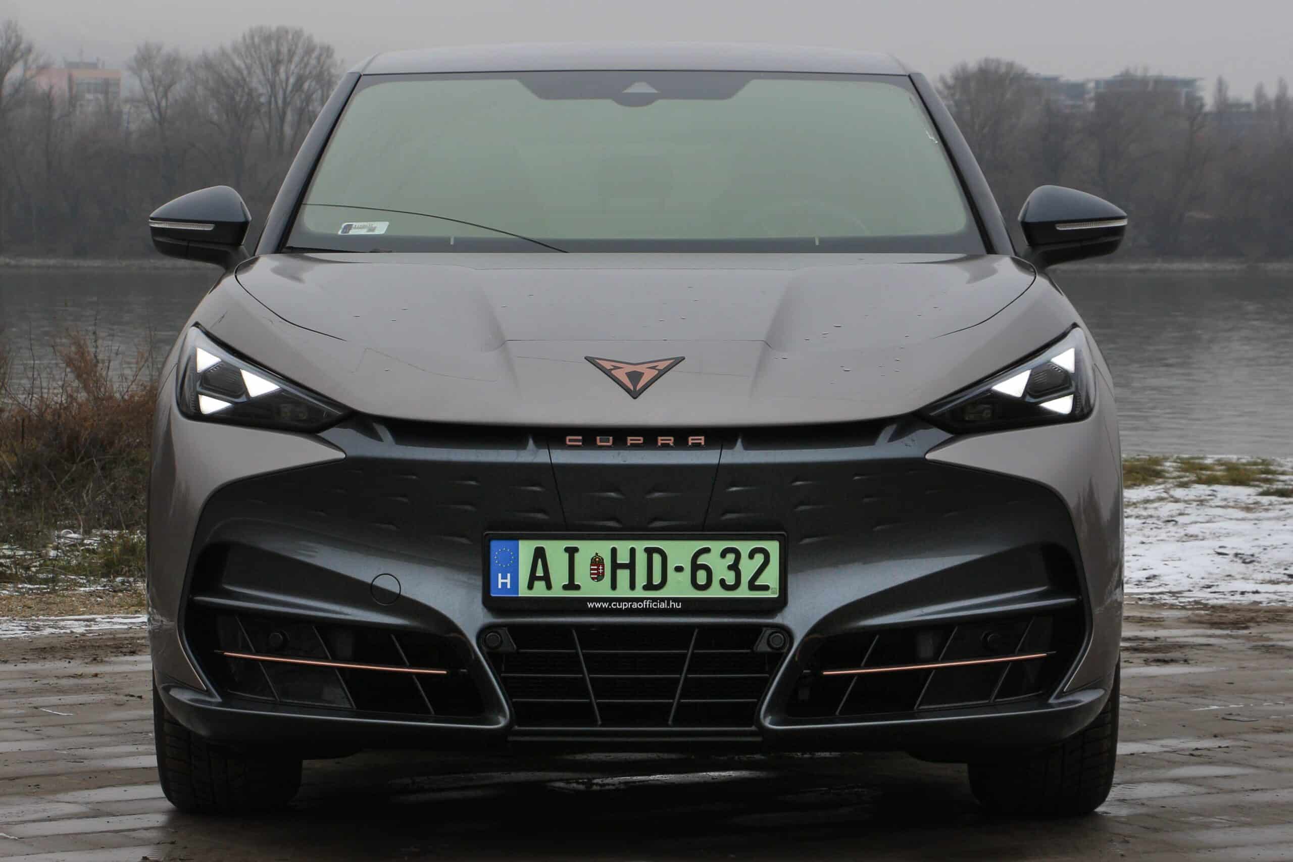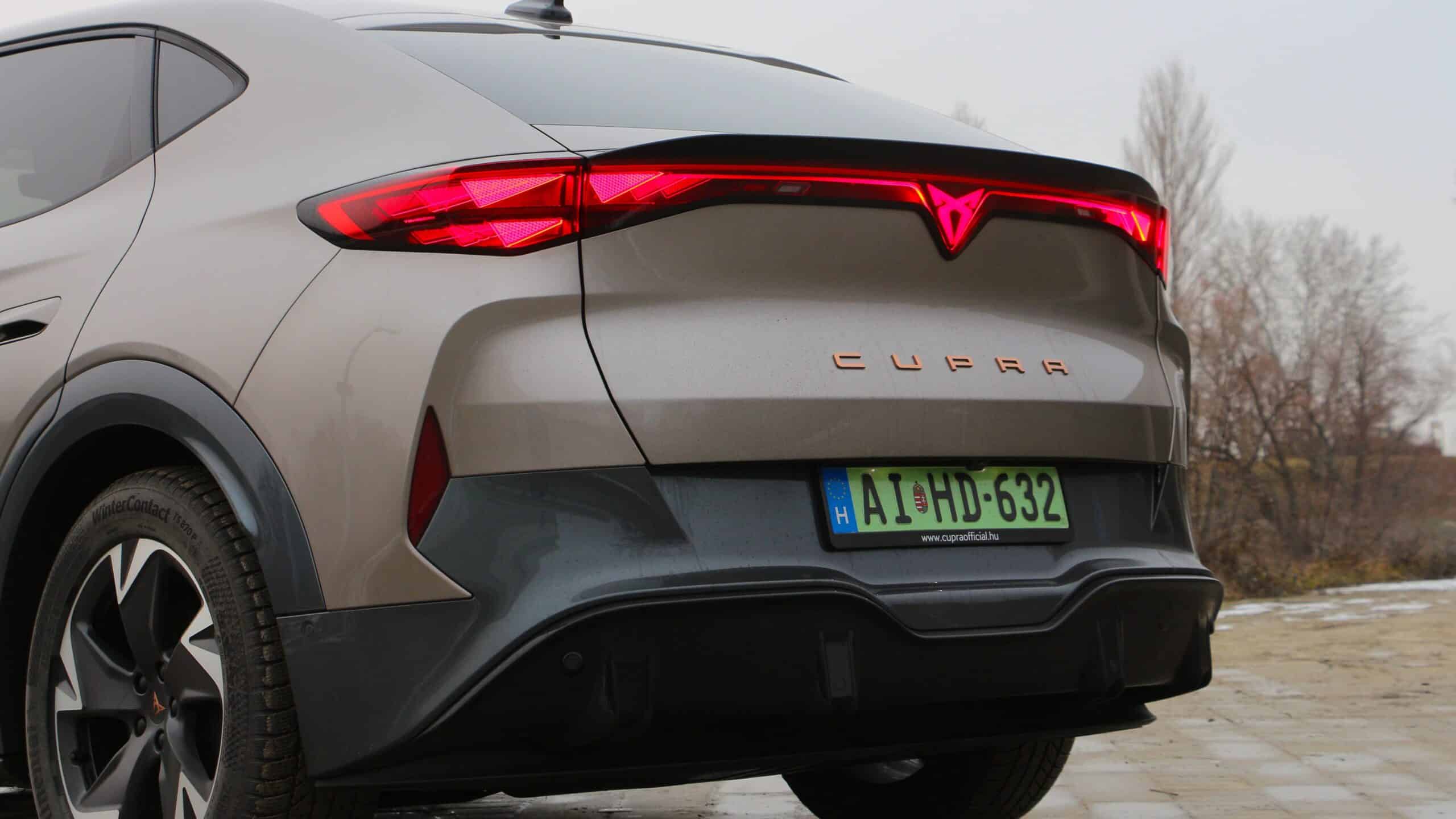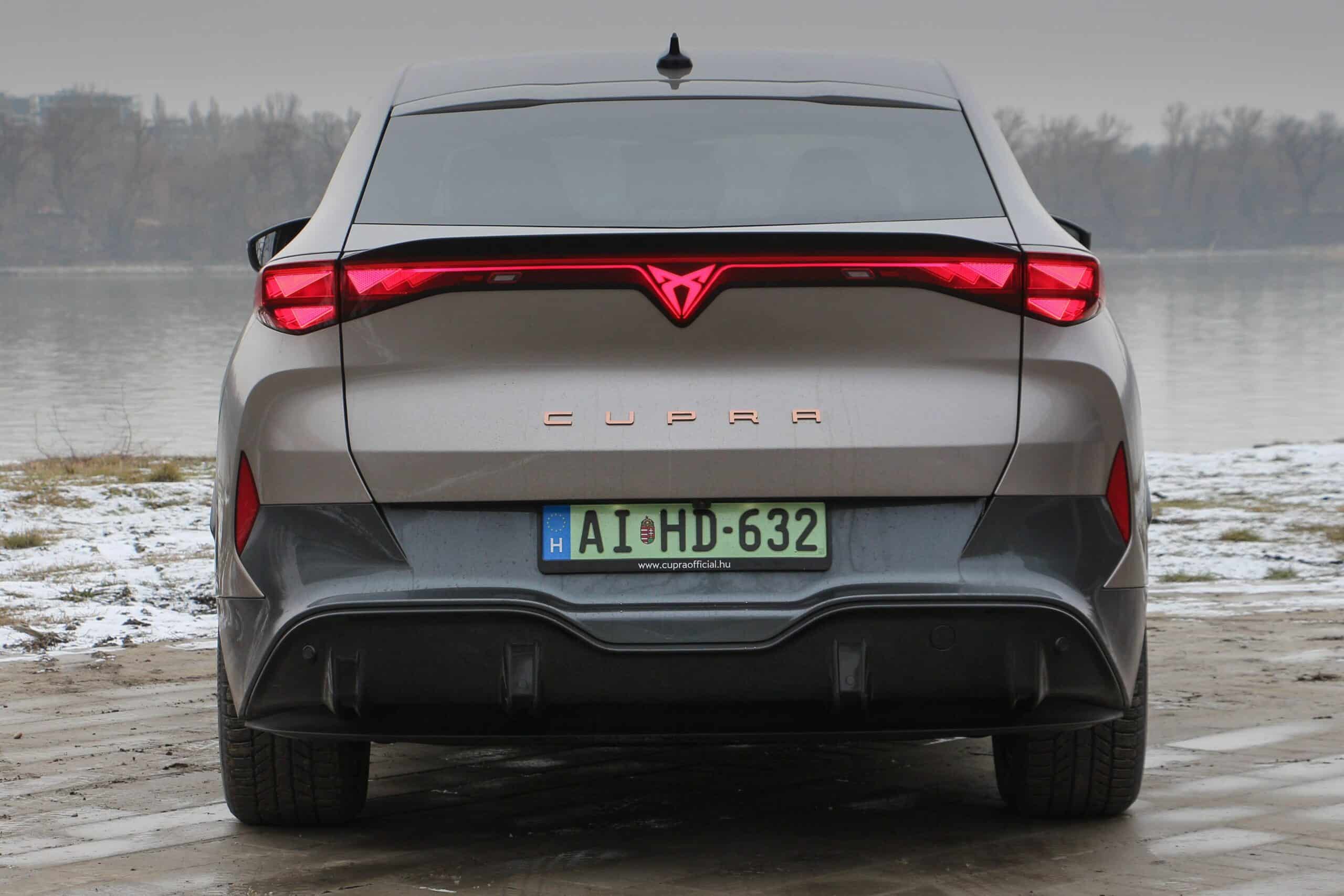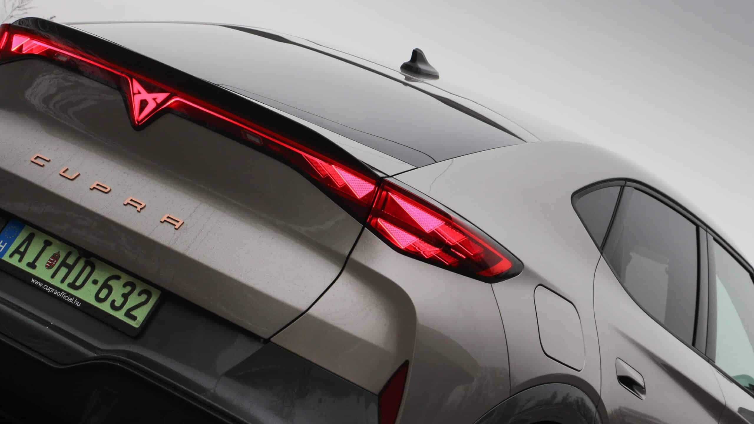 A csúszás miatt a Tavascan így a legtöbb piacon elsőből utolsó lett, legalábbis ami a formatervét illeti. A Cupra ugyanis az első villany-SUV-ján keresztül prezentálta az új formanyelvét, amely a cápaorr frontrészt, a háromszögekből álló nappali menetfényt, és a ma már védjegyüknek számító hátsó világítótestek elrendezését illeti. Persze, nem lehet összetéveszteni a többi Cuprával, főleg éjszaka, hiszen továbbra is a Tavascan az egyetlen, amelyen az első embléma is fényárban úszik, sőt, alatta a márka nevét felirat is hirdeti, amely indirekt megvilágítást kap.