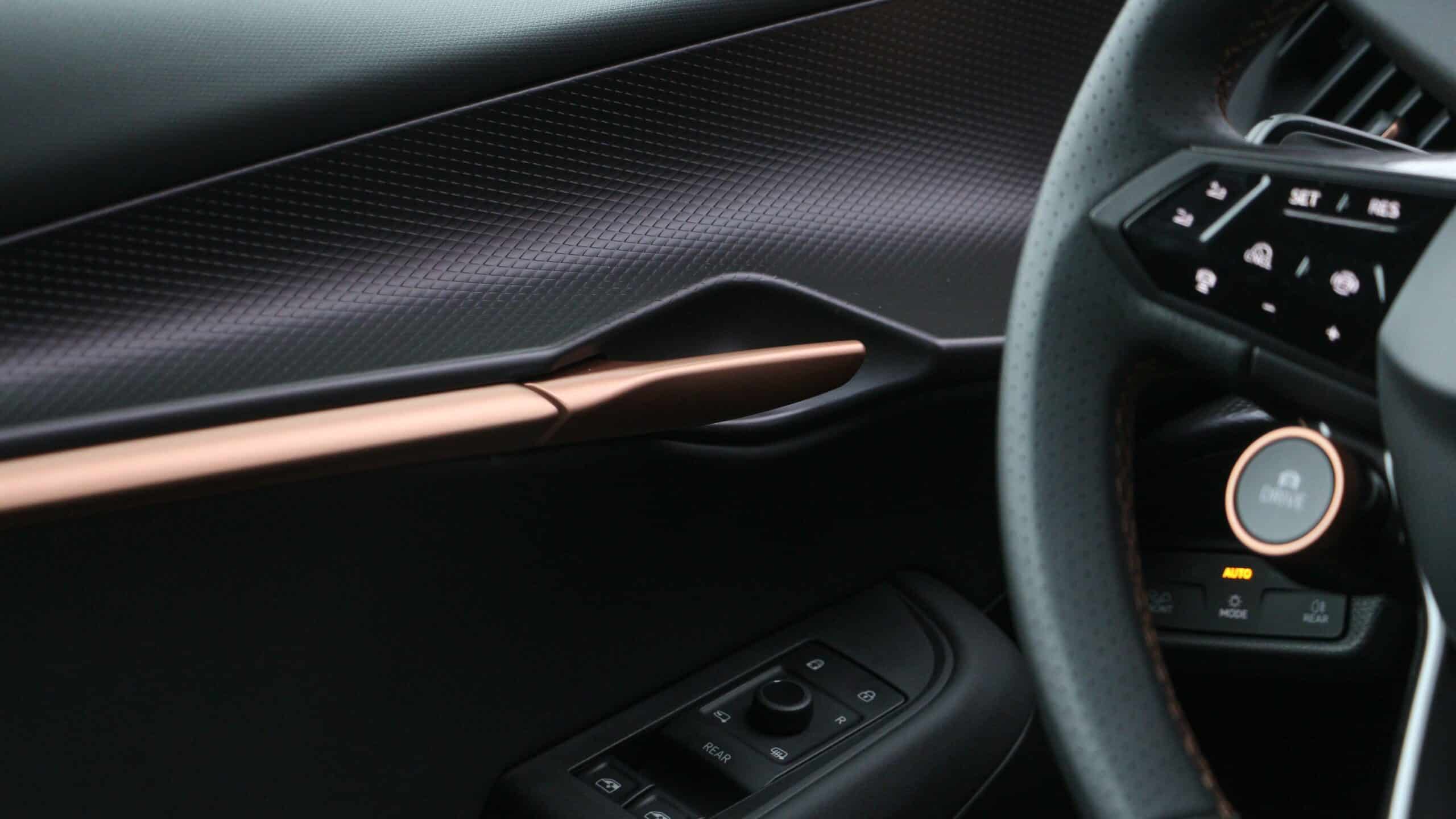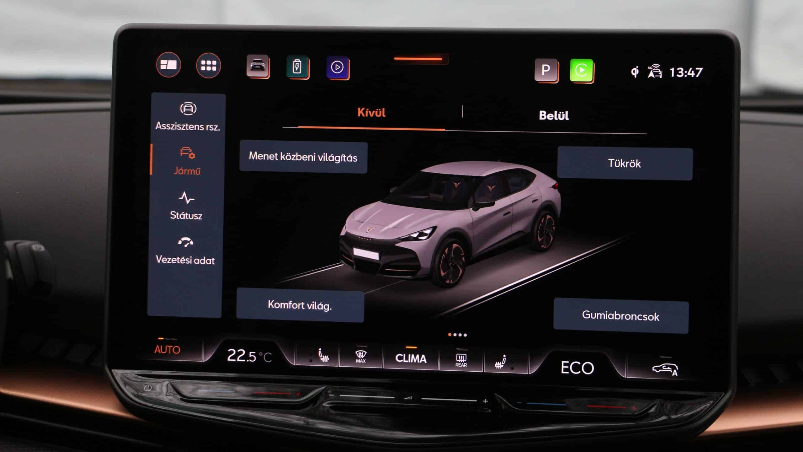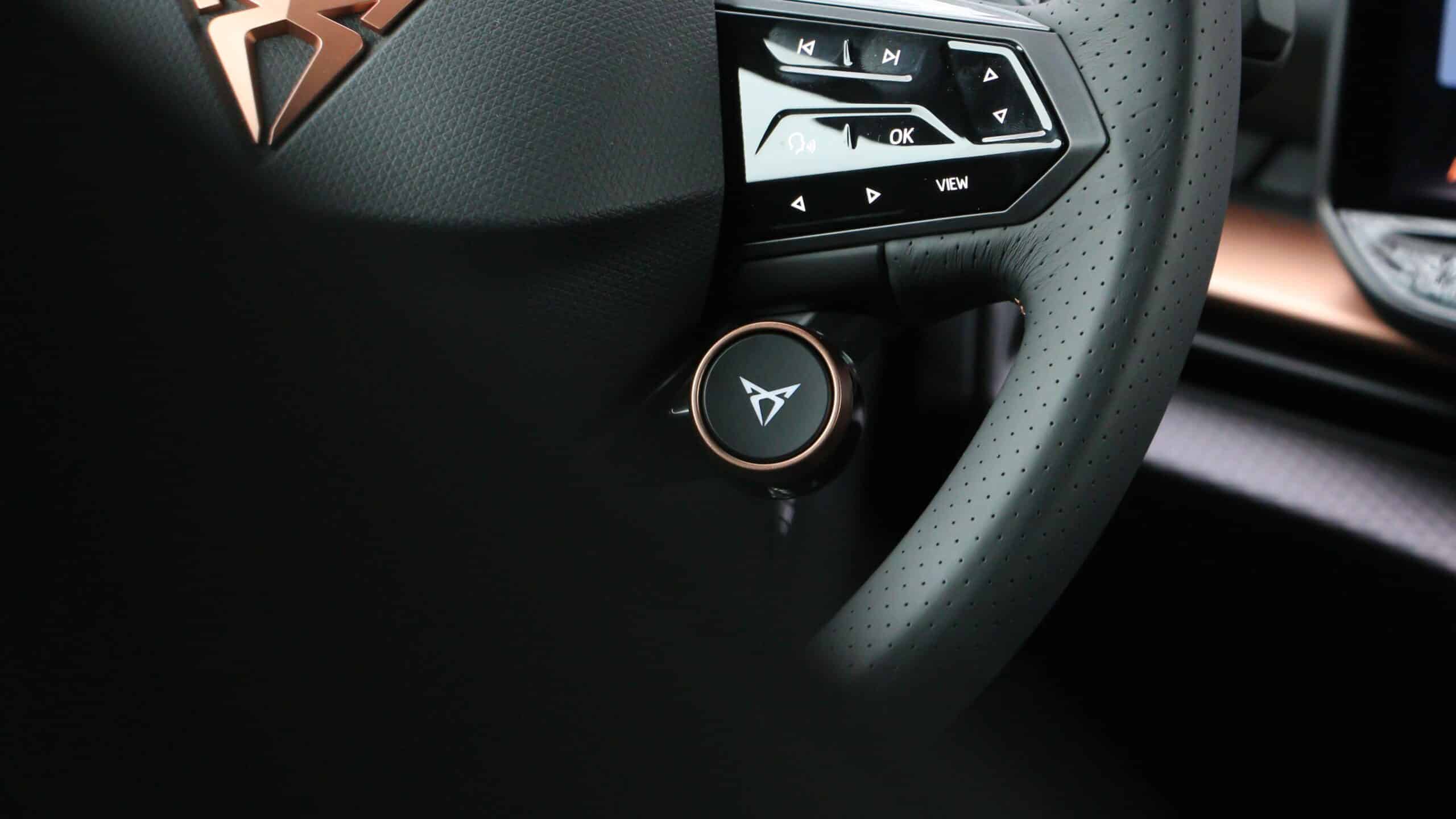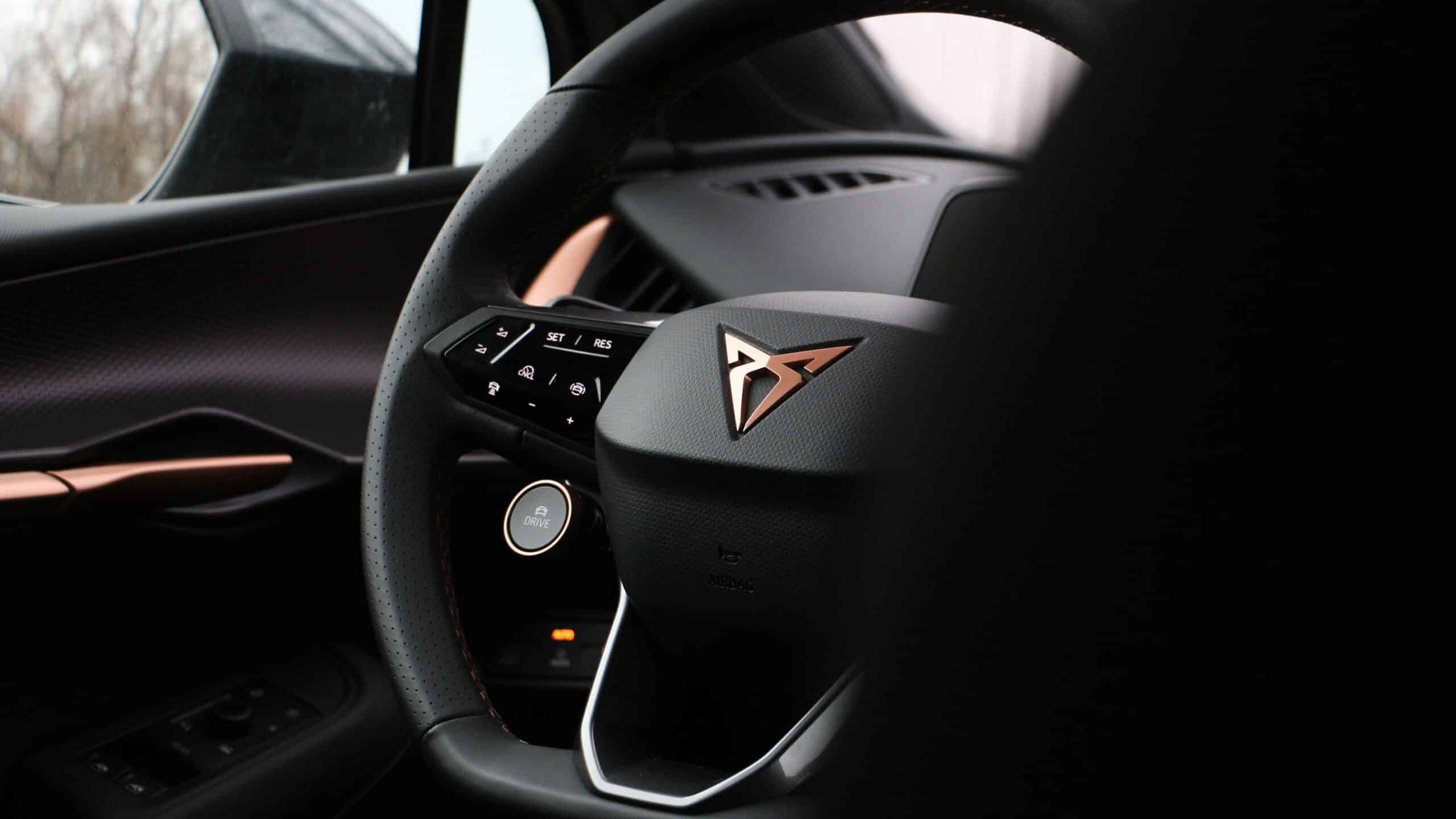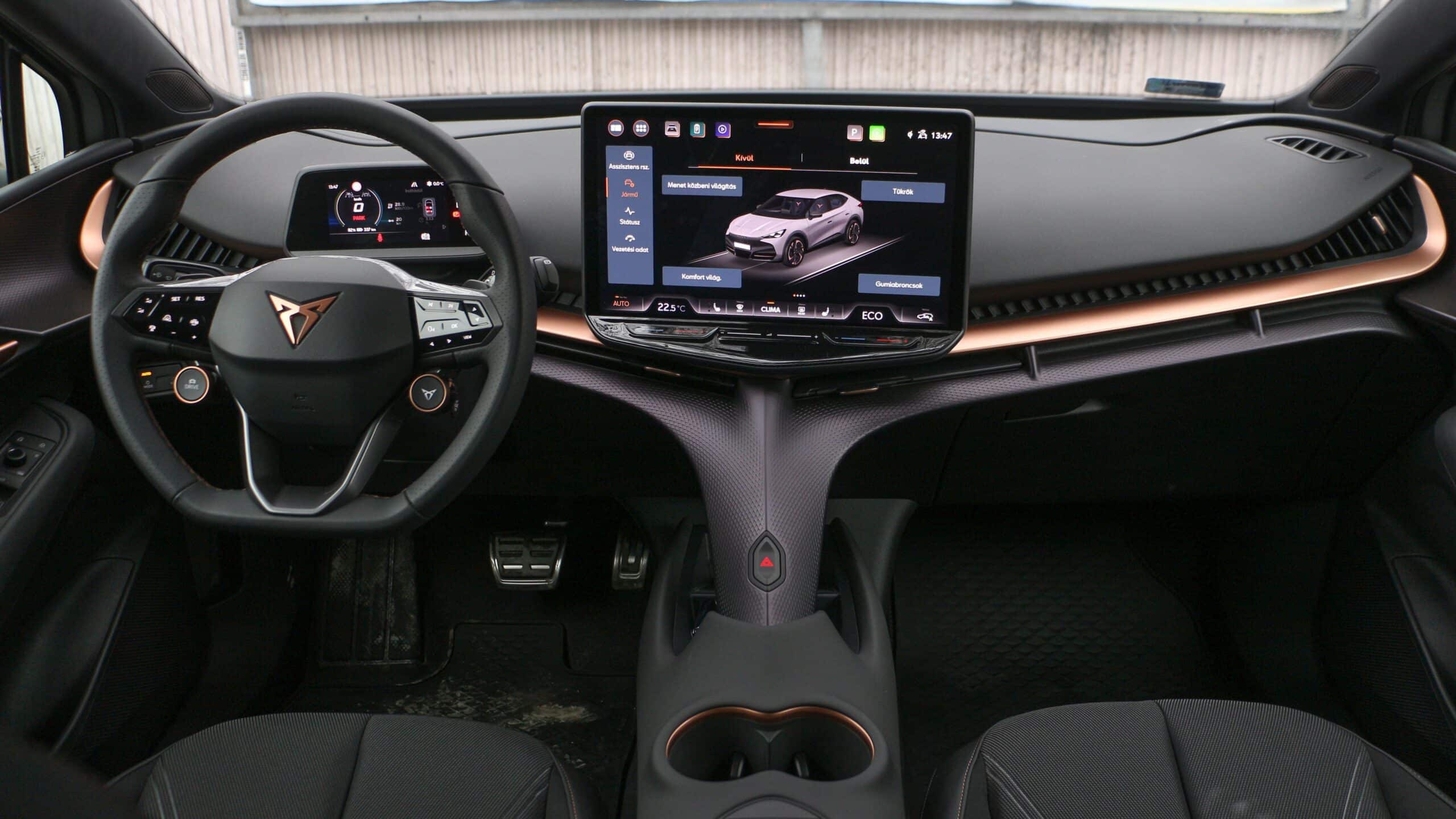 Az összeszerelési minőség kiváló, sehol sem recseg, zörög az utastér, és a villany-SUV is megkapja a Cuprák remek kormánykerekét, amelynek a bőrözése zseniális, ahogy a karimavastagság is. Éppen ezért nagy kár, hogy hiányoznak a rendes nyomógombok, helyette haptikus felület található a kormányon. Viszont a márka védjegyének számító Cupra gomb azért innen sem hiányzik, a másik oldalon pedig az üzemmódválasztó kapott helyet.