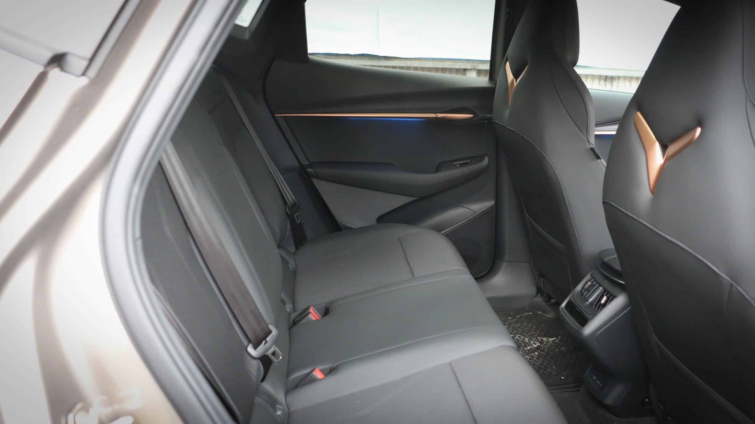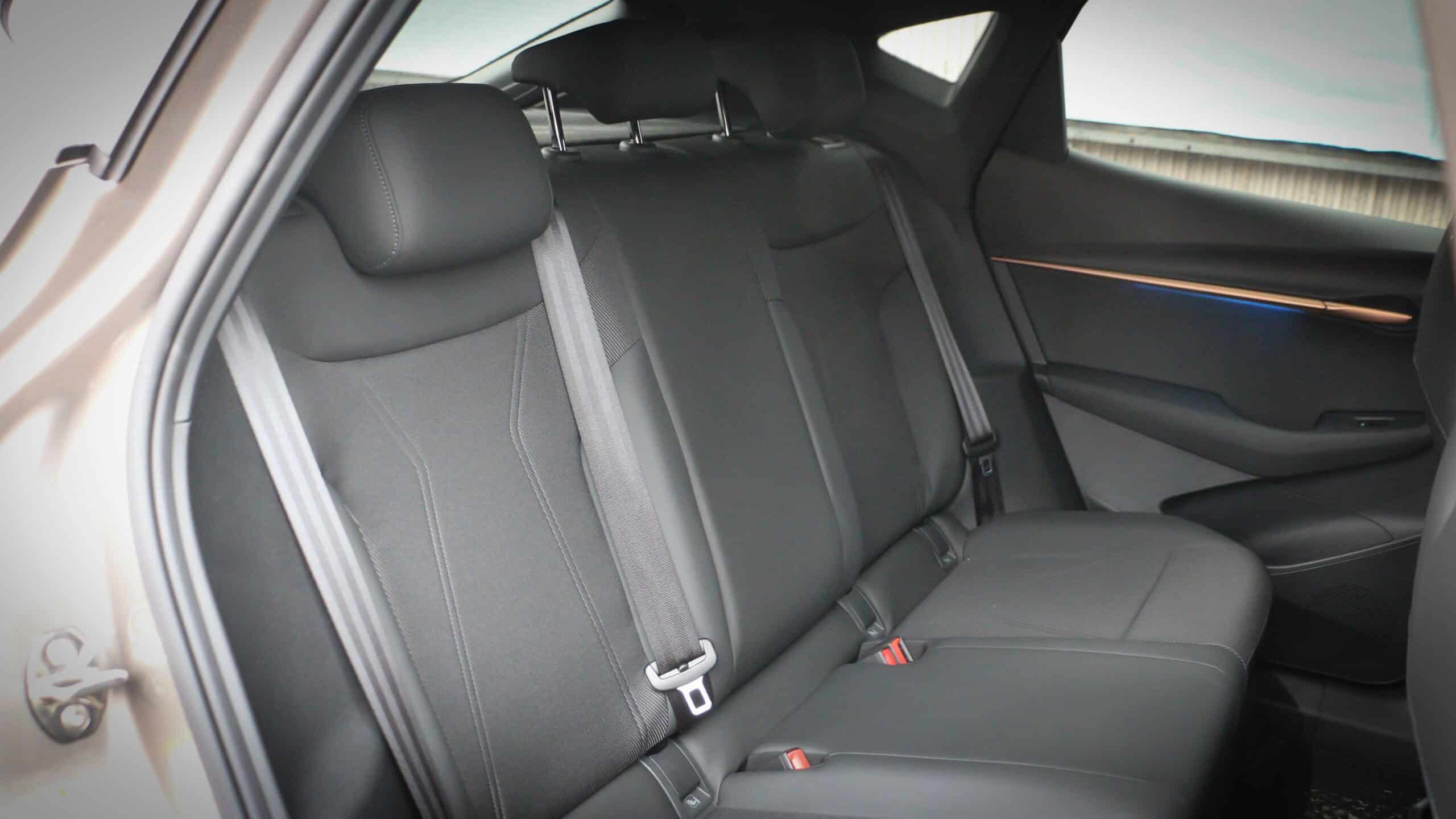 Hátul ugyancsak kényelmesen elférnek az átlagos termetű felnőttek, mivel az első fotelek nem kagylóülések, így a lábtér is nagyvonalúbb, igaz, ez amúgy is bőséges, mivel az autó a MEB platformra épül, vagyis nincs kardánalagút.