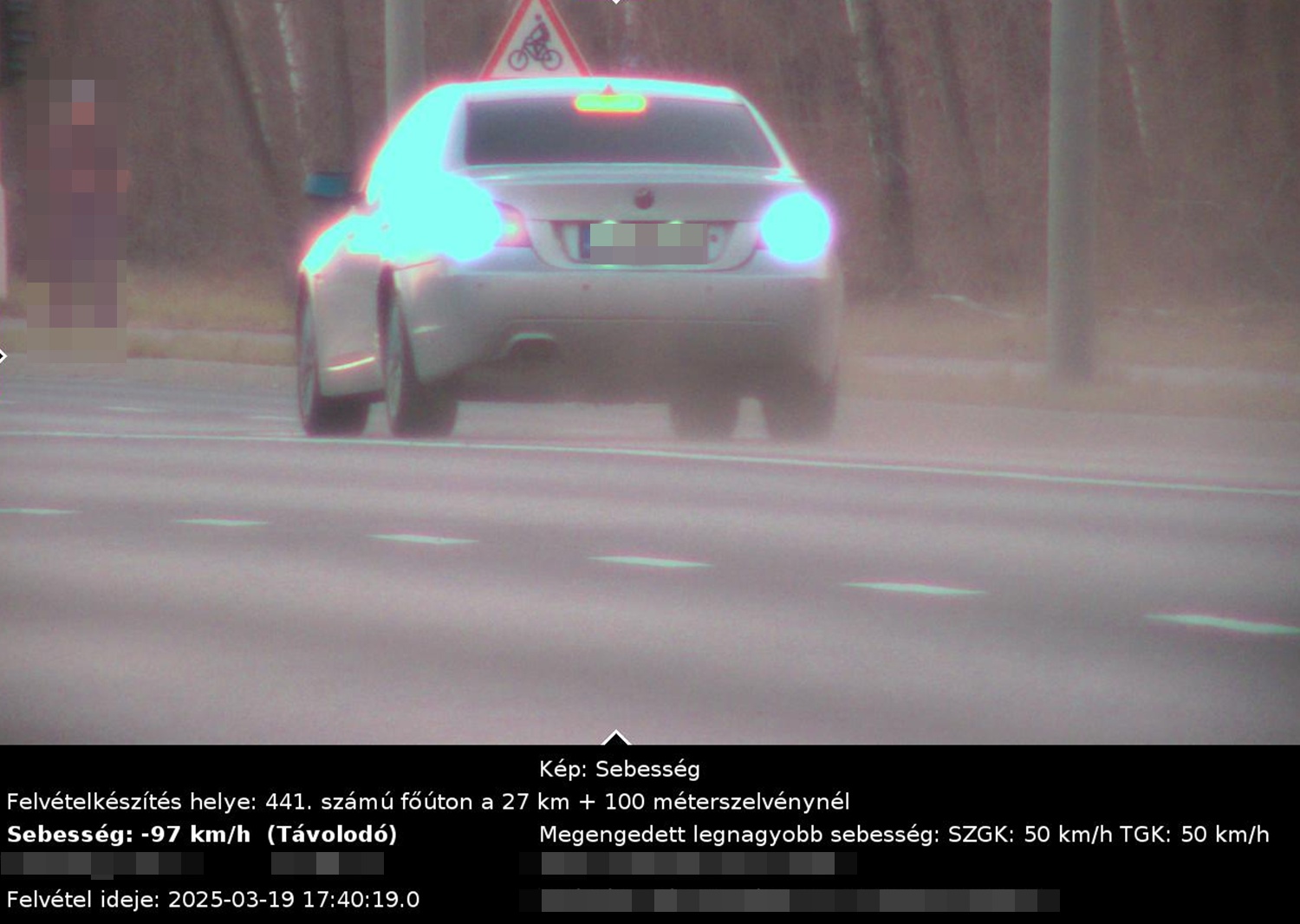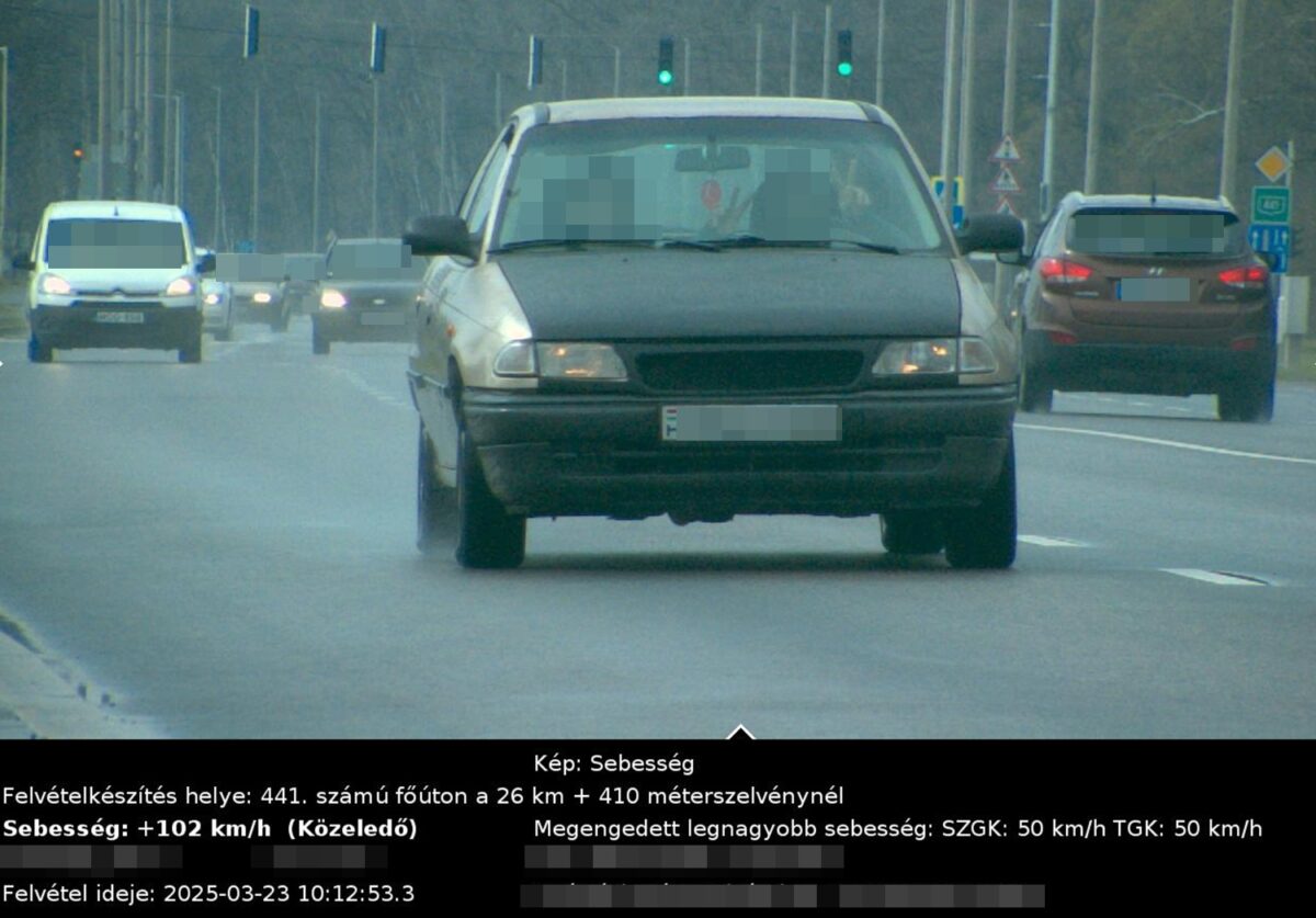 A legtöbb esetben ha traffipaxot lát az ember, kétszer is ellenőrzi a sebességét, hiszen senki sem szeretne "fölöslegesen" 50 ezer forintot fizetni, nem beszélve a legnagyobb kiszabható 468 ezer forintos bírságról. A 441. számú főúton a mérőműszer által készített fotó alapján egy Opel sofőrje nem stresszelt rá az ellenőrzésre, sőt, egyértelmű kézmozdulattal jelezte, kiszúrta az út szélére kihelyezett traffit. Az egyetlen probléma, hogy az említett szakaszon 50 km/órás korlátozás van érvényben, a járművezető viszont 102 km/órával haladt el az eszköz előtt. Ezt a mutatványt a Police.hu tájékoztatása szerint 140 ezer forintja bánja.