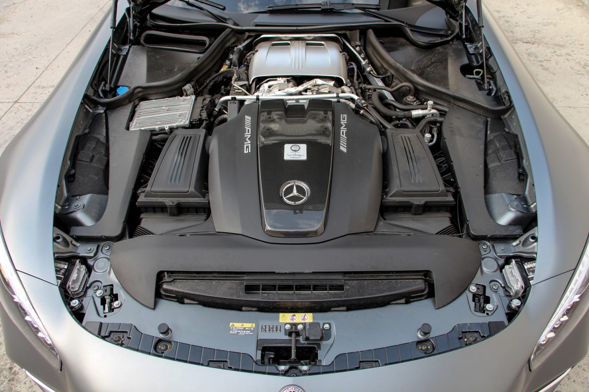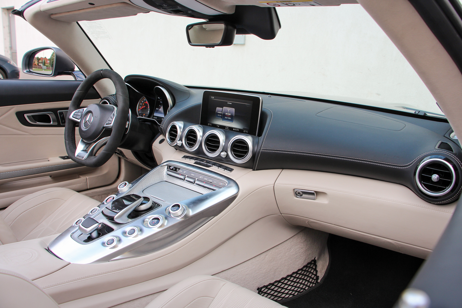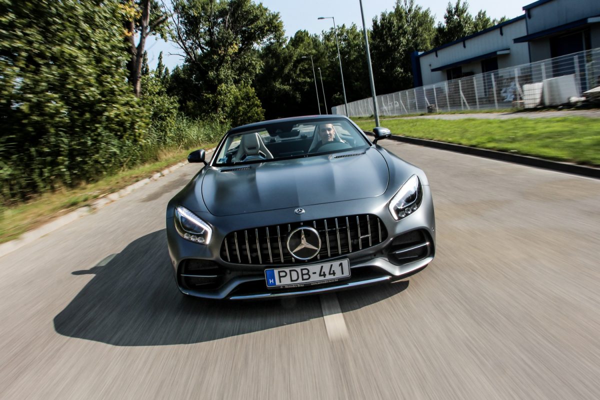 Erőmű. Gombnyomásra beröffen mind a 8 henger, halványan berántja a karosszériát, és még Comfortban is nagyon hangosan szól, alapjáraton is. A hangszín csodálatos, a Mercedeshez hűen nagyon ércesen szól, pár másodperc után leejti a fordulatszámot az alapjáratra, ahol lüktetve dörmög tovább és rezegteti a talajt is. A kipufogó szintén a GT R-é, és gombnyomásra is hangosíthatjuk, ám csak Sport + és Race módban csinálja azt, amitől minden autóőrült elolvad. Mit elolvad?! Megőrül érte és tőle, amikor a kipufogó visszadurrog. De nem úgy, mint a Mini JCW modelljeinél, az AMG GT ezt nem csak mutatóból csinálja, rendesen odadörrent váltáskor és gázelvételkor is, utóbbinál sortűz hangját utánozza, és legalább olyan hangerővel, mint mikor lőnek. Garantáltan felkeltjük a környék érdeklődését, de a legjobb, hogy a nyitott tető jóvoltából ezt bent is ugyanannyira hallani, nem úgy, mint például a V12-es 7-esnél.
