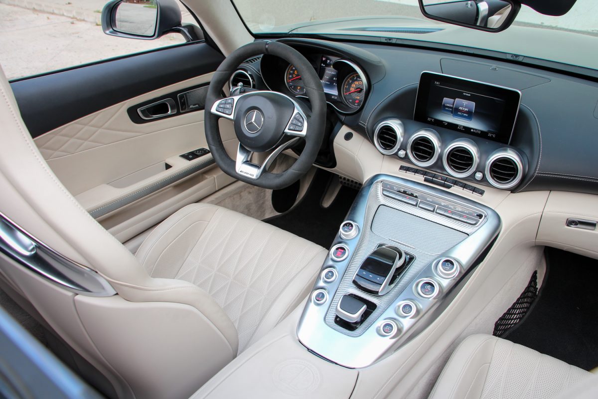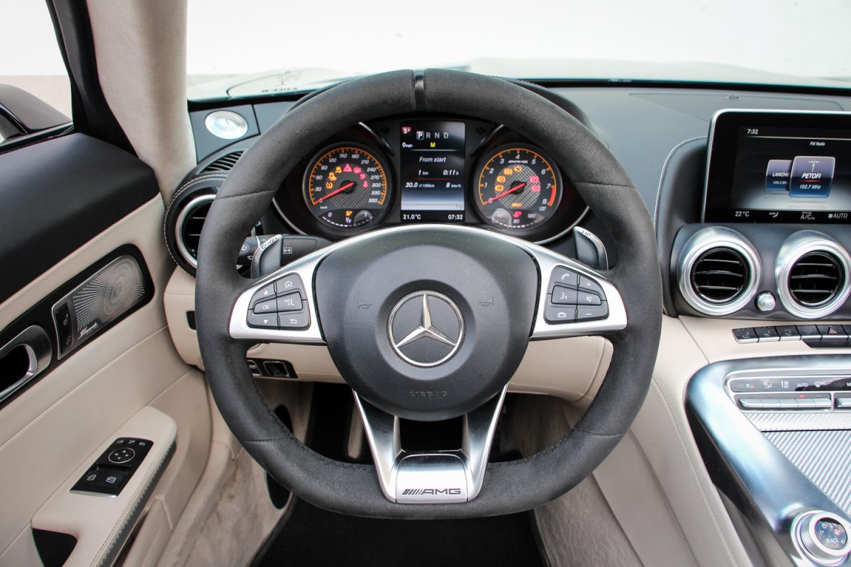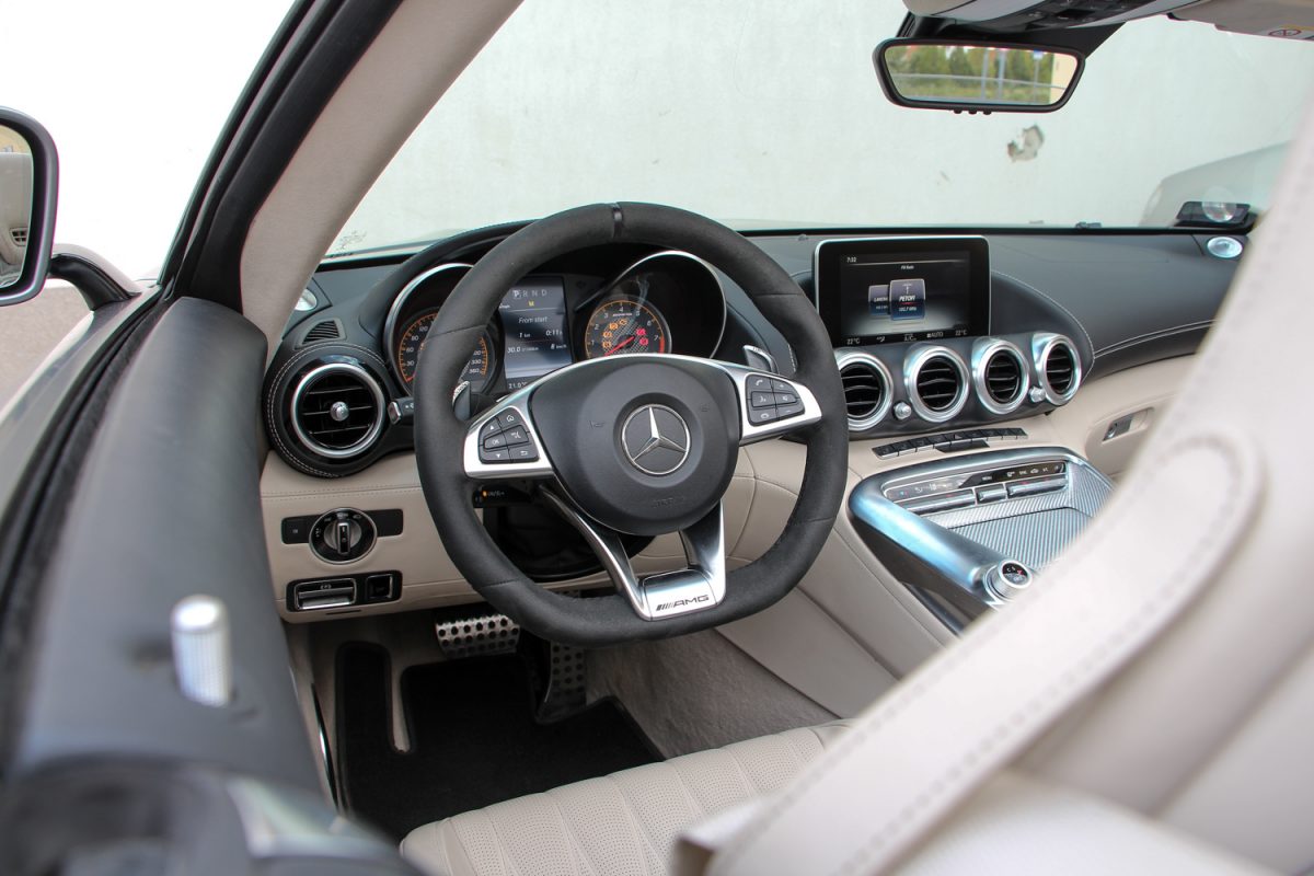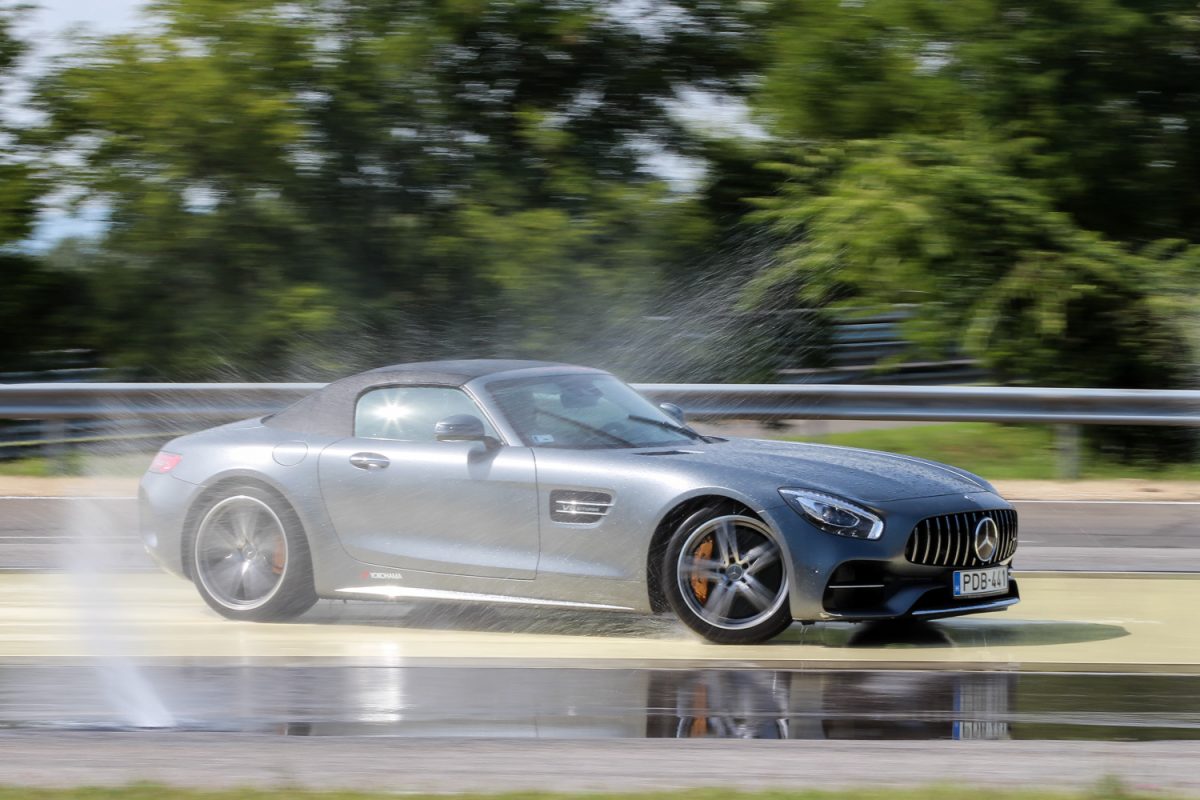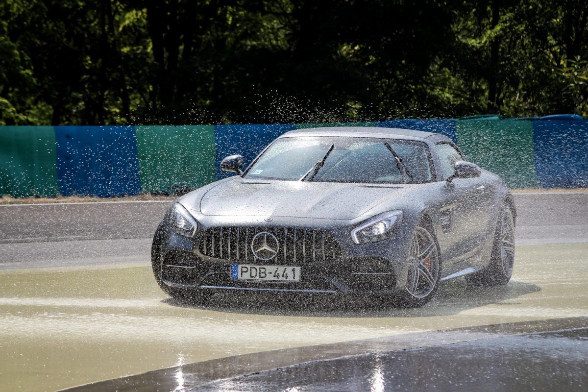 Kesztyű illik az Alcantara kormányhoz, ami rendkívül élénk és mindenről ad visszajelzést, precízen és könnyedén táncoltathatjuk az AMG GT-t, a tanpályán szinte lépésben rajzolgattunk vele
