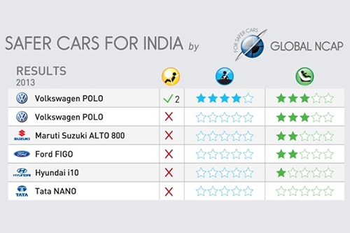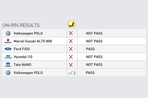 A miniautók, azaz a Suzuki-Maruti Alto 800, a Tata Nano és a (természetesen előző generációs, nem pedig a hazai piacra tavaly év végén érkezett) Hyundai i10 karosszériája olyan gyengének bizonyult, hogy azok a teszt szerint még légzsákkal felszerelve sem tudnának elfogadható védelmet nyújtani. A Ford Figo és a Volkswagen Polo viszonylag stabilnak mutatkozott, ám a kormányt lefejelő sofőr a Figóban sem élte volna túl az ütközést. Hasonló mondható el a VW Polo esetében is, ám ott még túlzott mellkasi terhelést is eredményezett a légzsák hiánya. Erre válaszul a Volkswagen alapfelszereléssé tette az indiai Polókban is az elülső légzsákokat, így rögtön 4 csillagos, Indiában bizonyára a legbiztonságosabb kisautó lett a Polo.