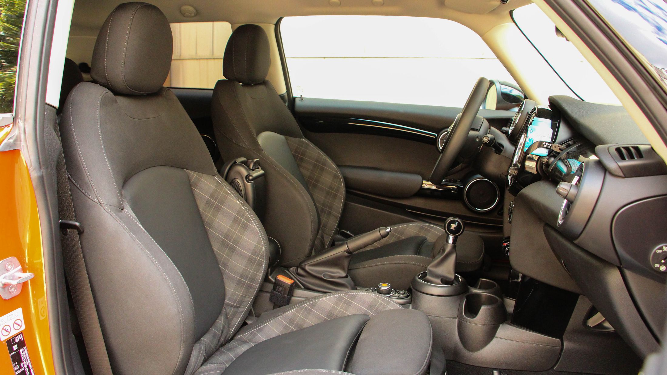 A versenyautós érzés a mély ülésekbe huppanva is előjön, amelyeket kihúzható combtámasszal is felvérteztek. Elöl az igazi kagylóülésekhez hasonlóan, szorosan tartják a testet a fotelek, ami kimondottan jól jön a tempós kanyarokban. Aki hátul szeretne ülni, avagy kénytelen ott helyet foglalni, jobb, ha előtte nyújt néhány percet, mert elég nehézkes bekászálódni és amikor sikerül, akkor is a saját fülcimpájukat csapkodja majd a magasabb felnőttek térde. Szóval inkább a gyerekek és az alacsonyabb termetűek számára lehet megfelelő a három pohártartóval is kecsegtető hátsó sor. Ugyanakkor már létezik ötajtós változatban is azok számára, akik nem akarnak lemondani a vidám formáról, de családi autónak szeretnék használni a Minit. A csomagtértől nem szabad sokat várni, alaphelyzetben csupán 211 literes, de a hátsó üléseket lehajtva egészen használható 731 liternyi tér áll rendelkezésre.