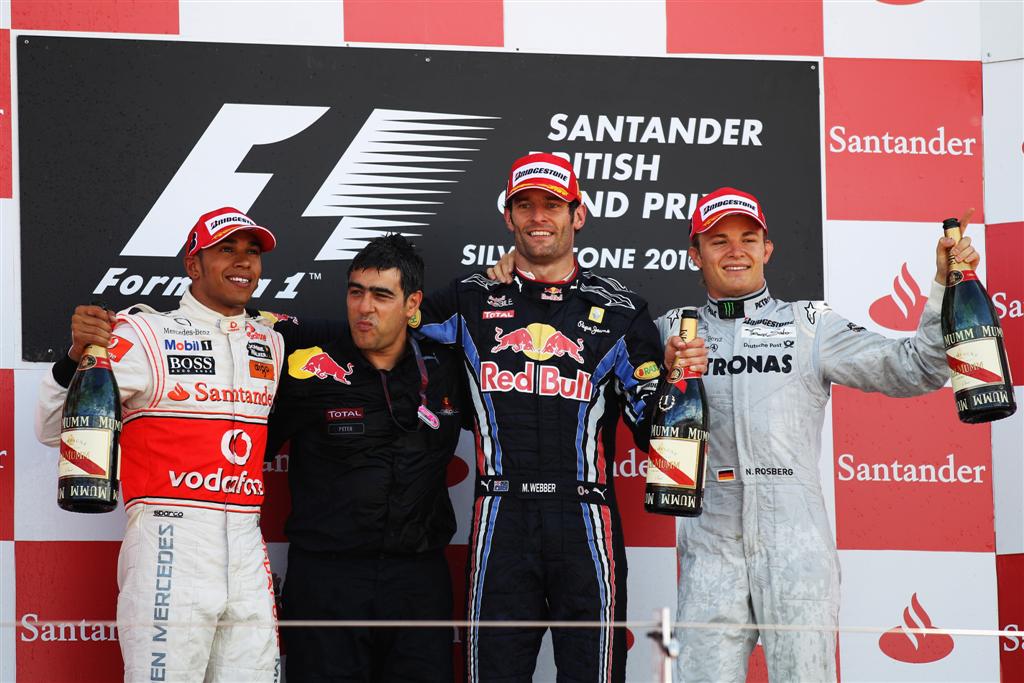 A Brit Nagydíj dobogója: Webber (középen) Hamilton és Rosberg